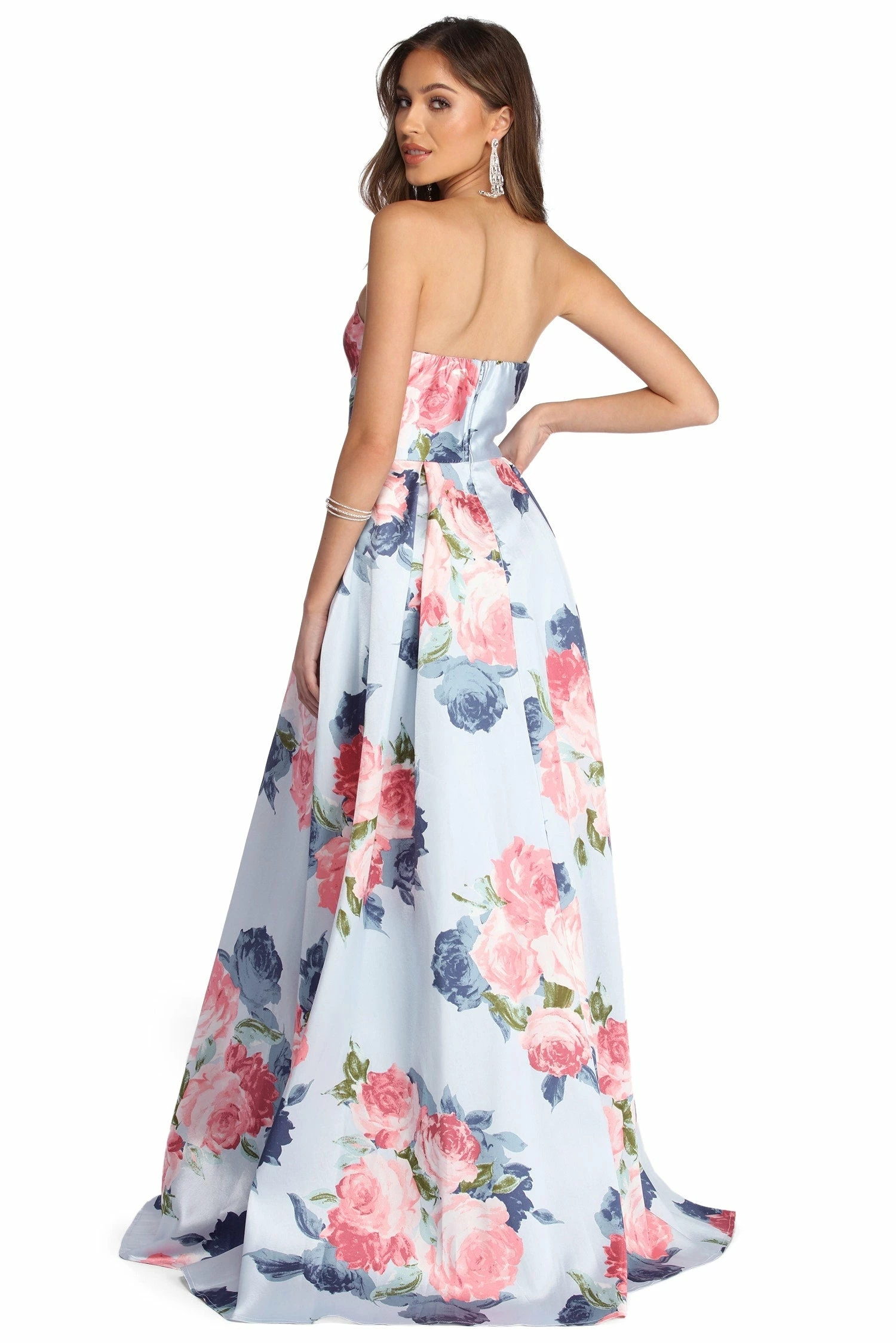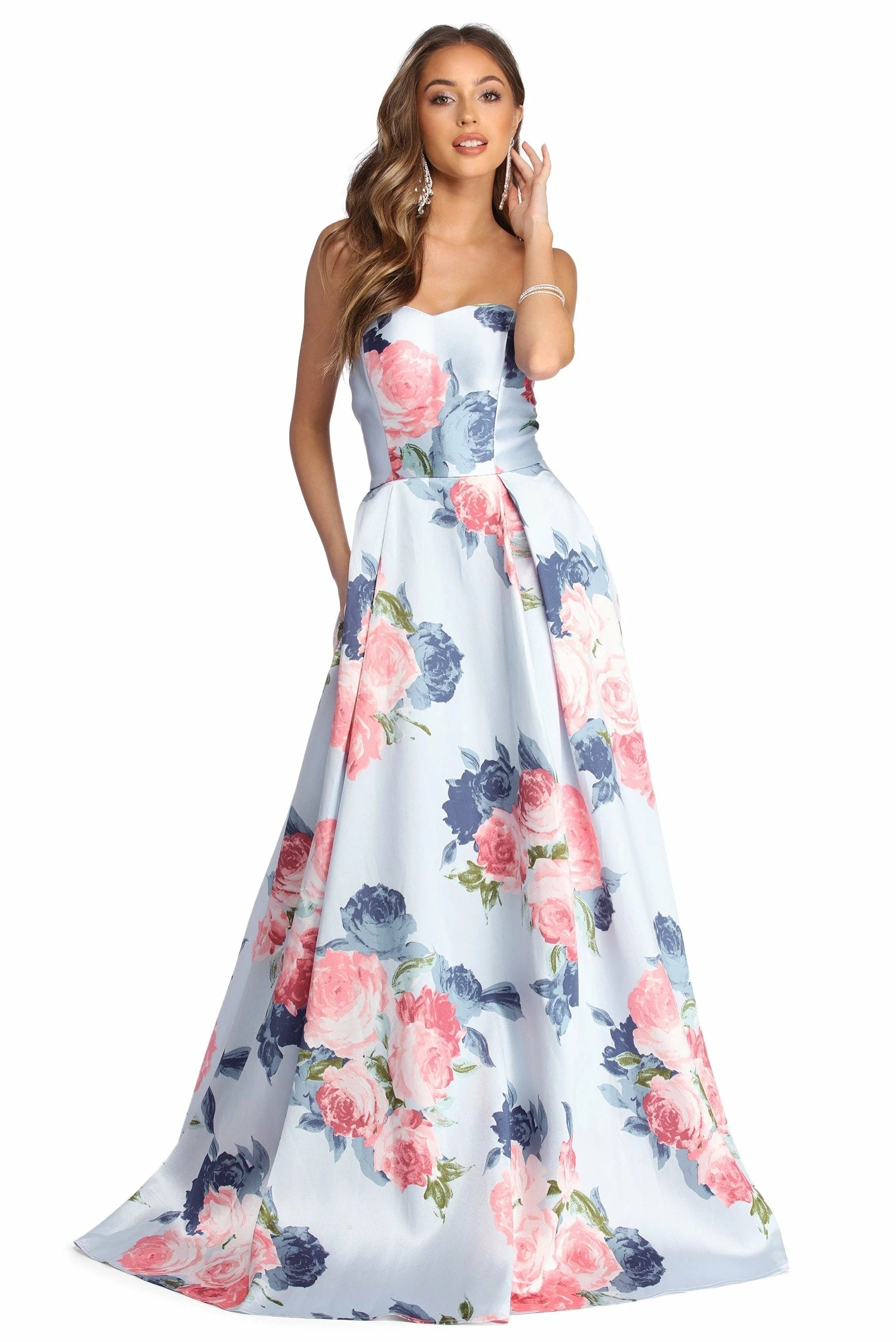 Charm in a floral frenzy in the sweetly inspired Adaline dress! She features a dreamy light blue hue, a sleeveless bodice, a sweetheart neckline, a built in no slip strip, padded cups and princess seams. Her slim fit bodice leads to a pleated ball gown silhouette that is accented with hidden side pockets. She is composed of a satin fabric that features a combination pink and blue hued floral print design. Dress offers a relaxed fit with slight stretch.