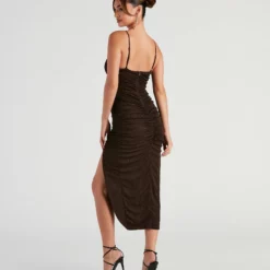 Stunningly timeless, Addison brings an elegant aura to your special moments! She features an off the shoulder neckline, a wrapped sweetheart bust, off the shoulder cap sleeves with ruched detailing and a midi length silhouette with an asymmetrical hem. Dress is composed of a lined crepe fabric that offers a curve hugging fit with a moderate stretch.