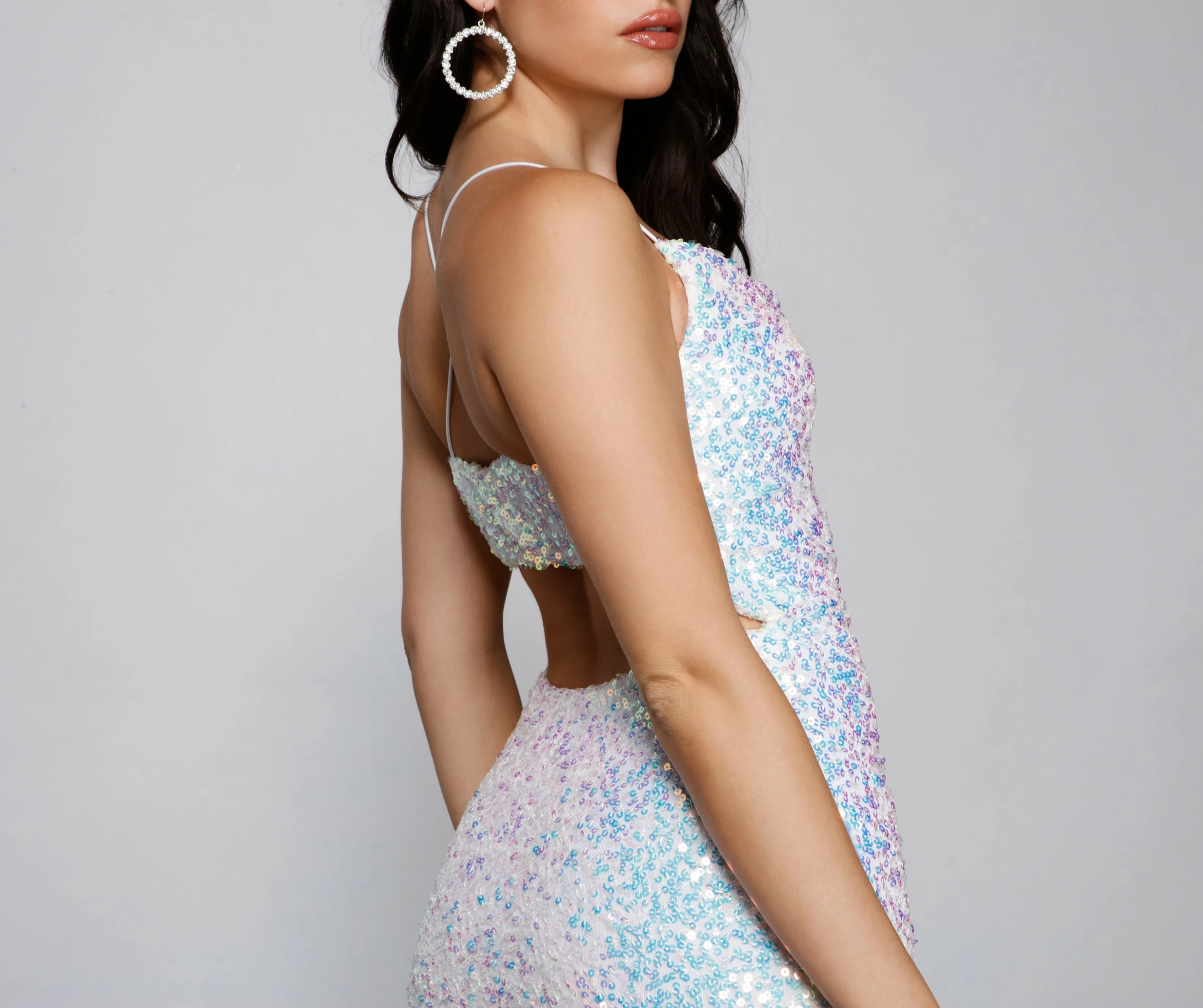 Sparkle for your special event with a dress that radiates luxe glamor! The dress features a sleeveless cowl neckline, sleek bungee-cord straps that cross at the back, an open back accented with a bar strap, sparkling sequins throughout, and a curve-hugging mini-length silhouette. Complete outfit with