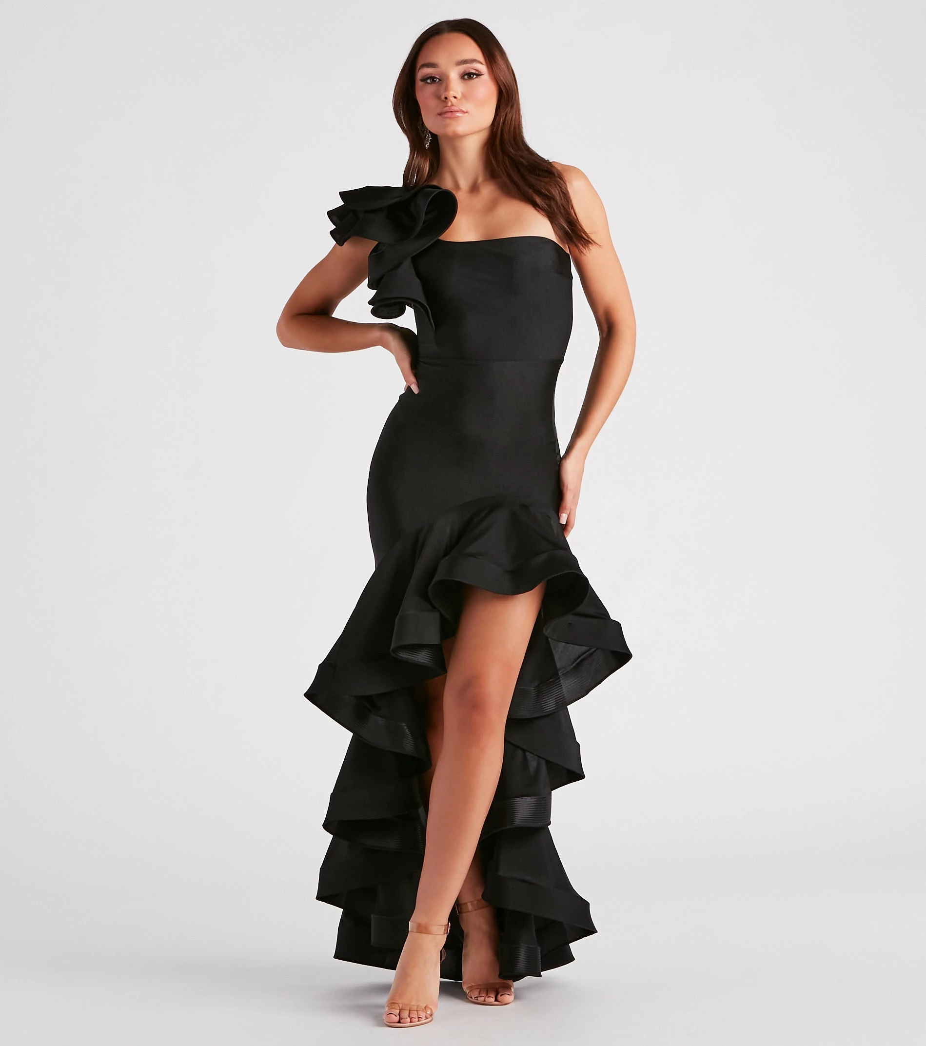 Timeless with an eye-catching twist! The Audrey formal dress is ready to make your acquaintance for banquets, ceremonies, and black-tie events. She features a striking sleeveless one-shoulder neckline, a bonded ruffled design for a structured look, a flattering mermaid silhouette, and a bonded ruffled long hem. The formal dress is composed of a sleek scuba knit fabric with plenty of stretch. Complete the look with a clutch and