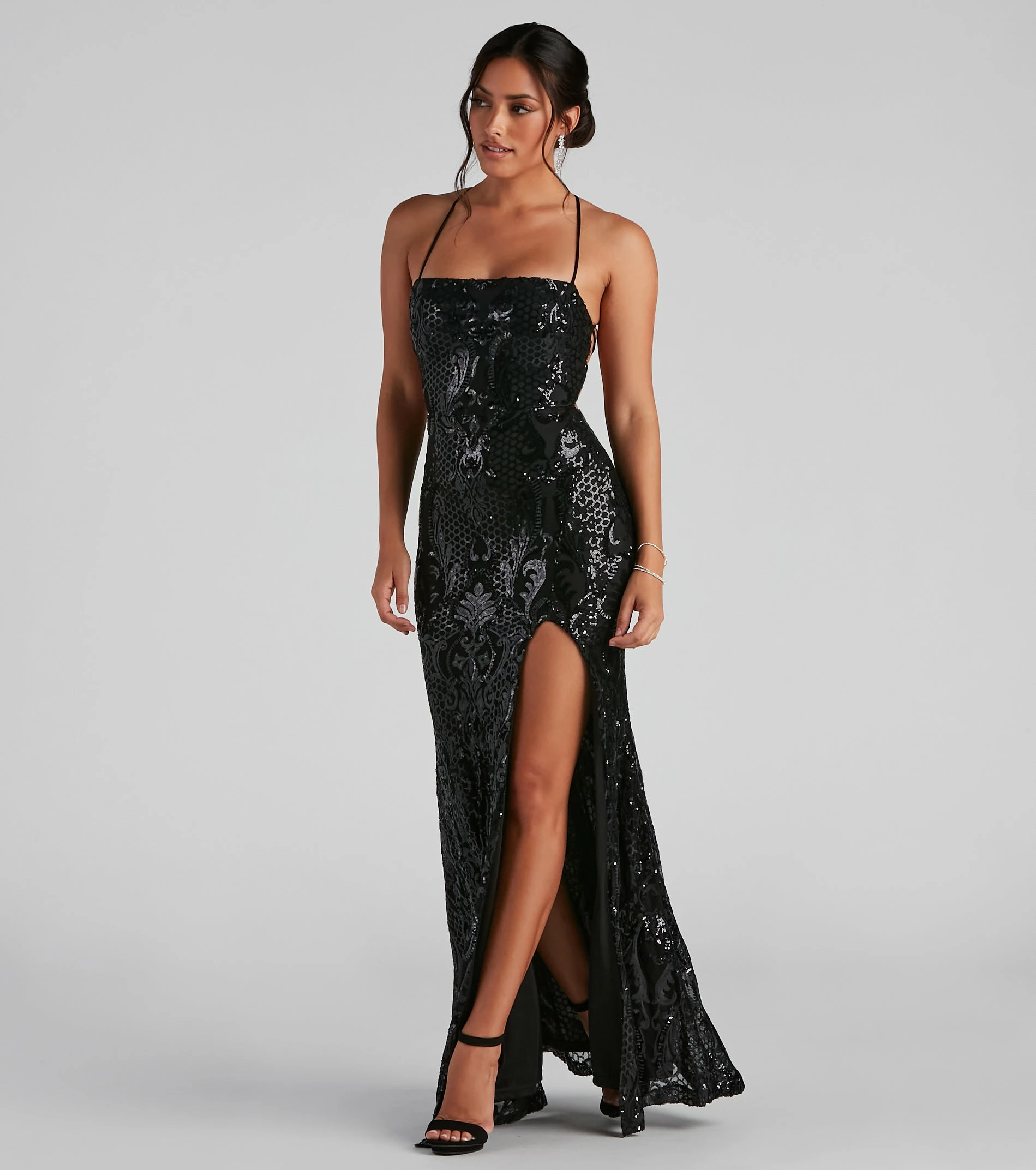 Showcase your show-stopping looks in the gorgeous Azalea sequin dress. She features a sleeveless bodice, spaghetti straps, a trendy square neckline with padding, a no-slip strip, and a backless design with a lace-up accent. Her high waist seam leads to a floor-length, curve-hugging mermaid silhouette with a high slit for a chic factor. The dress is composed of a lined mesh fabric with an all-over intricate sequin design and includes a stretchy knit lining. Complete your outfit with radiant earrings and a