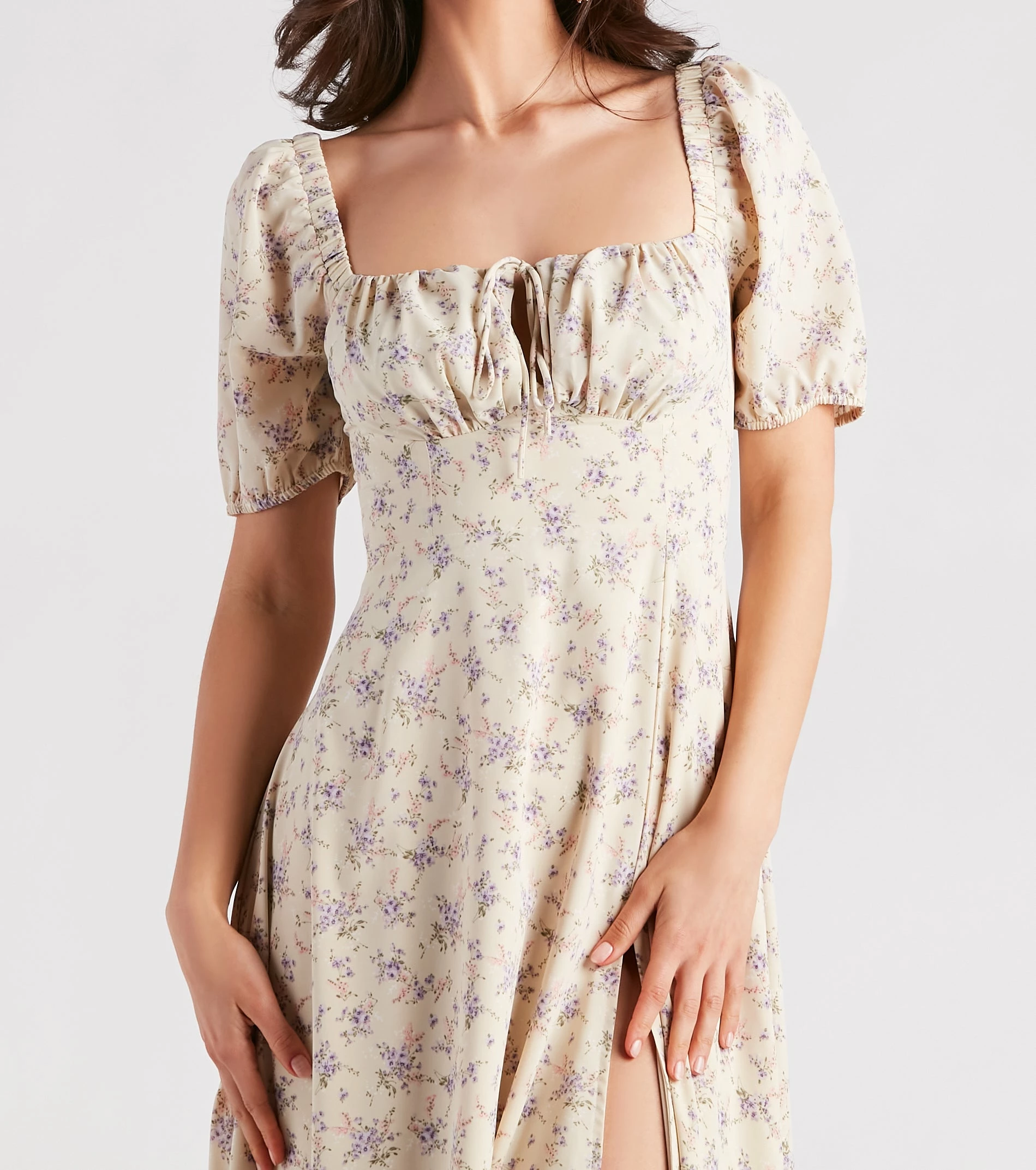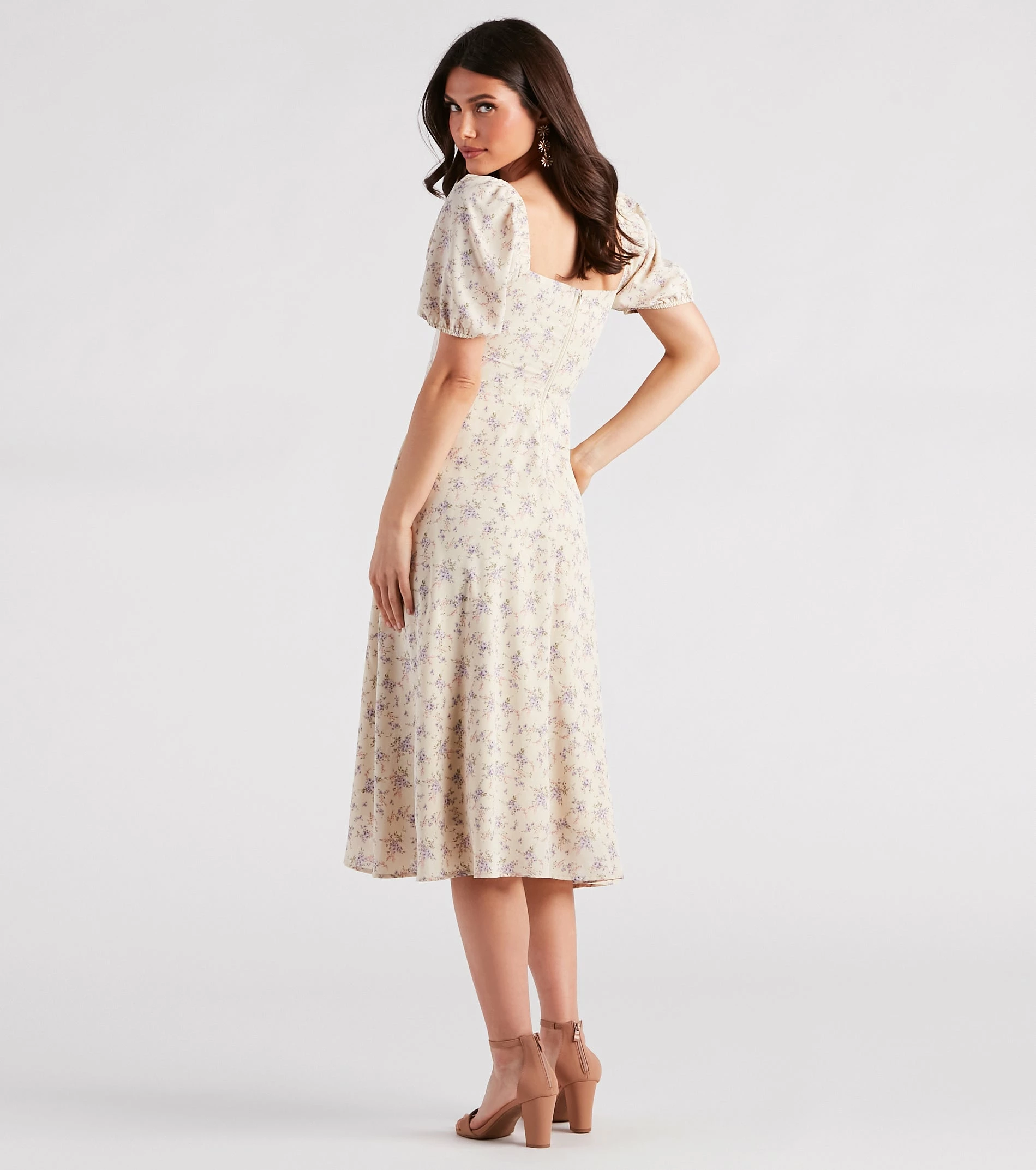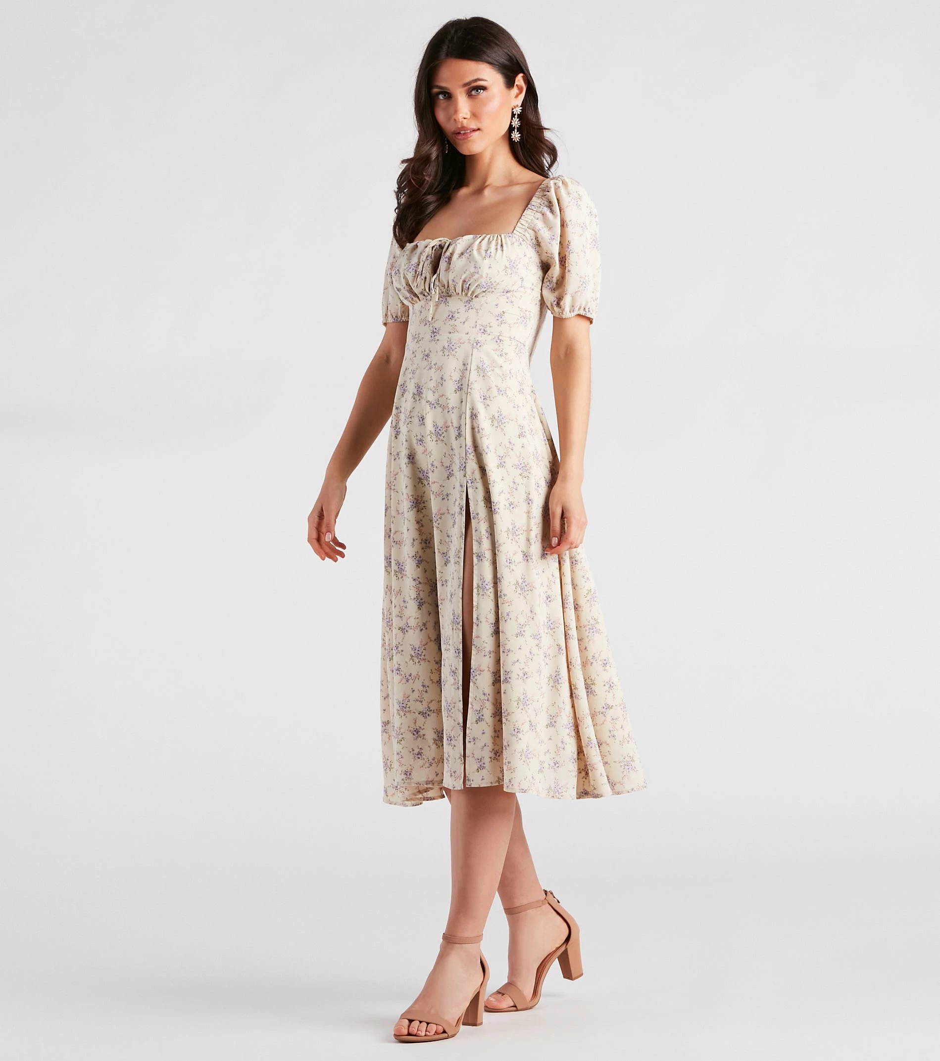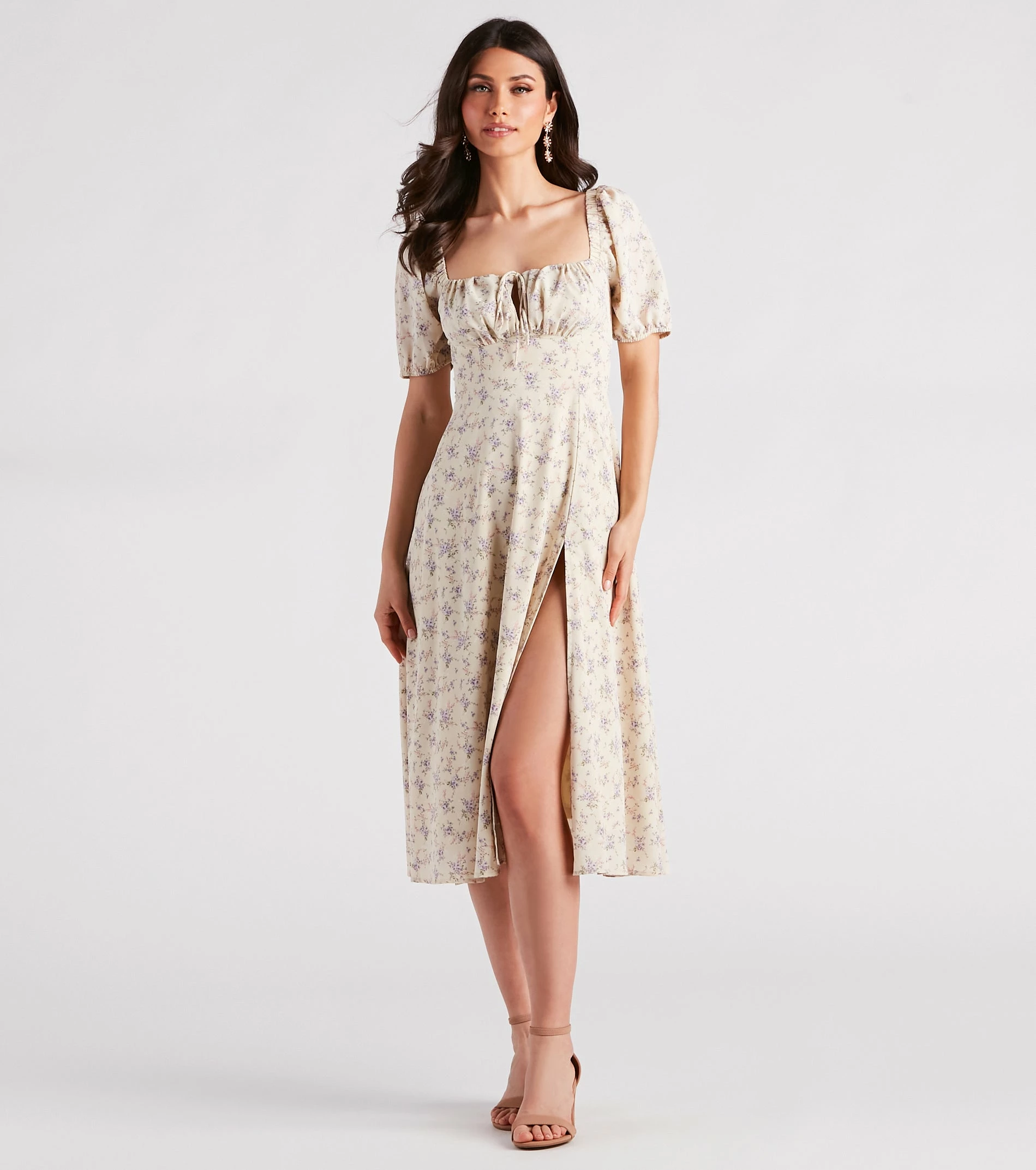 Create an effortless weekend-ready look with this breezy floral printed midi dress. It features a sweetheart neckline, a ruched bust with a tie-front, short puff sleeves, a high waist seam, and a midi-length, A-line silhouette with a chic side slit. Style this dress with cute shades and