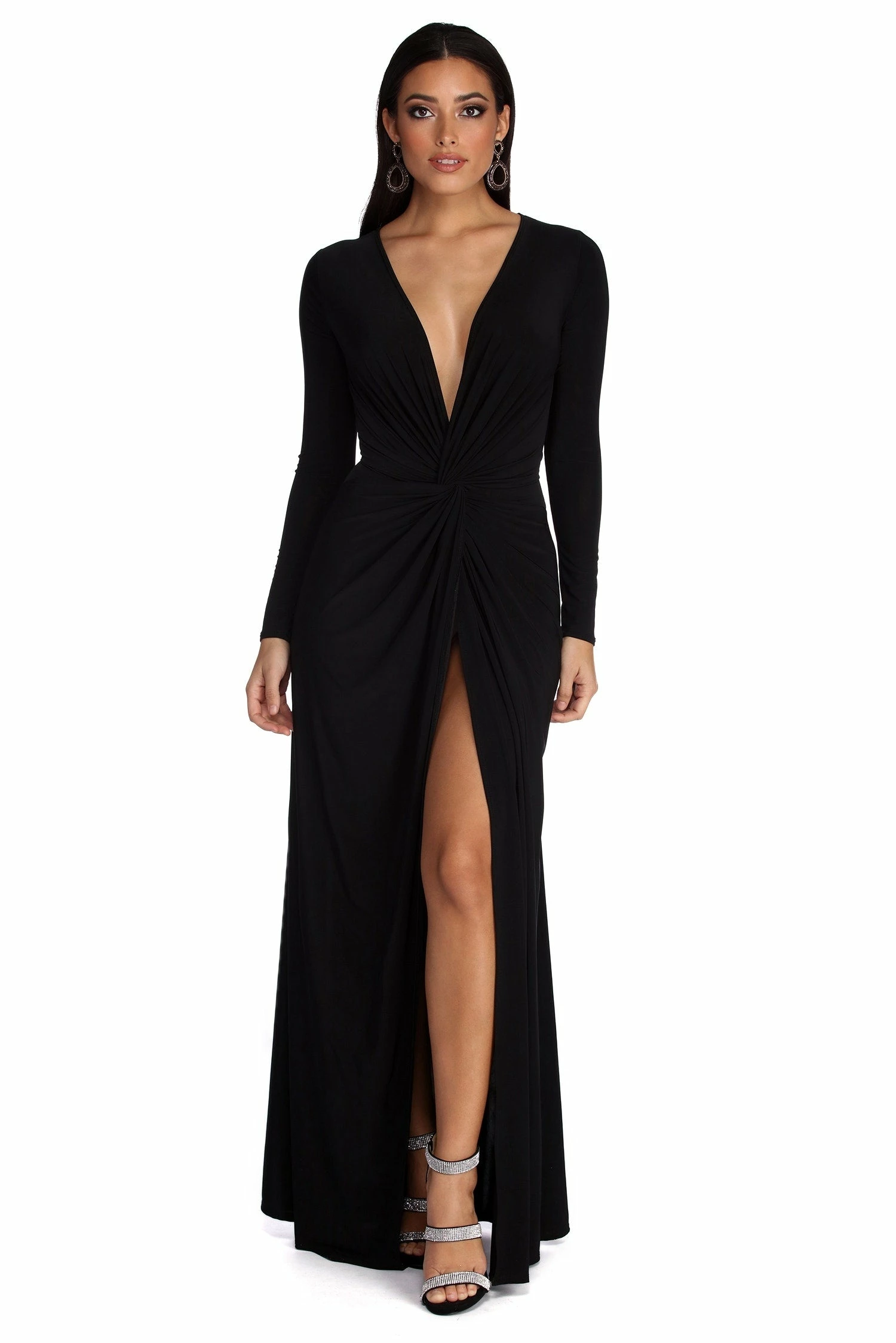 Create a captivating entrance in our Cameron black dress! She features a plunging V neckline with a knotted bodice, fitted long sleeves and a daring high slit to show off your glowing gams! She is composed of a smooth knit fabric that offers a body hugging fit with a moderate stretch.