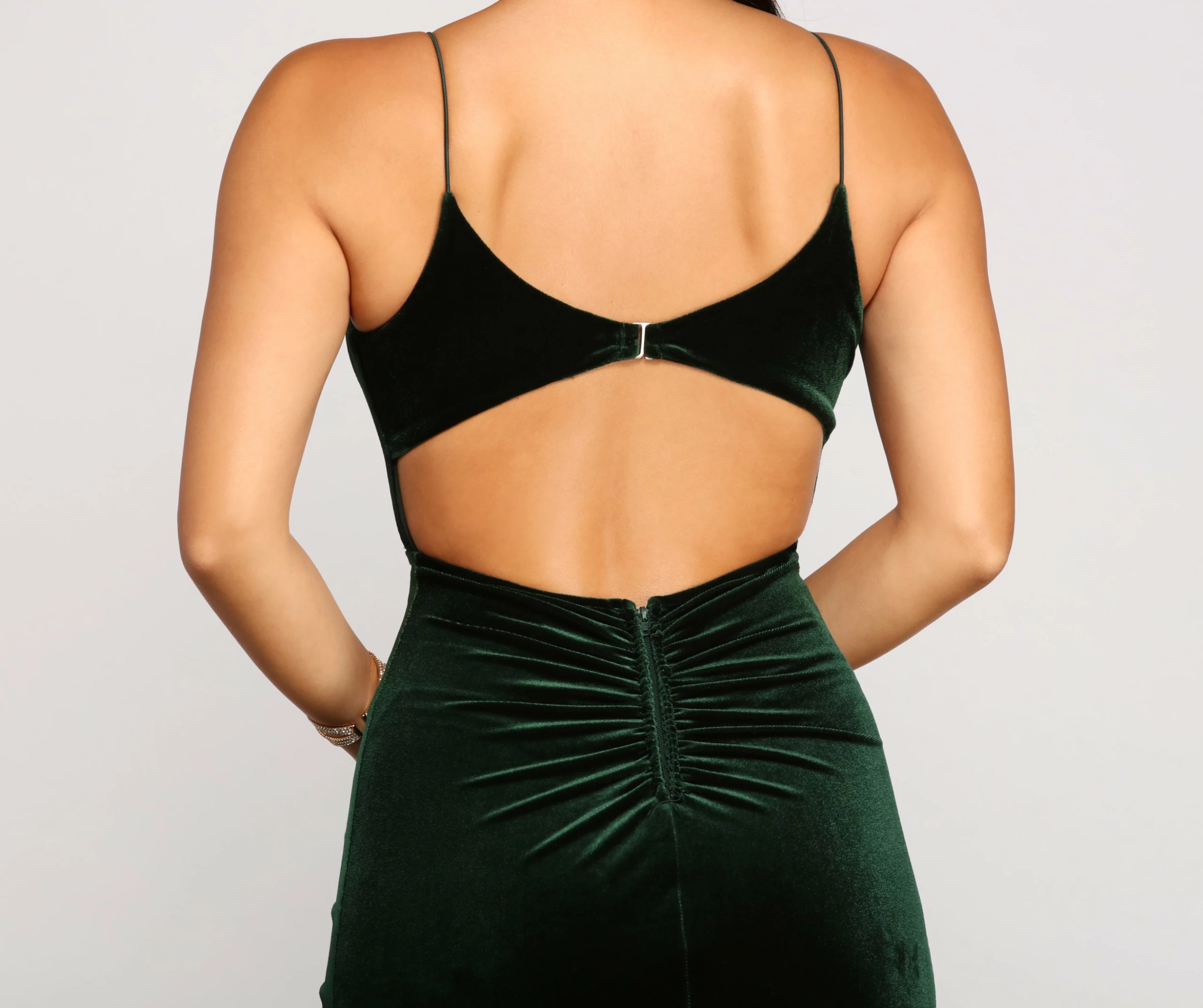 - Open-back, ruching, slide-hook and zipper closure
