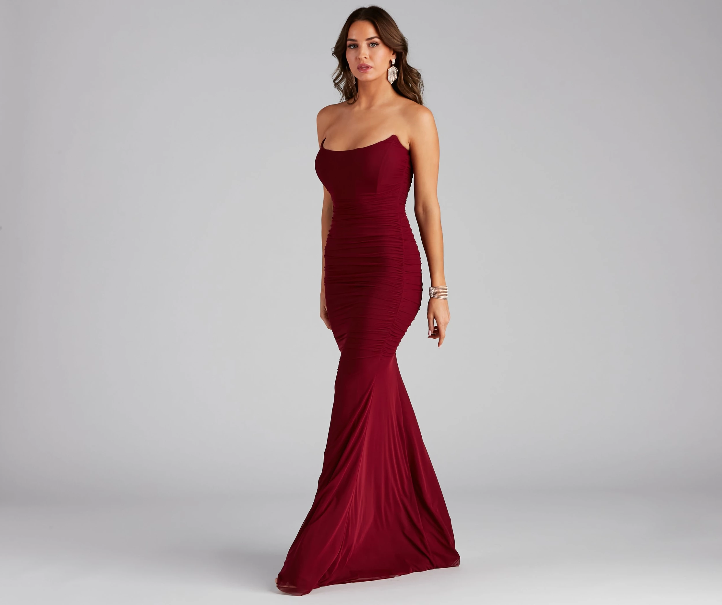 Have a head-turning moment when you enter the room in the sultry and stunning Cassidy formal dress. She features a strapless rounded neckline with an angled design, flexible boning at the bodice to provide structure, side ruched detailing, and a curve-hugging, floor-length silhouette with a chic trumpet hem. Style this dress with sleek