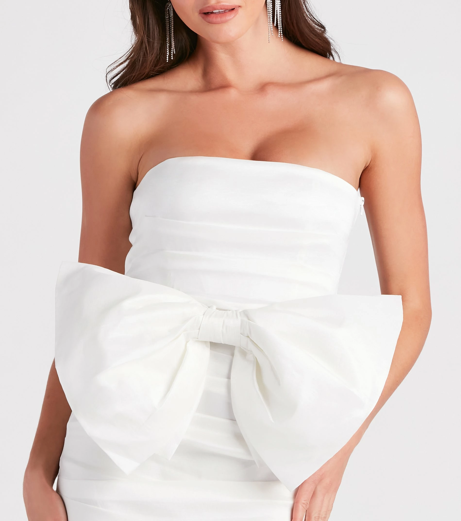 Strut like a true fashion-trendsetter in the Cecilia taffeta party dress that keeps all eyes on you! Sleek and simple from the back but stunning in the front, she’s perfect for brides, graduates, and formal cocktail parties. She features a strapless square neckline with non-slip grip lining, a detachable statement bow on the front, and all-over pleating and ruching along her bodycon silhouette with a flirty mini-length hem. The party dress is composed of a taffeta woven fabric with a sewn-in knit lining and minimal stretch. Complete your dressy look in