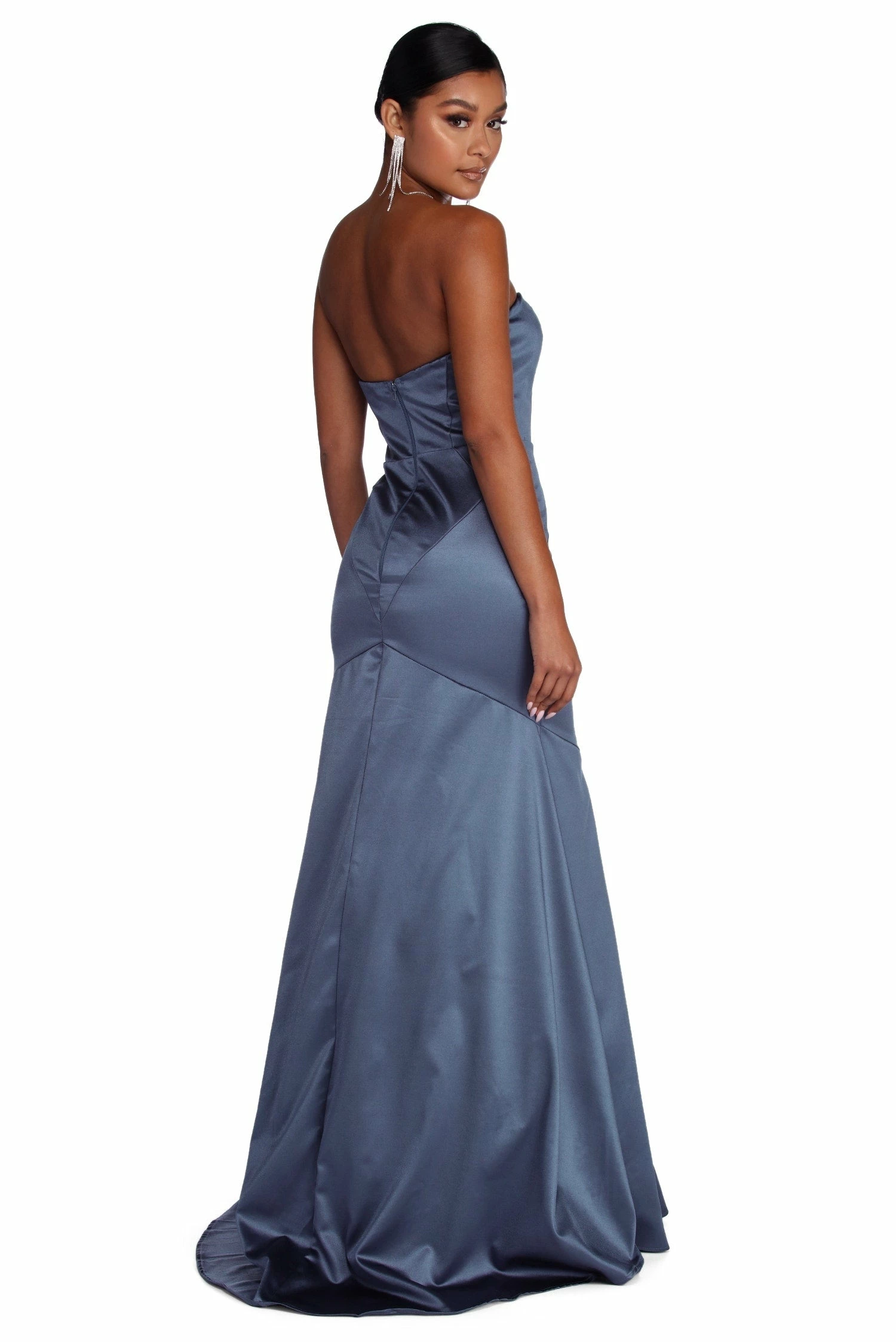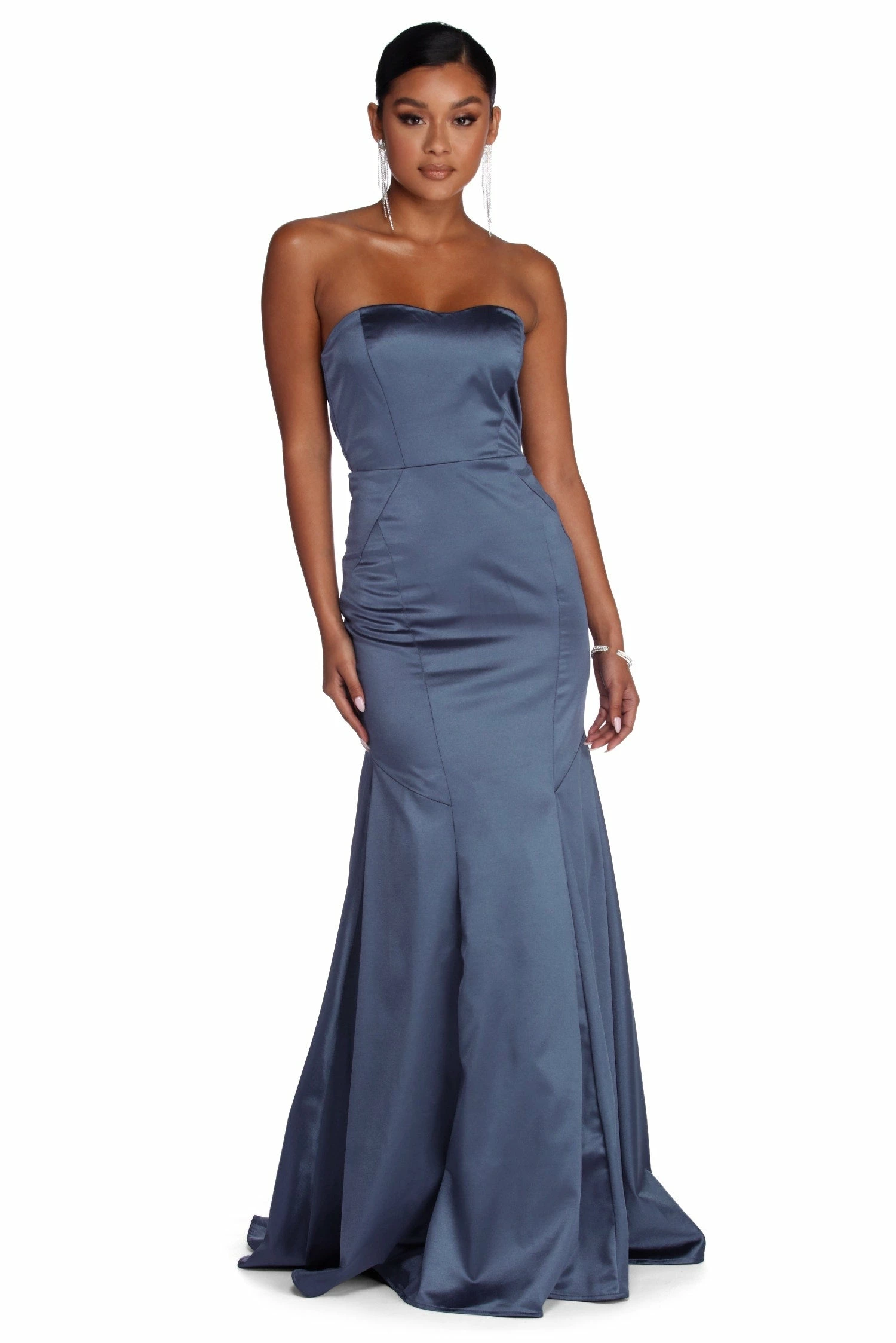 Lead the room in stunning satin as you capture hearts in our Cheyenne dress! She features an all over blue hue, a sleeveless bodice, a sweetheart neckline with a built in no slip strip, padded cups, built in boning for structure and princess seams. Her slim fit bodice leads to a dramatically flared floor length silhouette with vertical seams to create an hour glass illusion. She is composed of a lined satin fabric that offers a relaxed fit with minimal stretch. Includes a petticoat and back zipper closure.