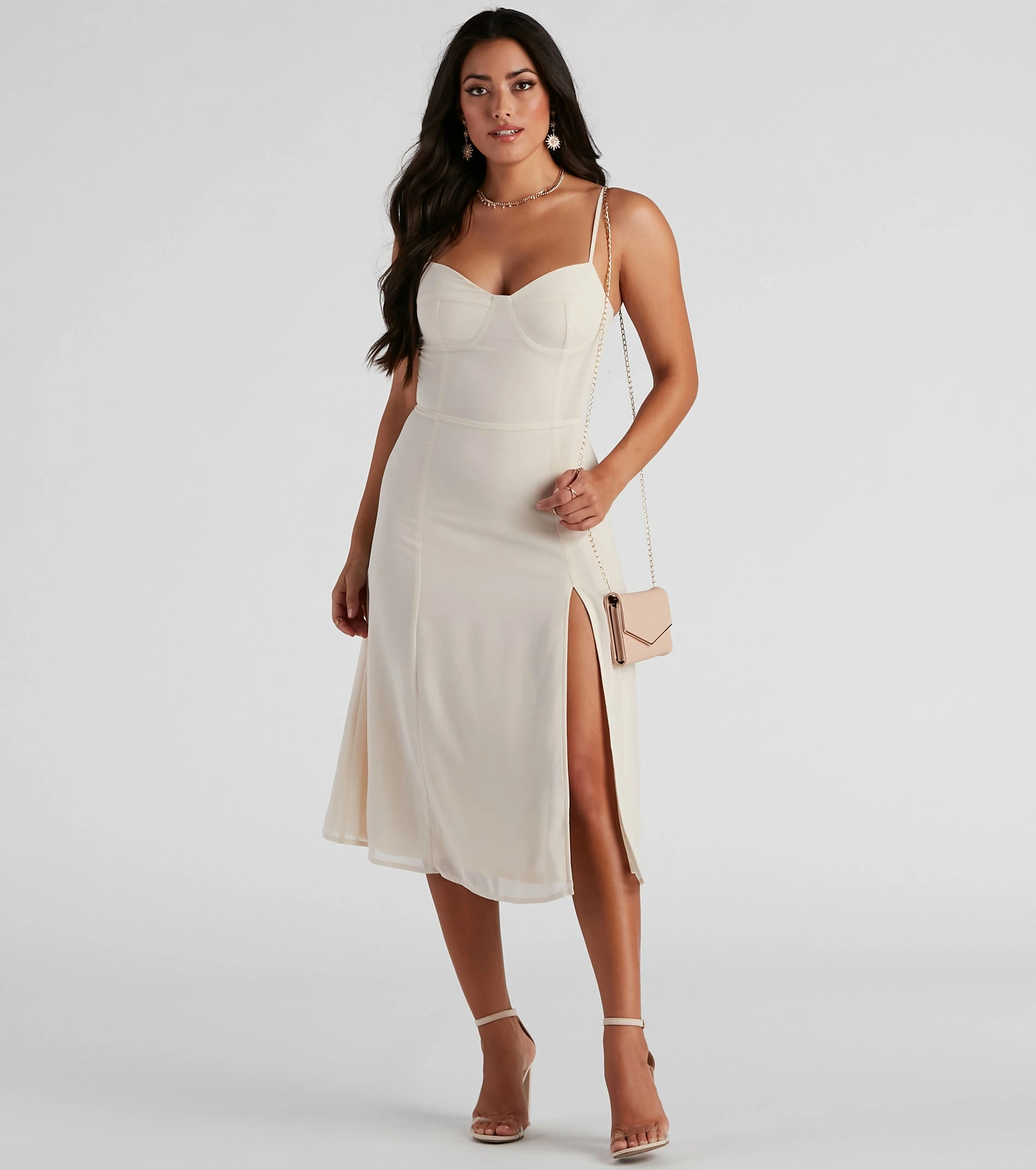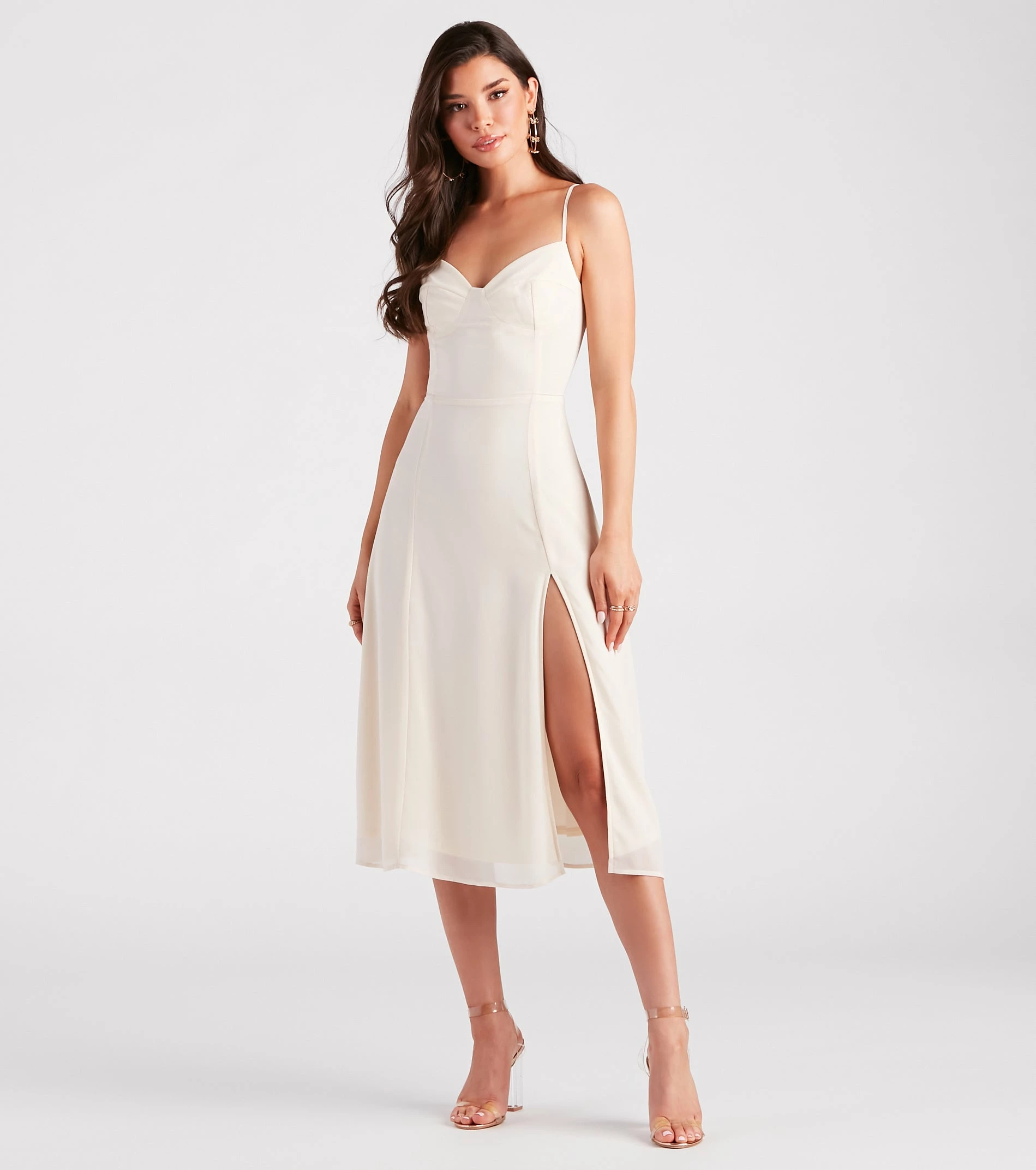 Get the perf semi-formal look in this effortlessly chic chiffon midi dress. It features a sleeveless sweetheart neckline with a padded bust, spaghetti straps, a flattering high waist seam, and a mid-length skirt with a front slit and a flowy A-line silhouette. Style this dress with sleek earrings and