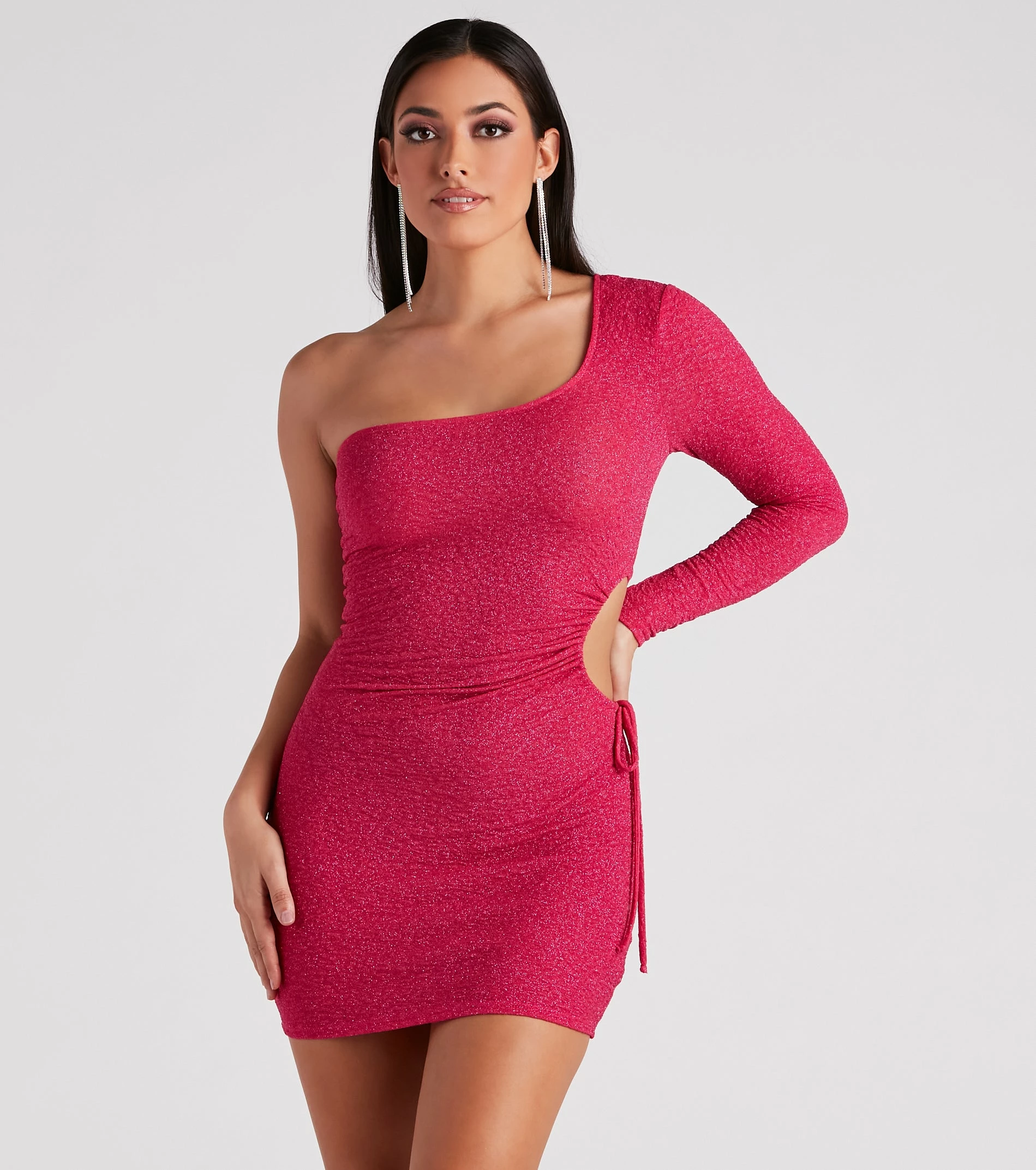 Hit the town in this glitter mini dress to sparkle under the spotlight! It features a one-shoulder neckline, long sleeve, and a side cutout with an adjustable drawstring-tie design, and a bodycon silhouette. Complete the look with an