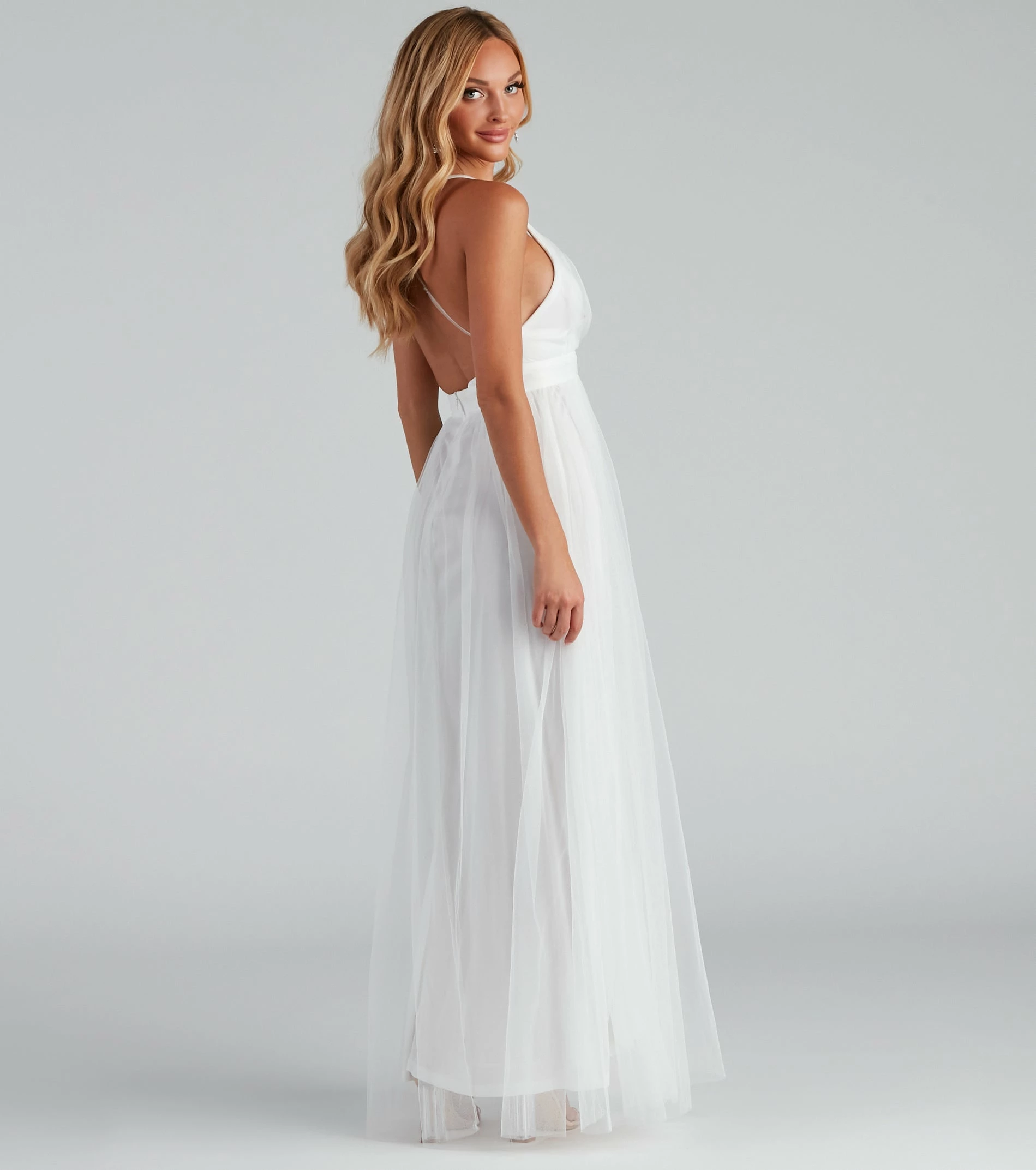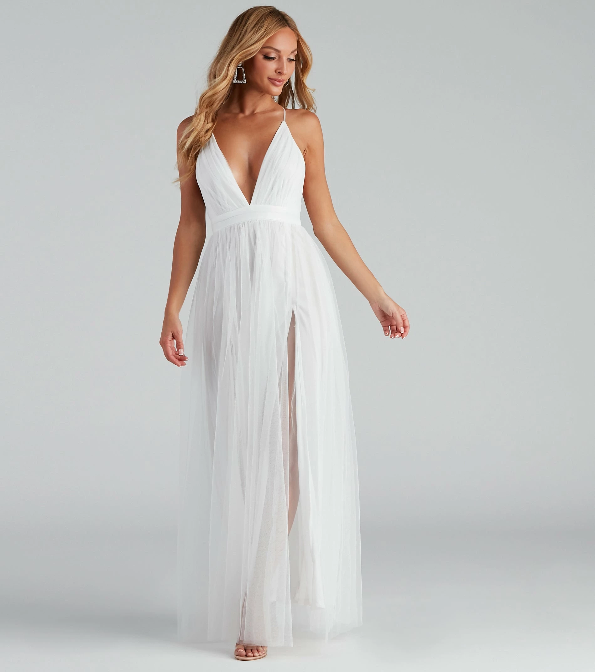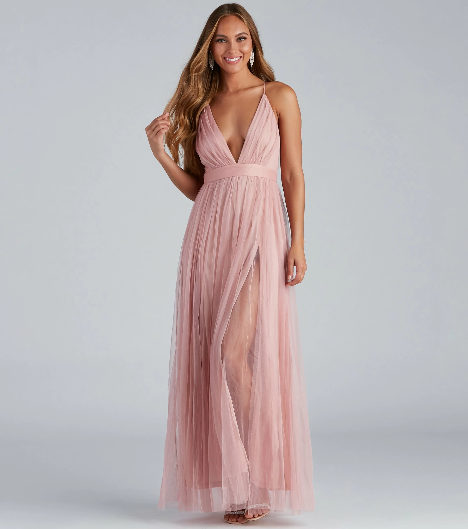 Dress as the princess you are with our breath-taking Elisabeth dress! She is a floor-length evening gown with a plunging V-neckline and thin adjustable straps that create a cross-back design. Her wide empire waist leads to a floor-length skirt that dances around your ankles. She is composed of pleated tulle fabric with a sheer appearance and a thin knit lining that features two front slits. Elisabeth offers a moderate stretch and includes a hidden zipper. Complete look with a rhinestone clutch and a
