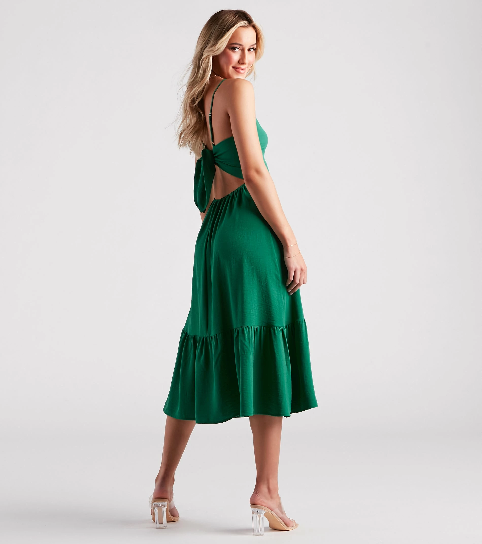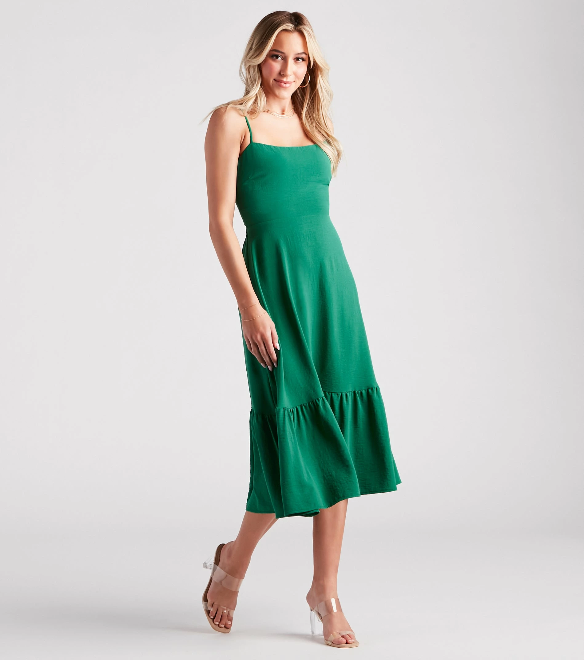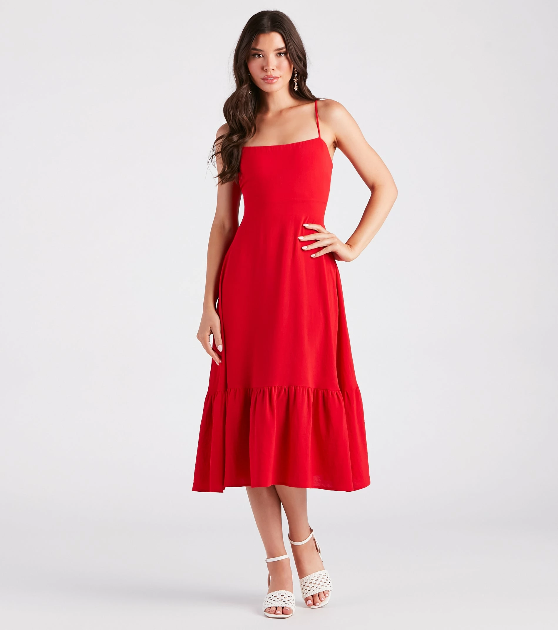 For the sun-soaked days ahead, this linen midi dress will make a cute companion! It features a sleeveless square neck, adjustable spaghetti straps, a flirty tie-back closure, and a flowy ruffled hem. Style with trendy