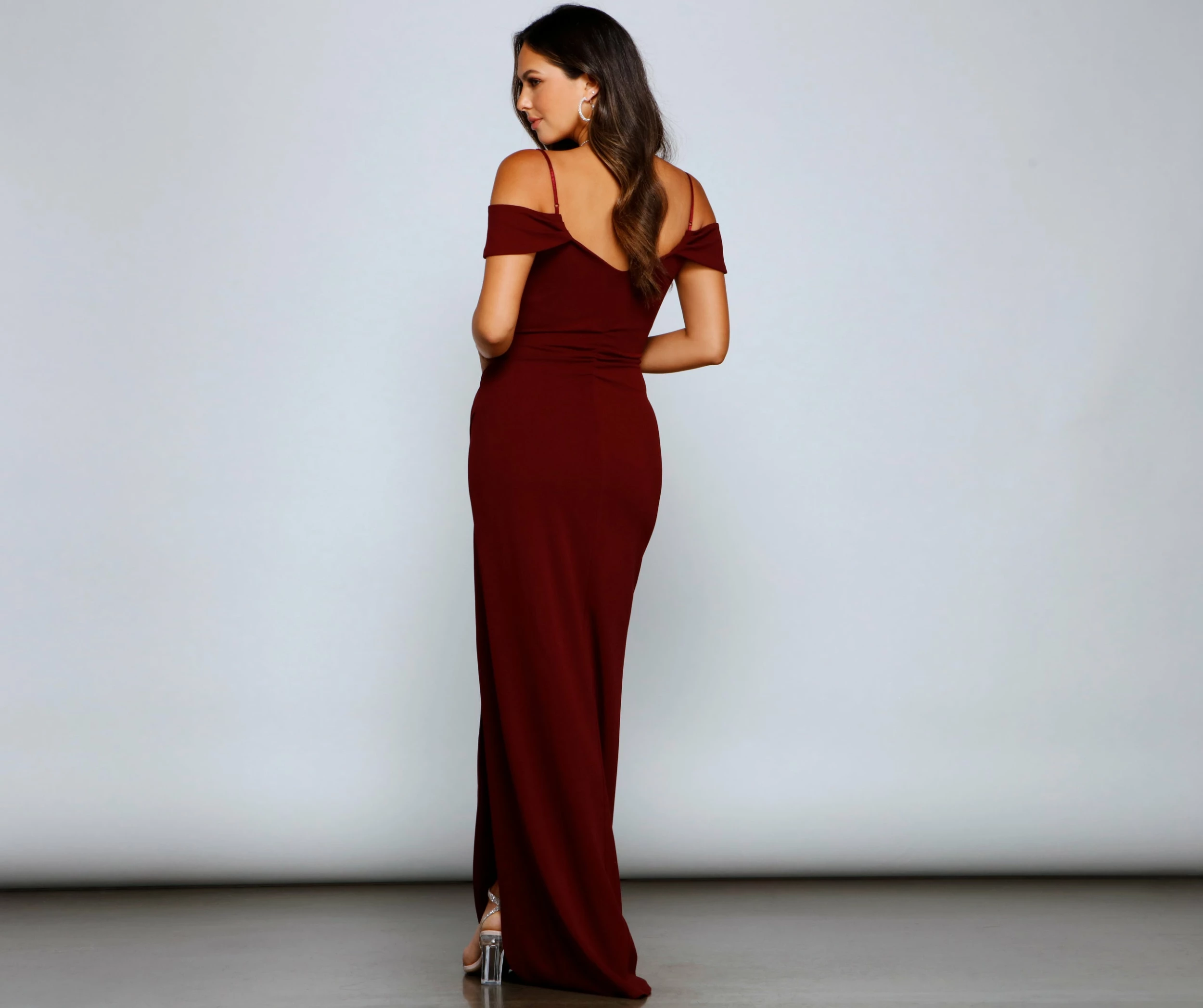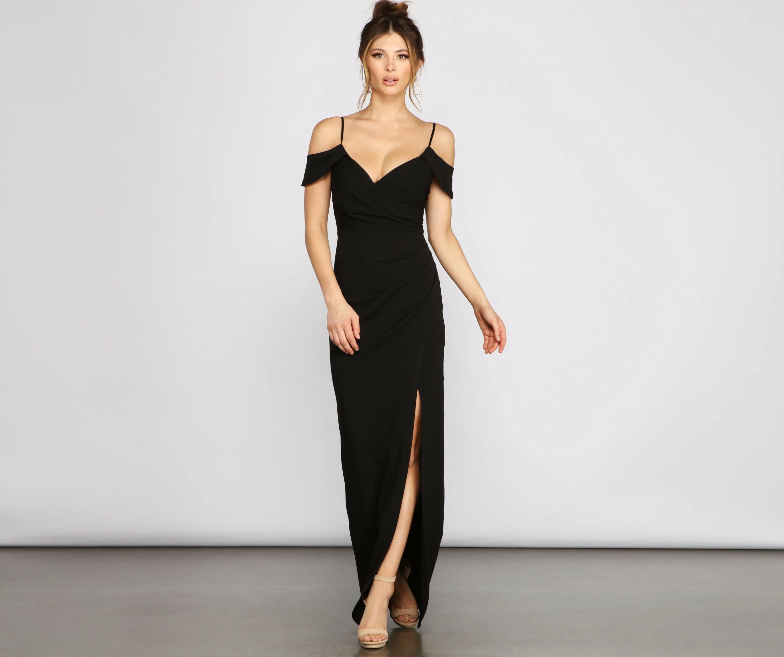 Step out in style this season in the stunningly gorgeous Eva formal dress! She features an off-the-shoulder V neckline with a pleated wrap-front, adjustable spaghetti straps, and a ruched back detail. Her high waist seam flows out to a floor-length A-line silhouette with an asymmetric wrap design creating a thigh-high slit. Complete your look with