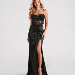 Gracefully enter the room in the romantic Everly formal satin dress – stunning for black tie anniversary celebrations and galas! She features a sleeveless V-neckline with lovely cowl pleating, adjustable spaghetti straps, a sheer lace corset bodice with flexible boning, a flattering mermaid silhouette, and a high front slit along her floor-length hem. The formal dress is composed of luxurious satin-lined fabric with a moderate stretch. Complete the look with an