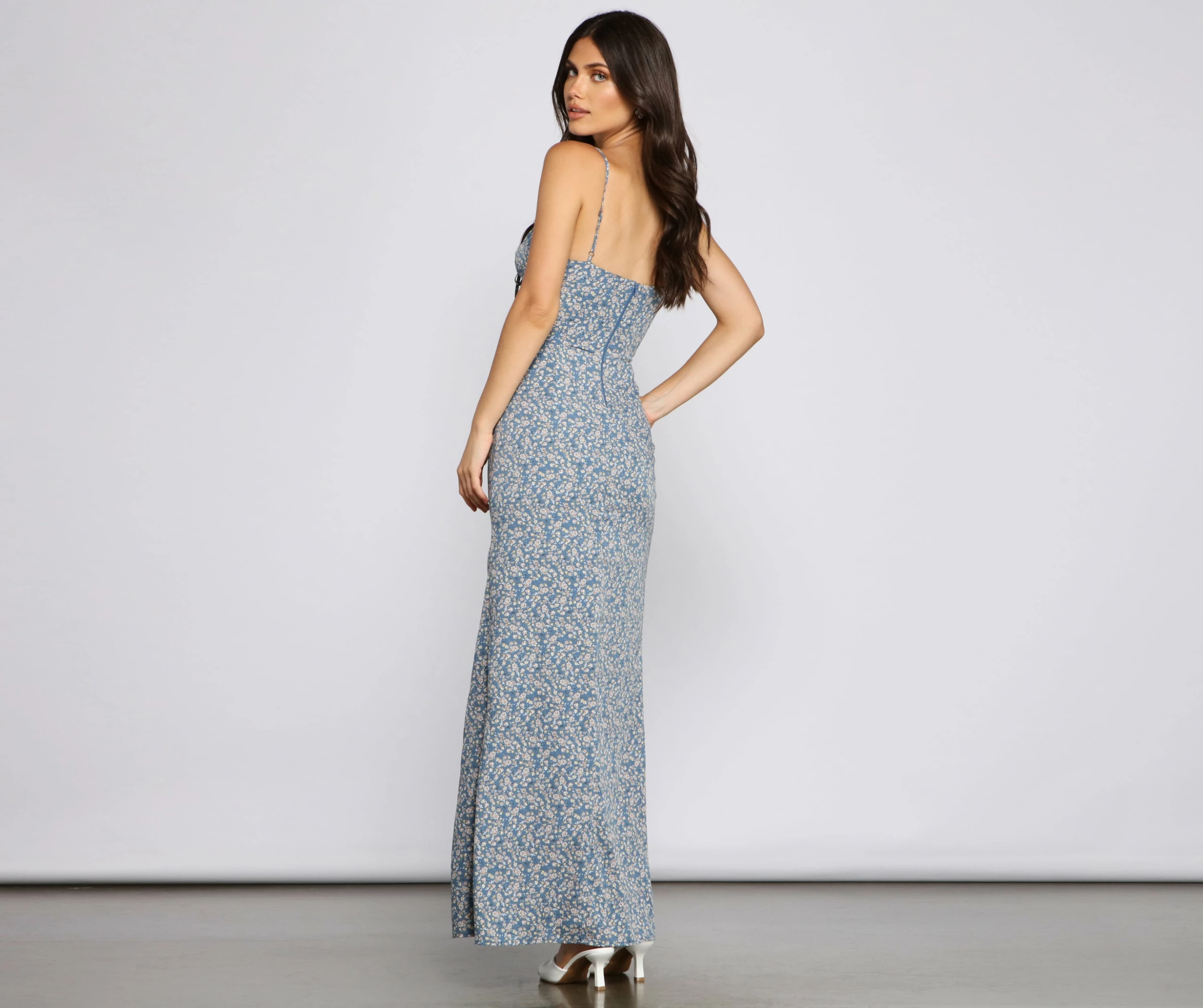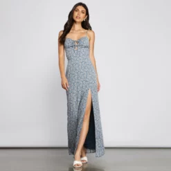 This dress is what floral dreams are made of! The dress features a ditsy floral print, a sleeveless sweetheart neckline, a mini tie-front, adjustable spaghetti straps, and a maxi-length silhouette with a high side slit. The dress is composed of a chiffon fabric that offers a relaxed fit with minimal stretch. Complete look with