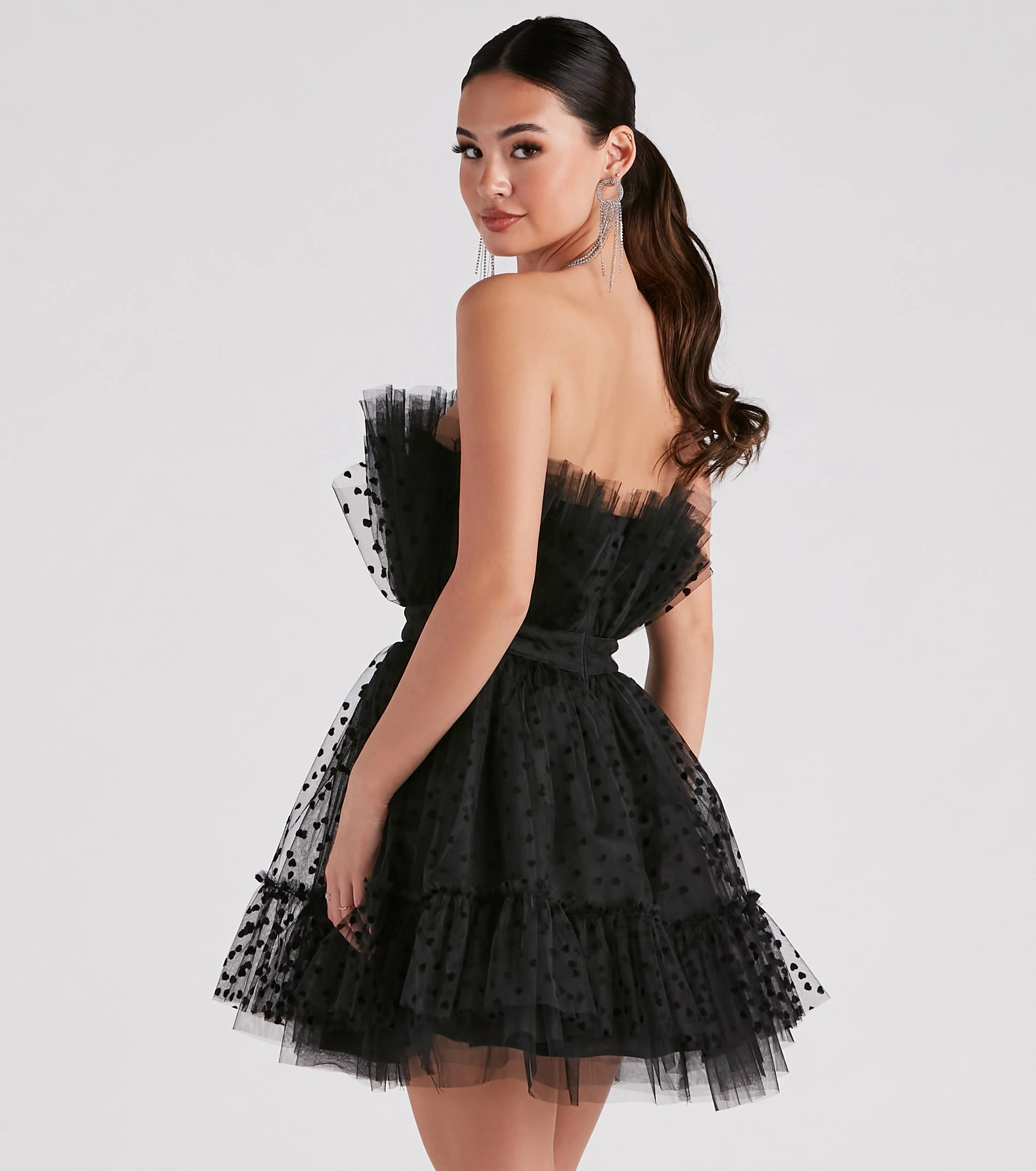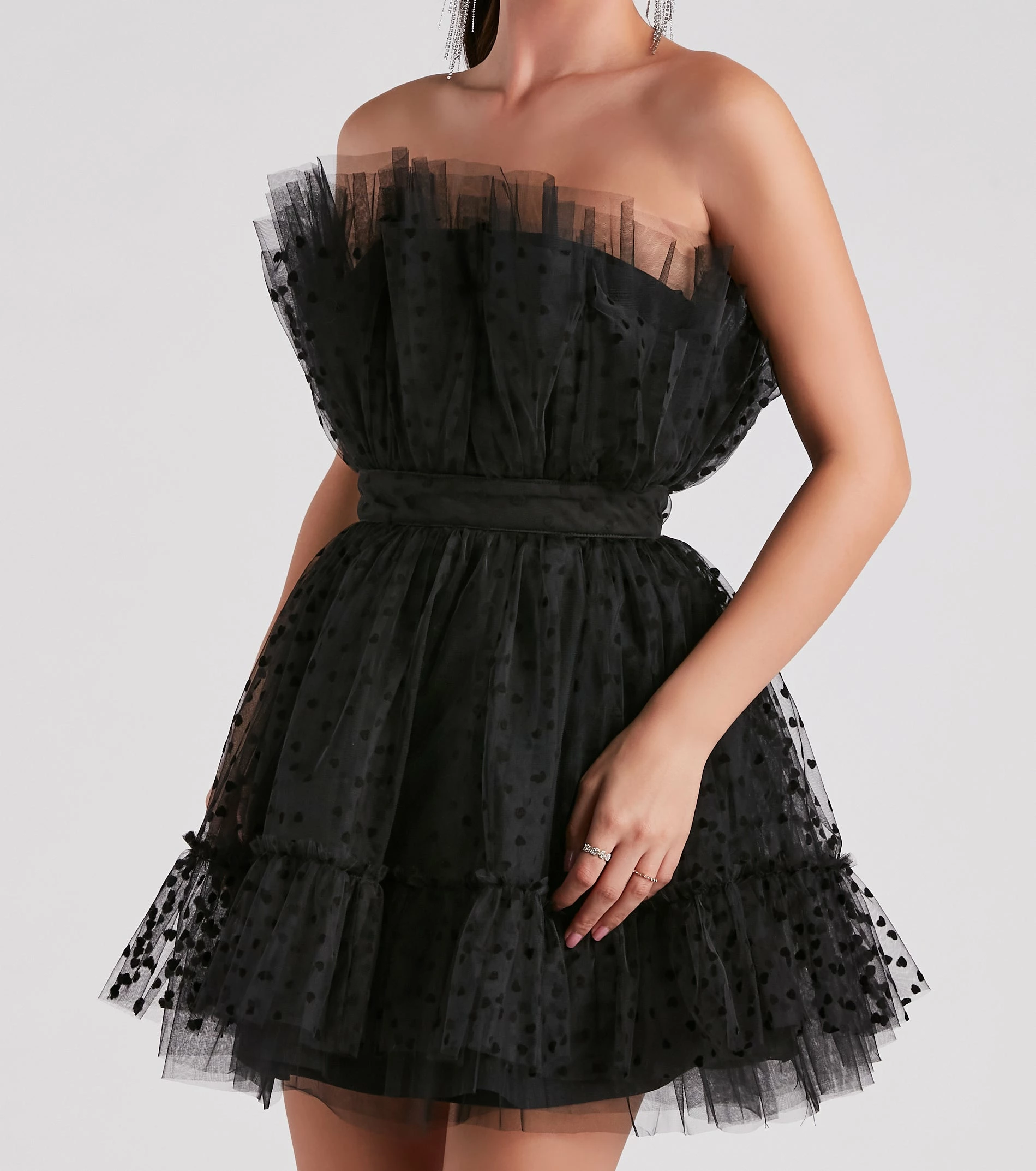 The Florence party dress is full of romantic details! Every heart will adore you in this tulle short dress showcasing a flirty velvet heart pattern perfect for date night or a Galentine’s party. She features a strapless neckline with non-slip grip lining, a cinched waist, and a short A-line silhouette. The formal dress is composed of a voluminous tulle mesh fabric with a smooth non-stretch woven lining. Style with spiral