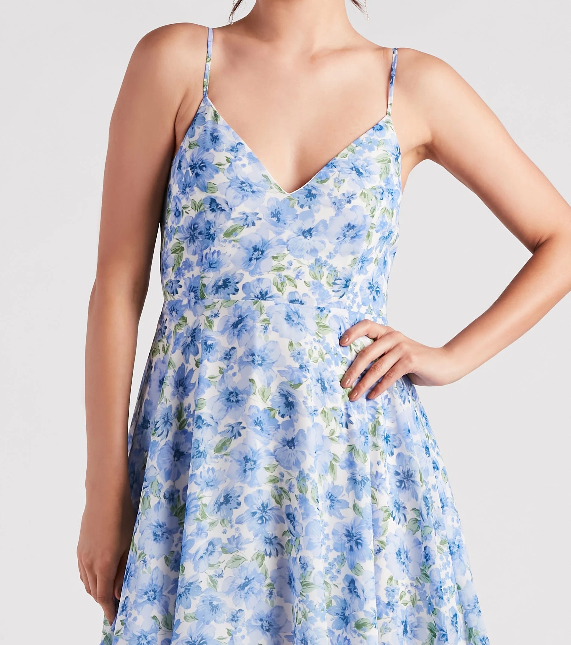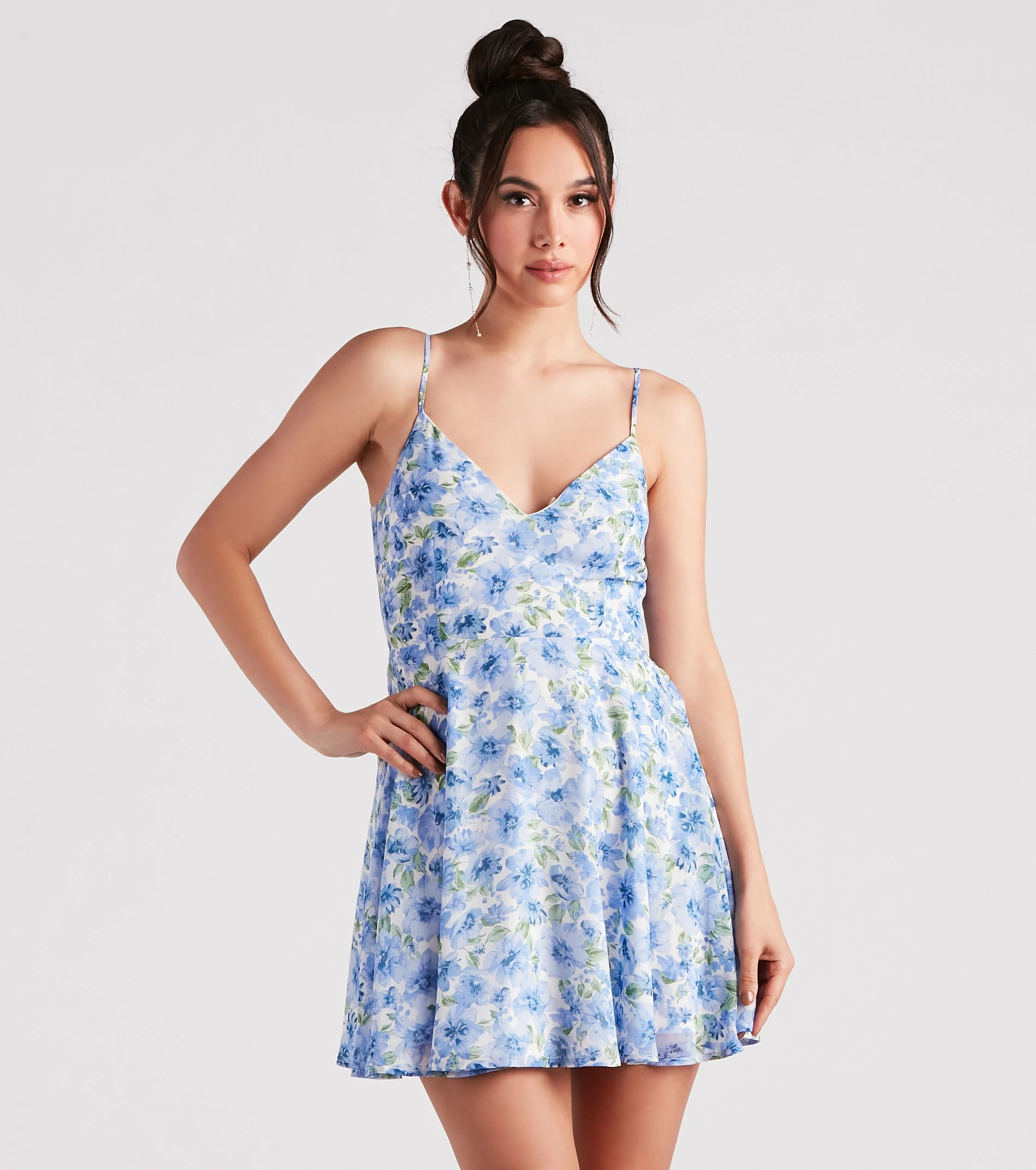 Your stroll through the garden party will be so sweet in this floral chiffon dress! It features a sleeveless V-neckline, adjustable spaghetti straps, a flirty tie-back design, and a fit-and-flare skater silhouette with a short hem. Complete the look in cute