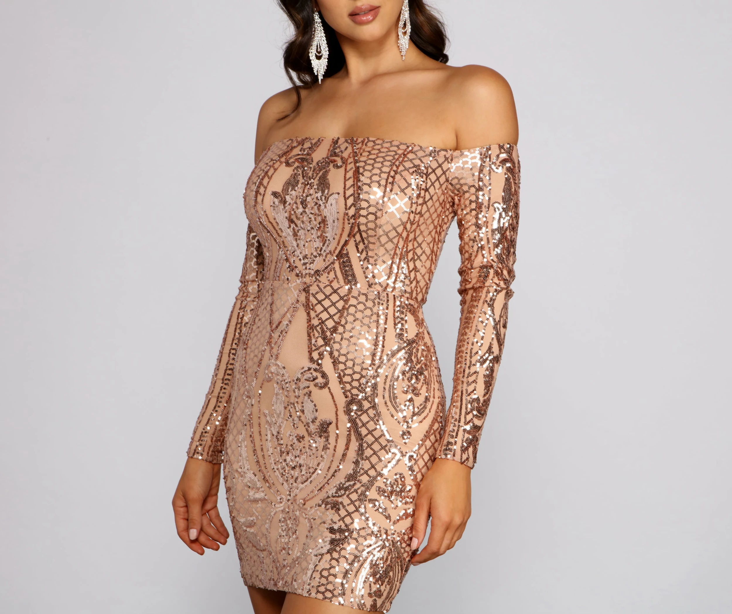 Create a simply stunning look for your special night out in the gorgeous Halston mini dress! She features an off the shoulder neckline, long fitted sleeves, a back zipper and hook and eye closure, and a mini-length, form-hugging silhouette. The dress is composed of a sheer mesh fabric with an all-over intricate sequin pattern and includes a smooth and stretchy knit lining. Complete your outfit with