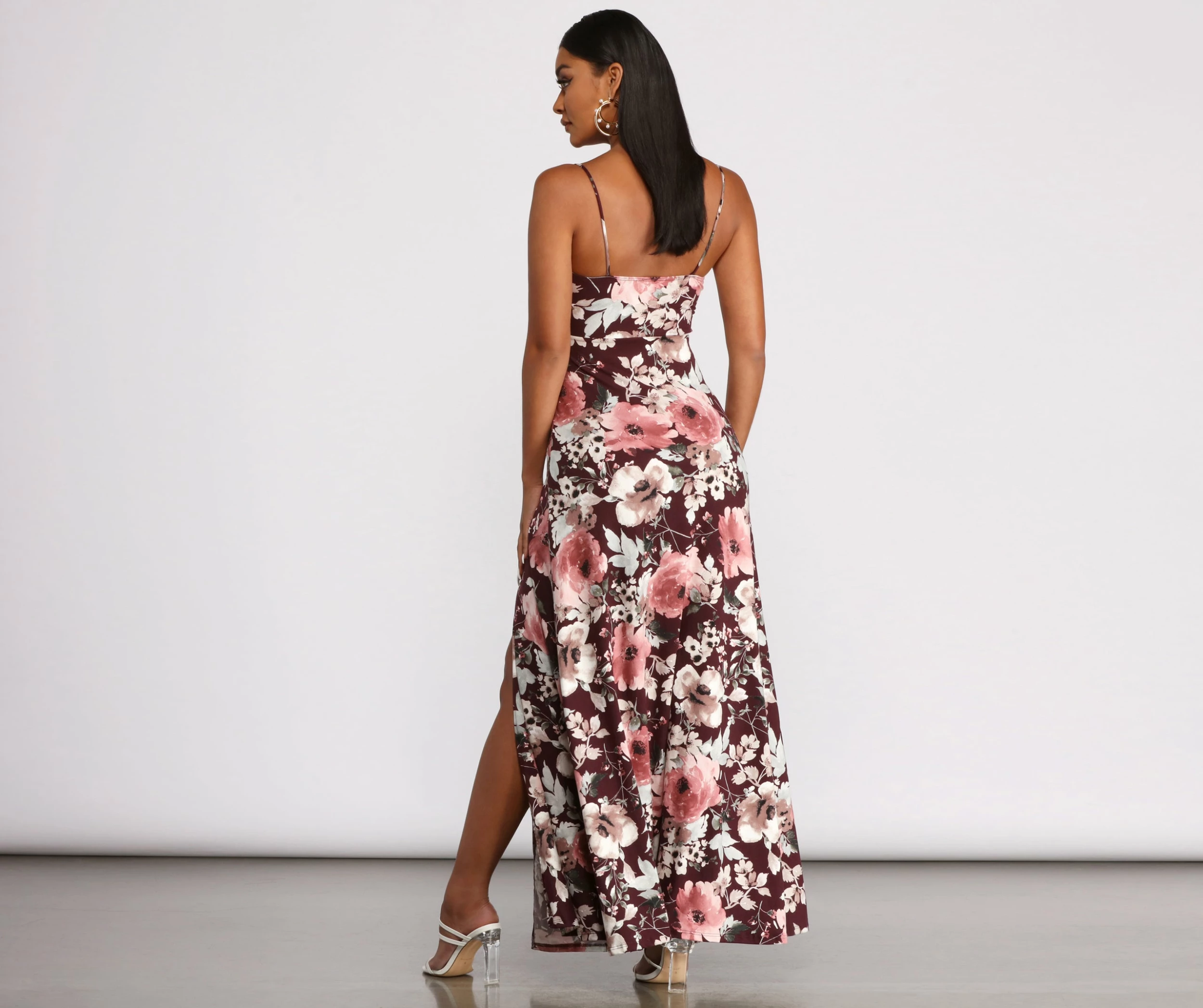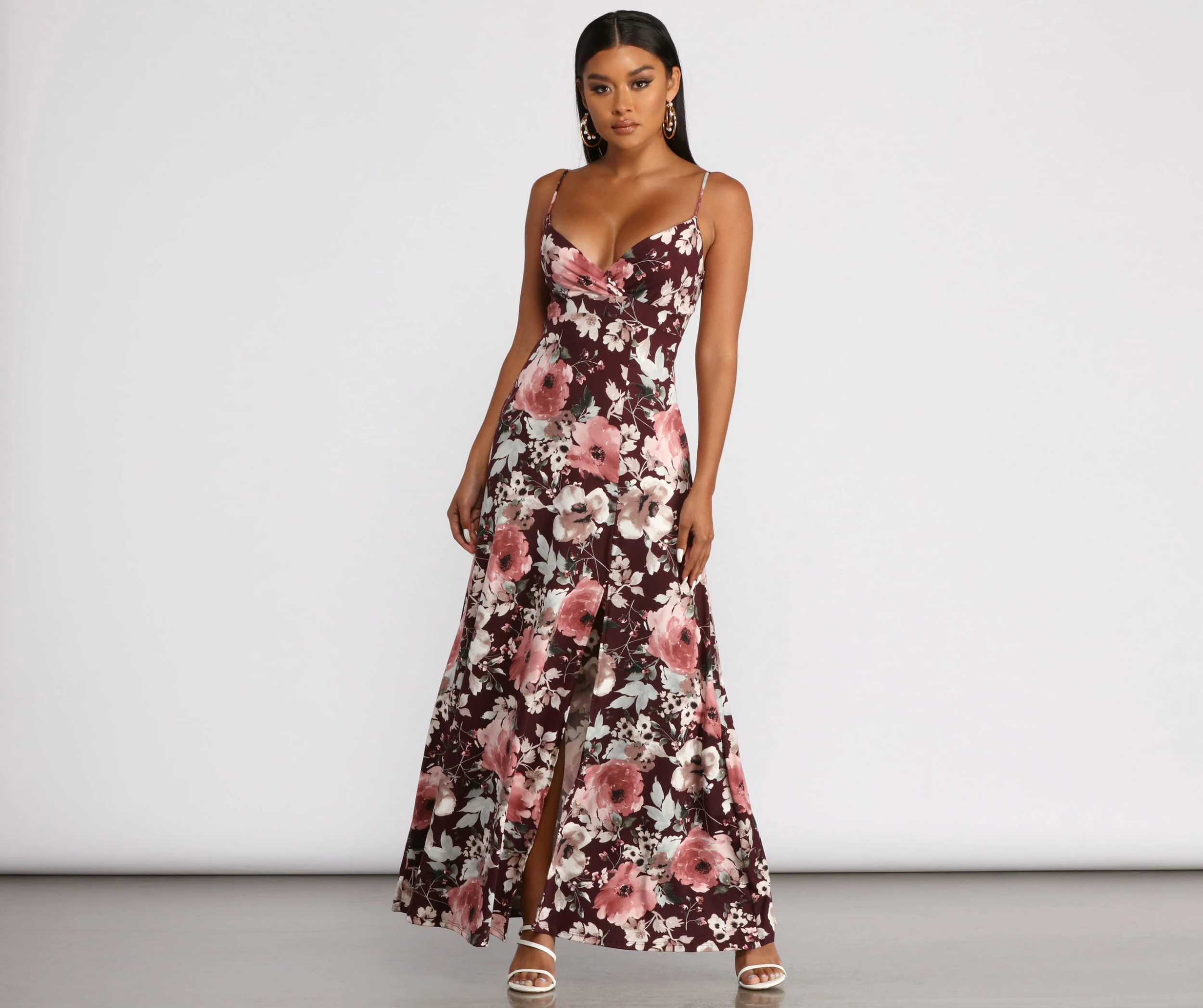 Upgrade your dress with a floral print. The floral maxi dress features a sleeveless bodice, a plunging V-neckline, and spaghetti straps that lead to a partially open back with a square neck. The relaxed fit waist leads to a curve-hugging maxi length silhouette that is accented with a high side slit to reveal a hint of leg. The dress is composed of a smooth knit fabric that offers a form hugging fit. Complete your brunch-ready look with