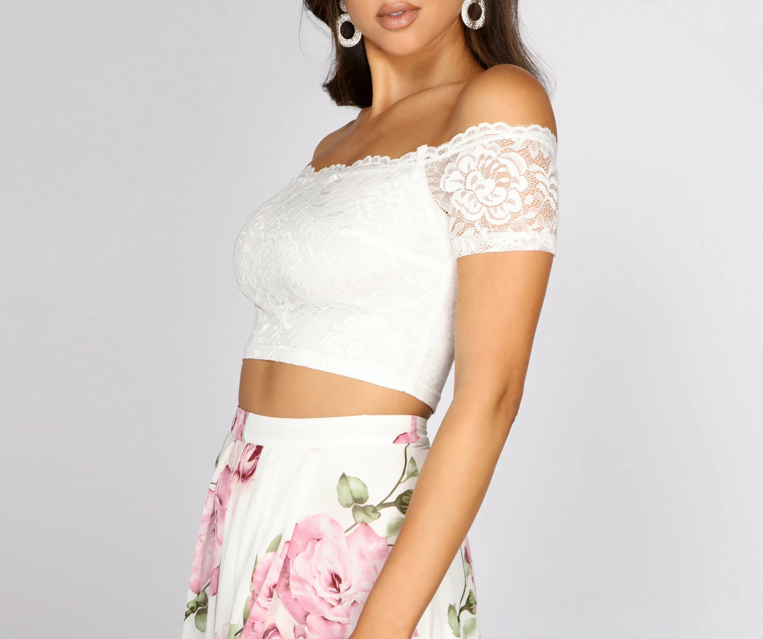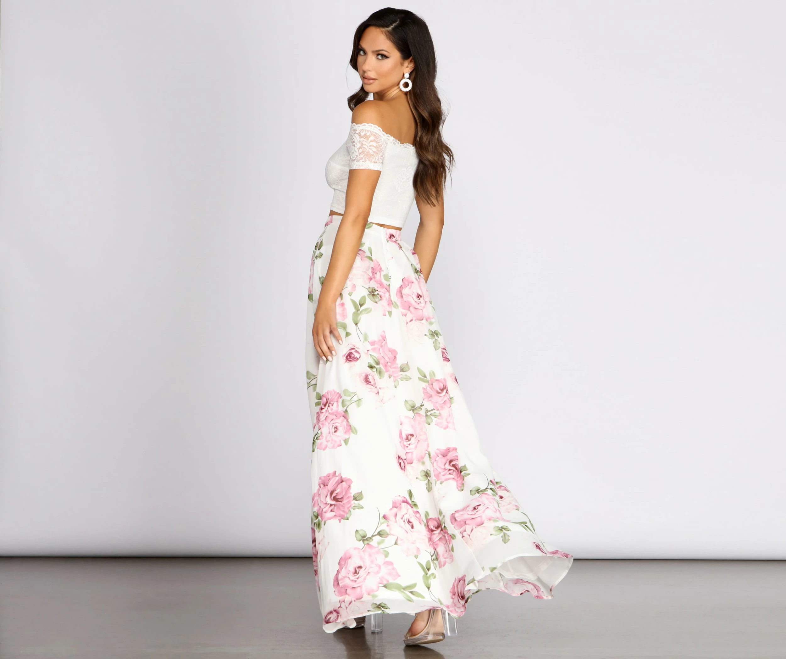 Glide through the room and ooze an ethereal presence in our charming Isadora! With a heavenly lace top and a dreamy floral chiffon skirt to match, these complementary pieces are the perfect fit. Our Isadora will have you standing out against the crowd in an enchanting fashion.