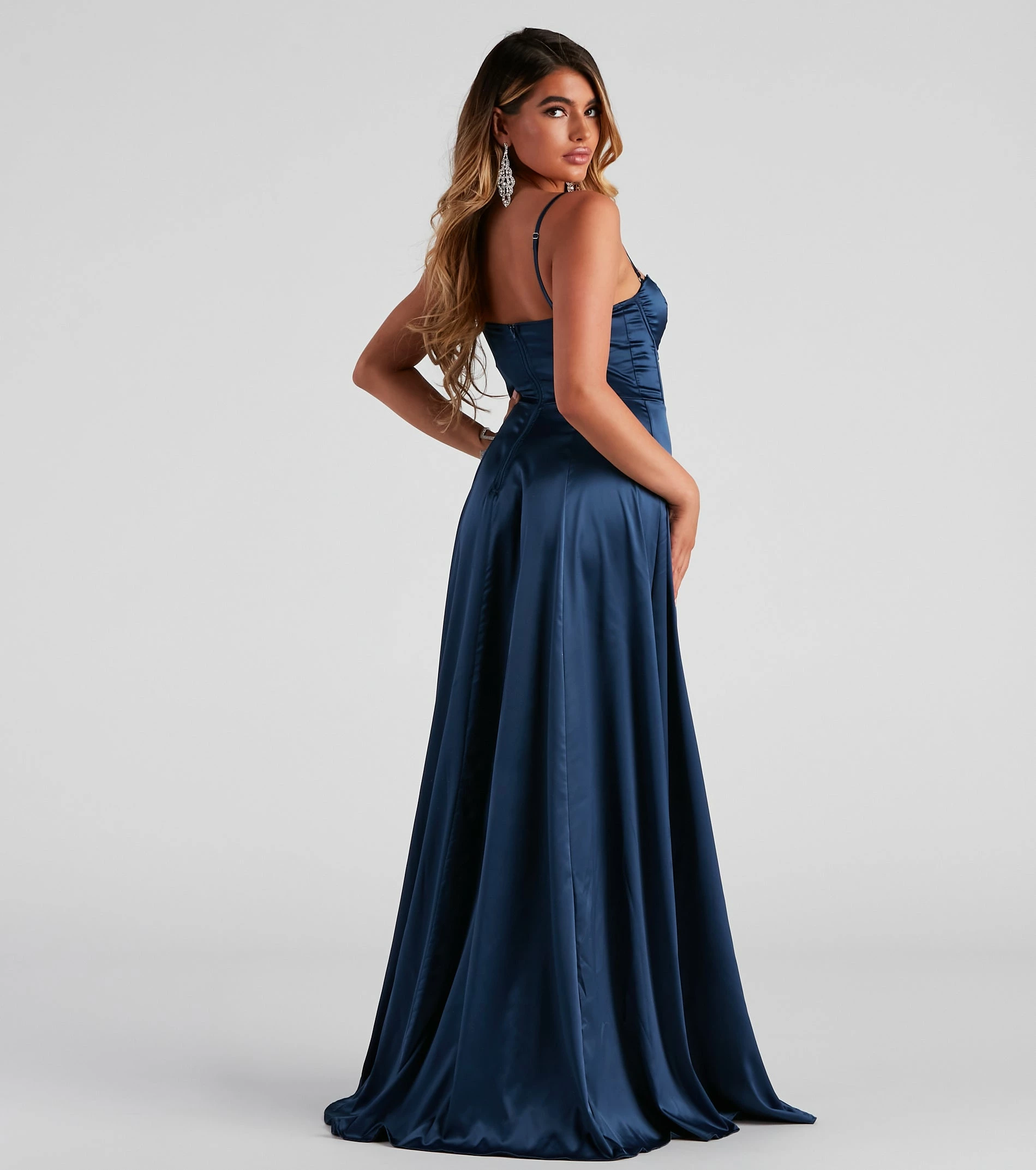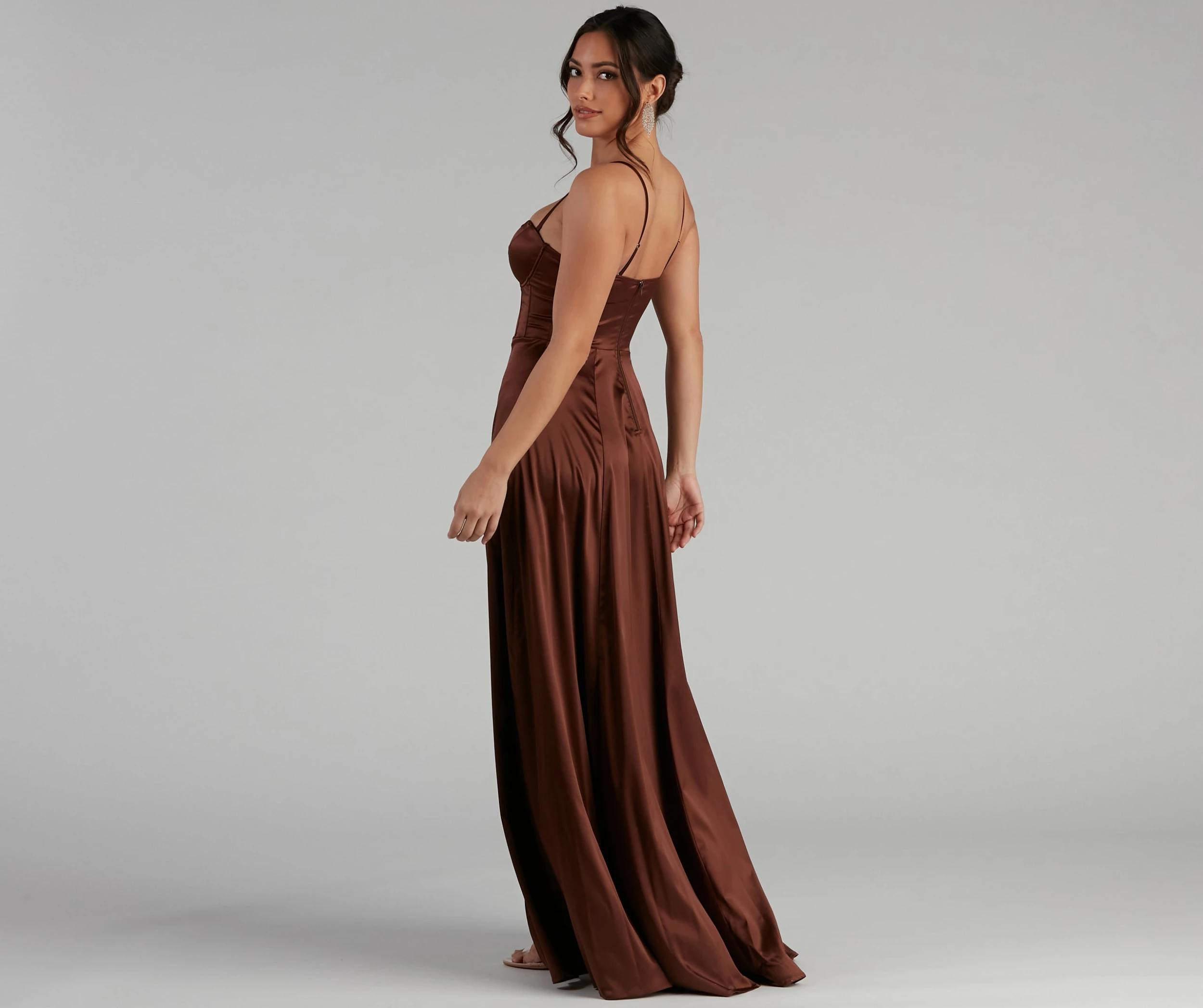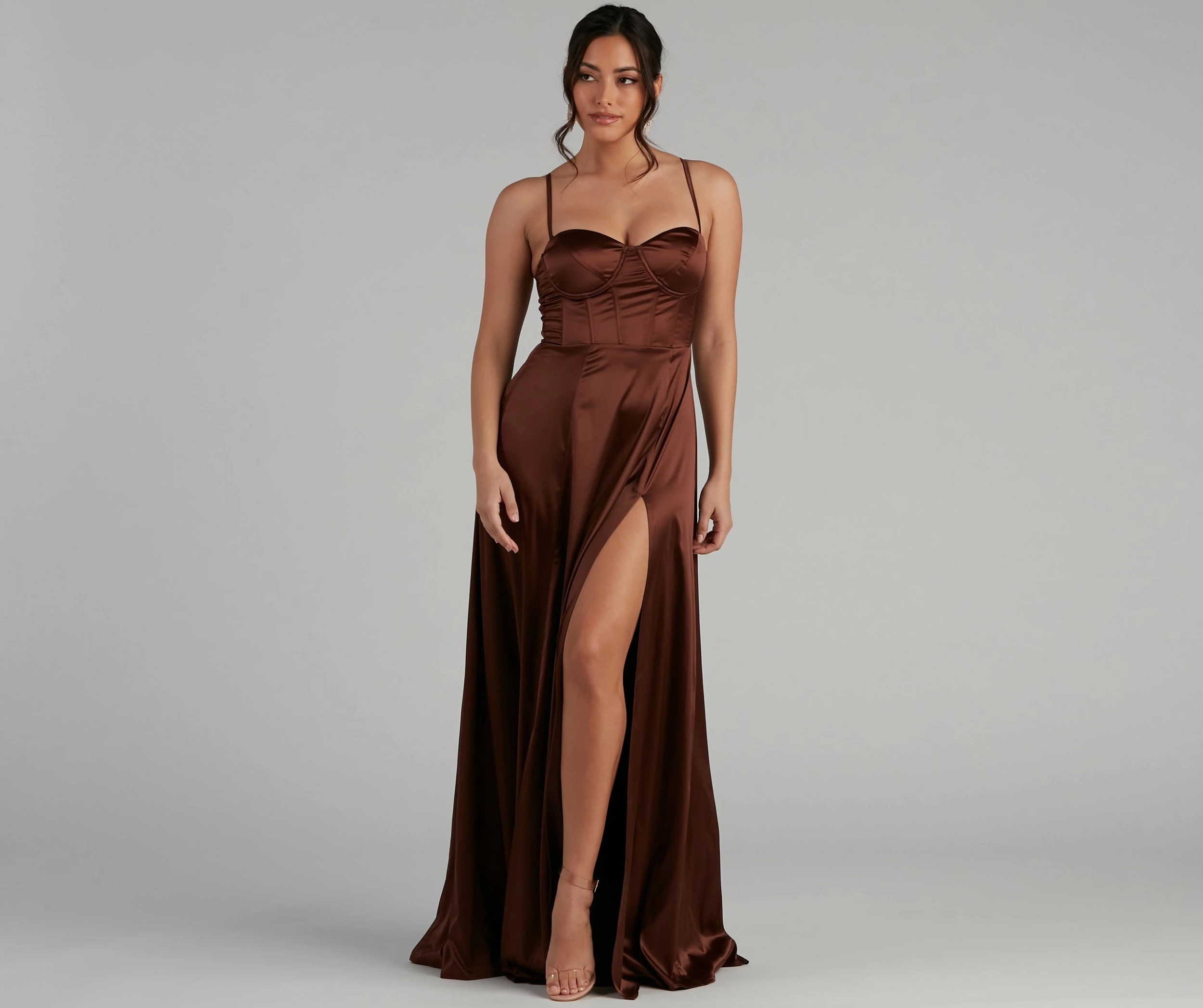 Make a grand entrance in a formal dress that radiates elegance! Jaxine features a sleeveless sweetheart neckline with adjustable spaghetti straps and a corset bodice with piping accents. Her slim-fit bodice leads to a sweeping A-line silhouette with a daring high side slit. She is composed of a smooth satin fabric that offers a relaxed fit with minimal stretch. Complete look with