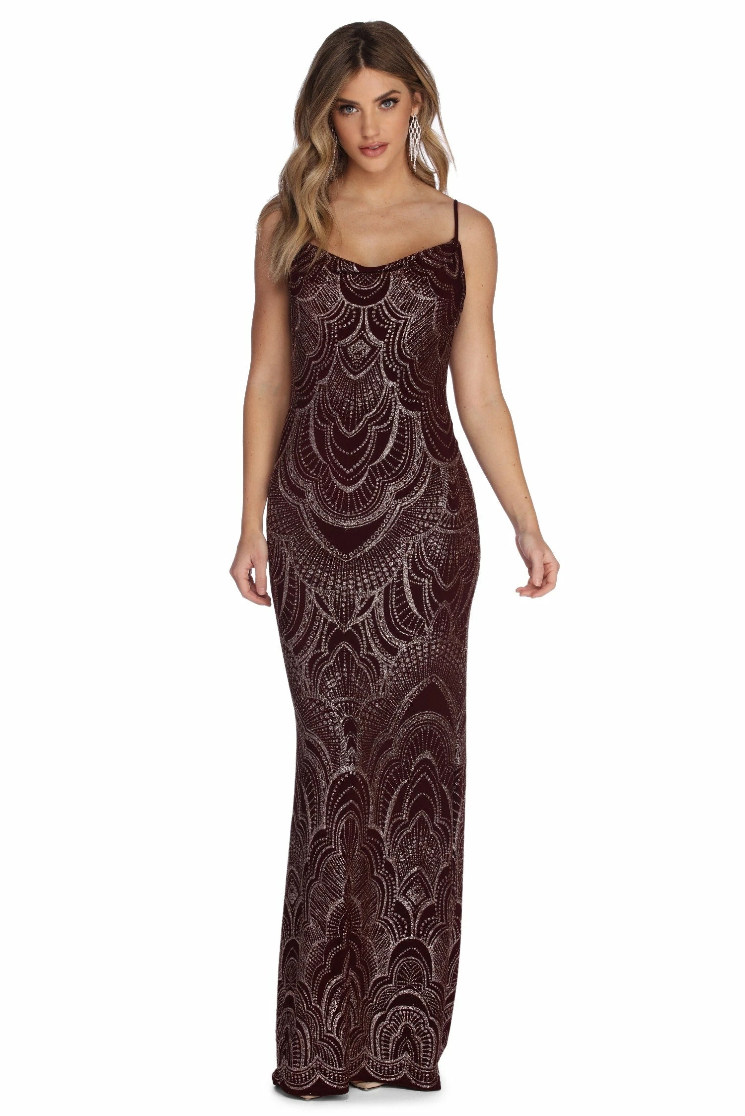 Light up the night in glamorous glitter in our alluring Jessa ivory dress! She features a sleeveless bodice, a cowl neckline and narrow straps. Her bohemian inspired print is composed of a gold glitter detail that adds plenty of shine from any angle! She is composed of a lined mesh fabric that offers a curve hugging fit with a moderate stretch.
