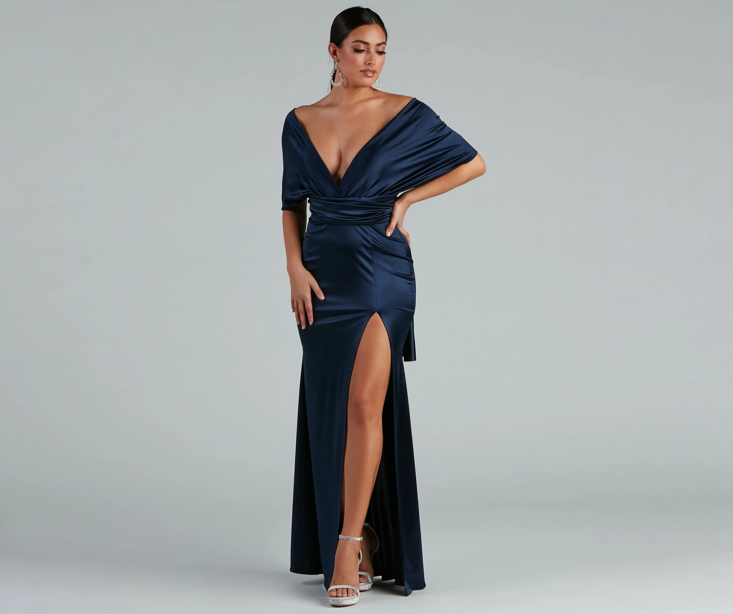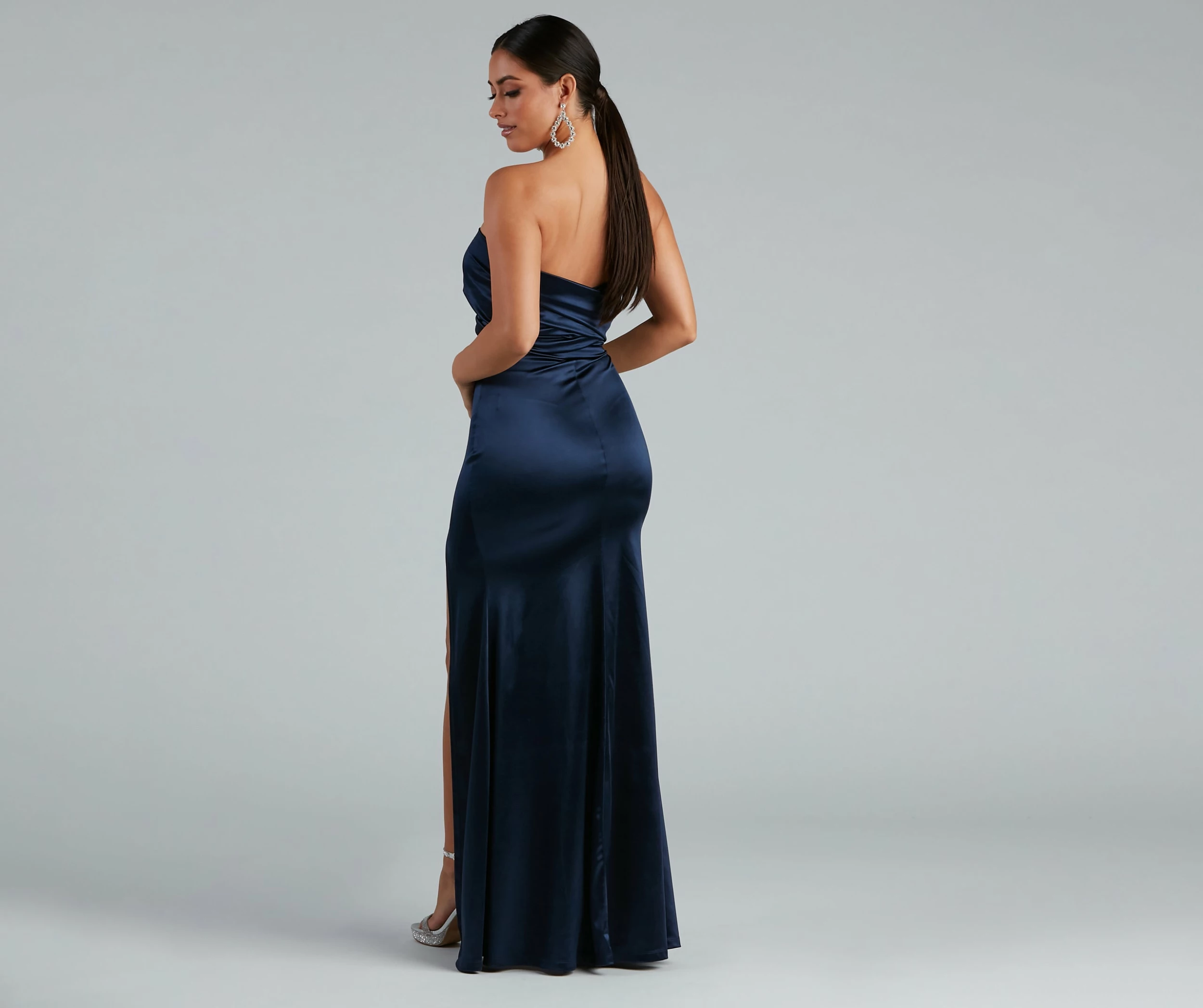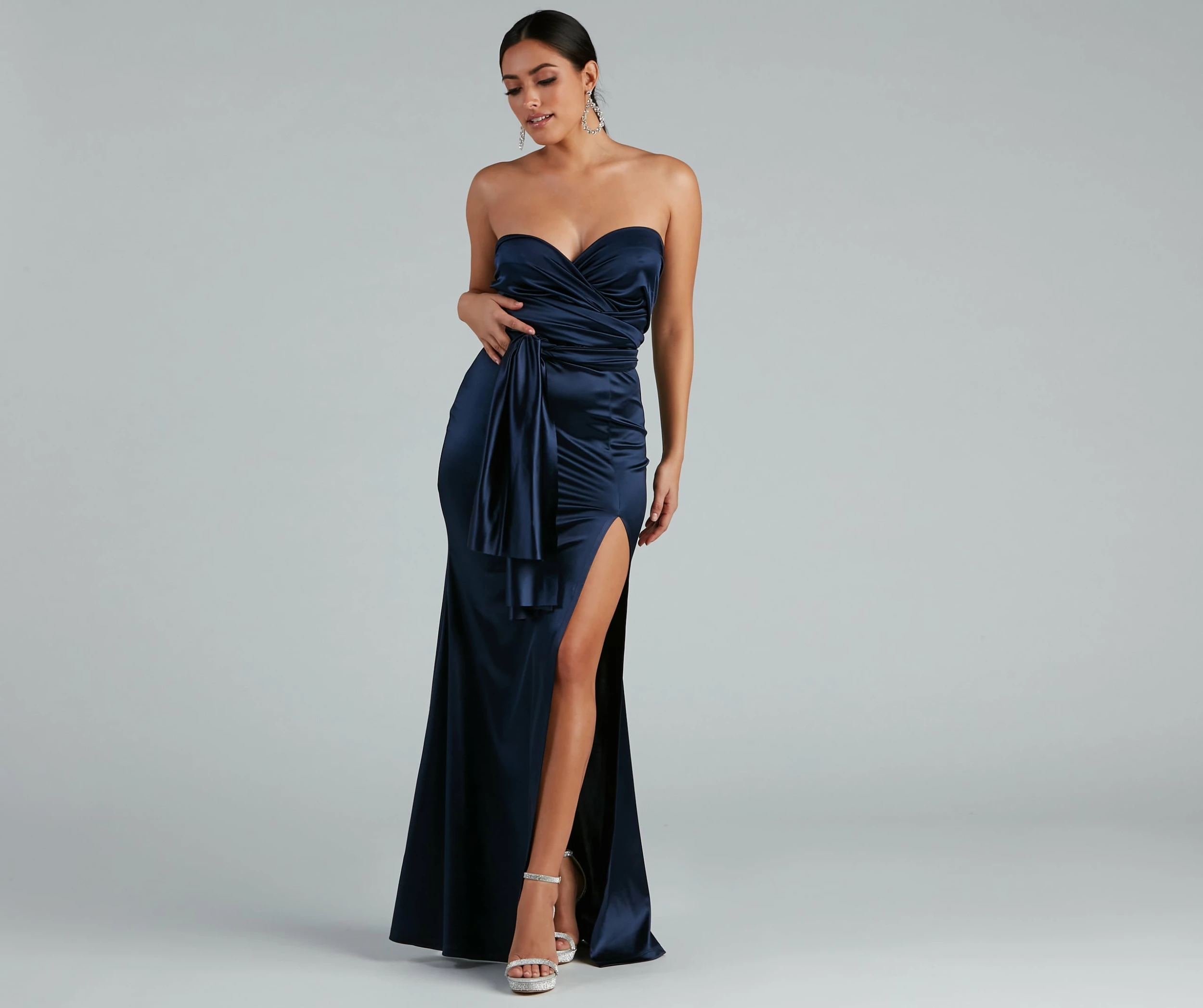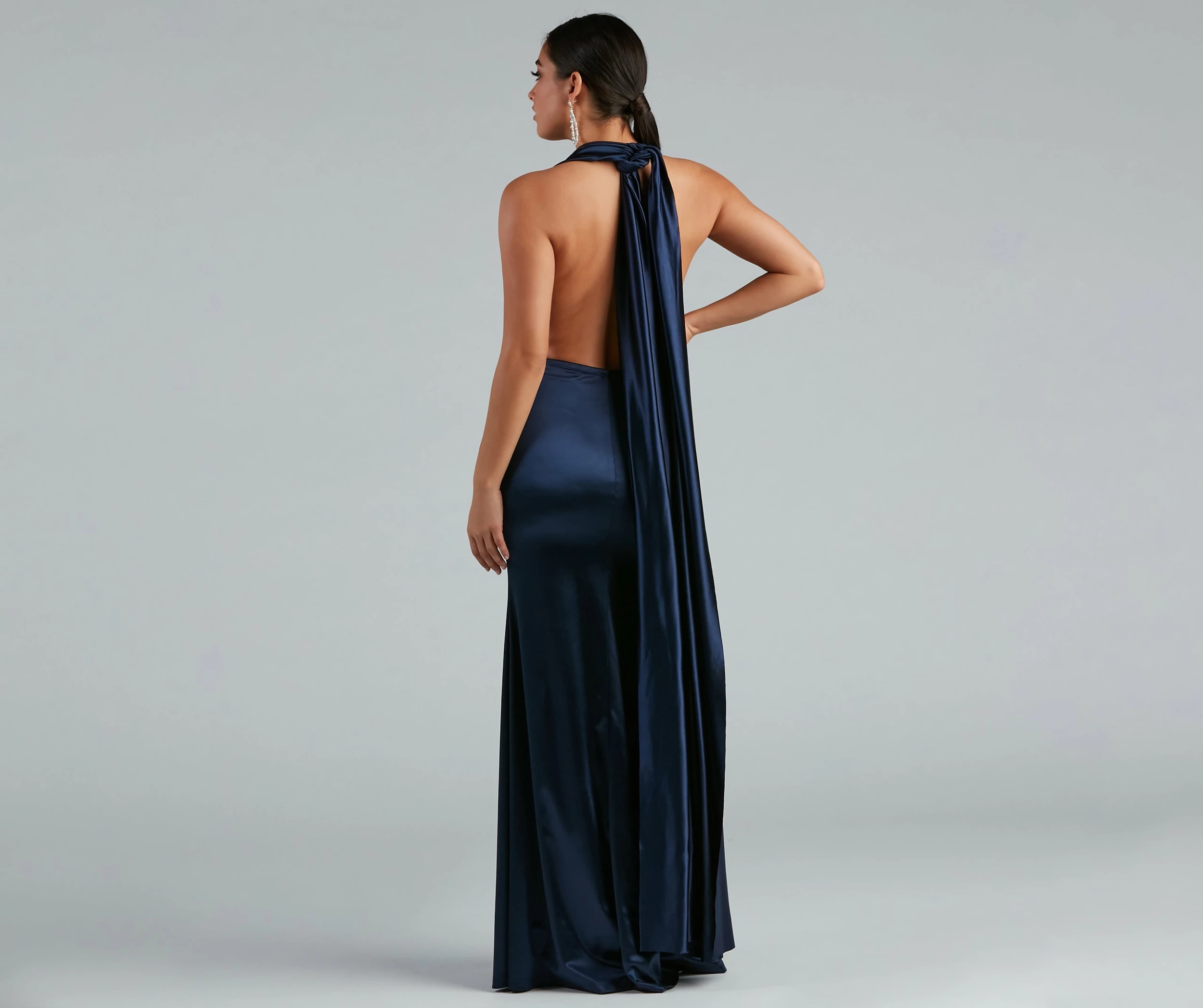 We love a dress that offers glam options, the Johanna dress offers so many ways to dress up for your next special occasion. Johanna features surplus convertible ties at the bodice that can be styled into different necklines that flatter. Her bodice leads to a form of hugging floor-length skirt that is accented with a high side slit. The dress is composed of a stretch satin fabric that offers a moderate stretch. Complete look with a rhinestone choker and