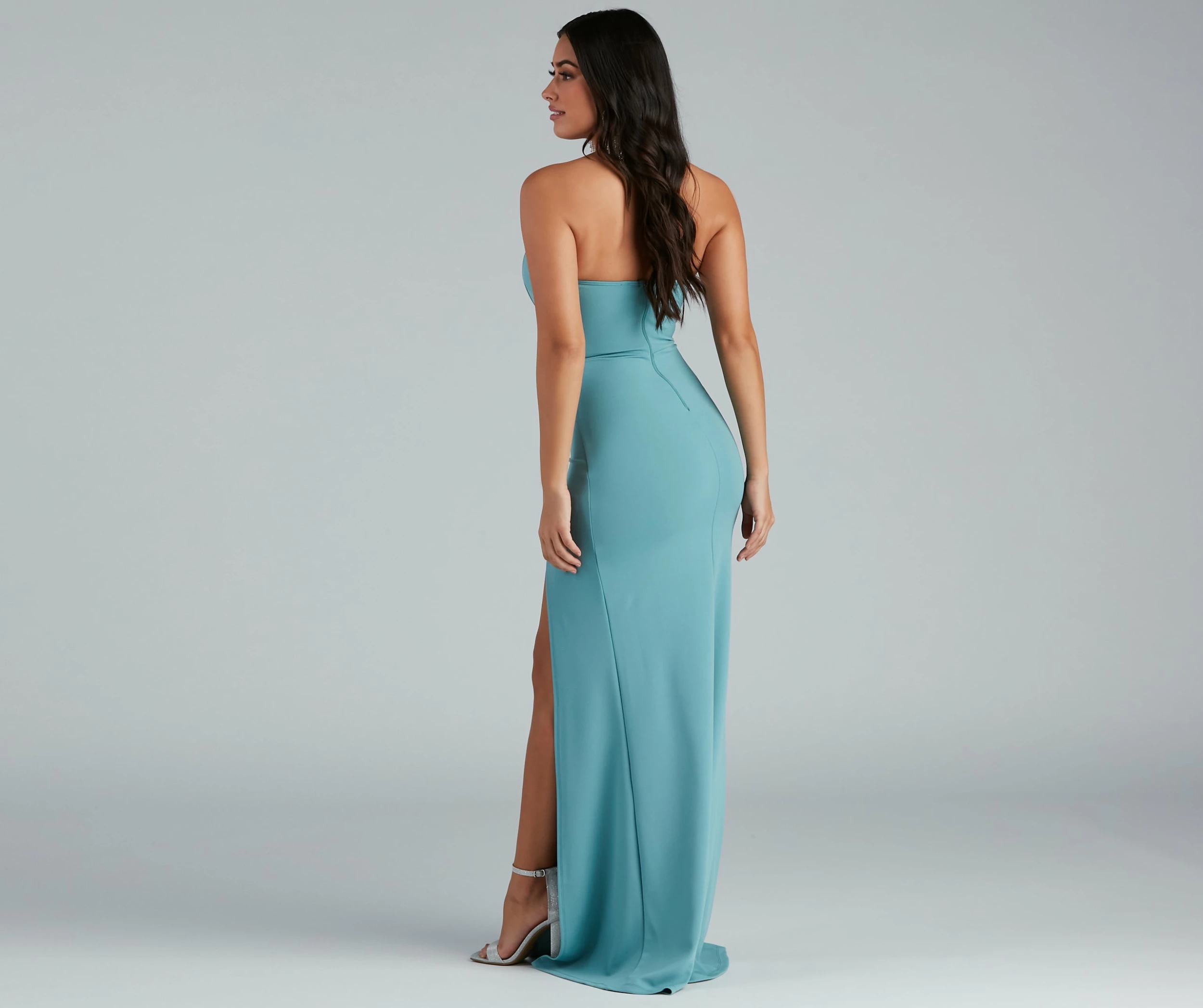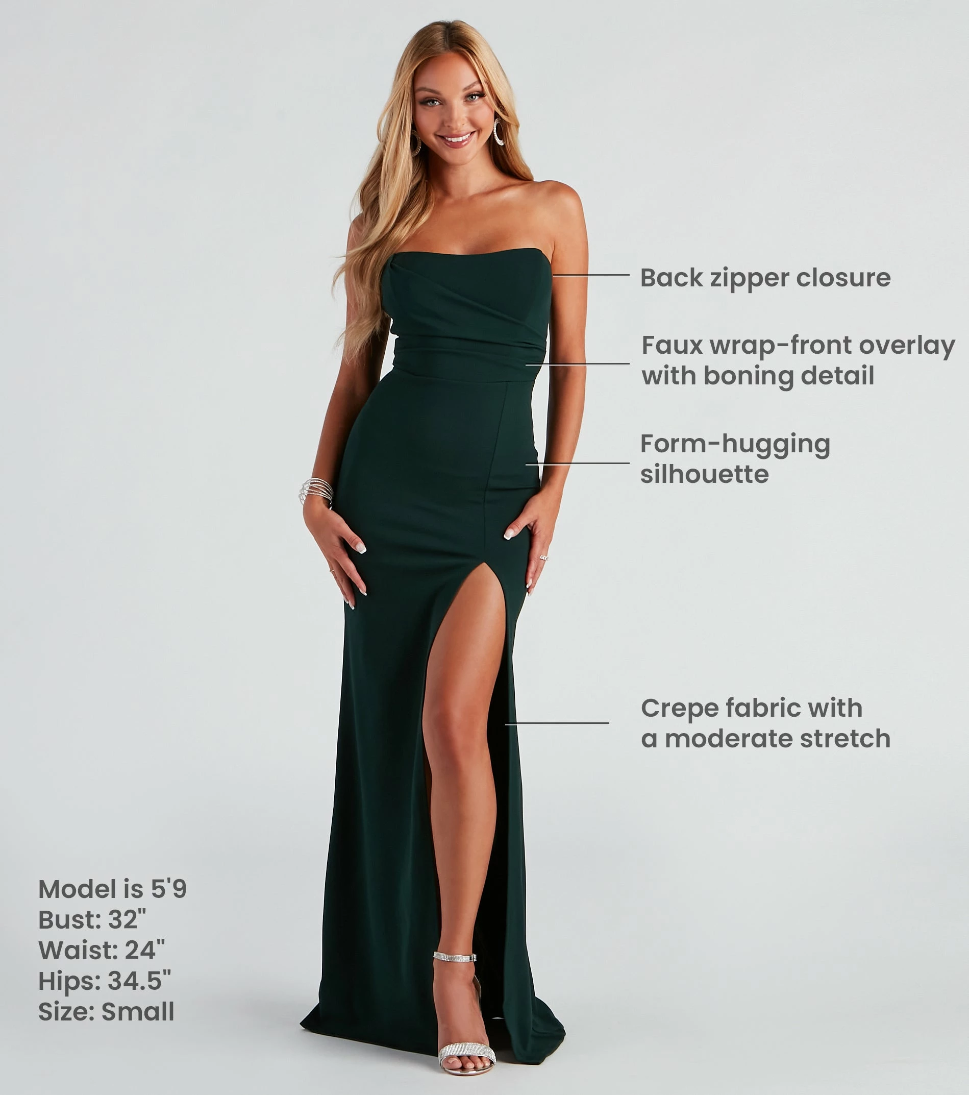The Kaia formal dress will have you looking oh-so-stunning for your next special night out, or any occasion you want to get all chic and stylish! She features a strapless neckline with a faux wrap-front overlay, front boning detail to provide structure, a back zipper closure, and a floor-length, slim fit with a thigh-high front slit. The lightweight crepe fabric offers a moderate stretch for comfortable wear. Complete your look with a gorgeous