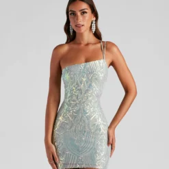Catch the dance floor lights in the Karla sequin party dress and mesmerize the room in her dazzling arora! She features a sleeveless, one-shoulder design with an adjustable spaghetti strap, built-in padding, a bodycon silhouette, and a short hem. Composed of an iridescent sequin mesh-lined fabric with minimal stretch. Style with