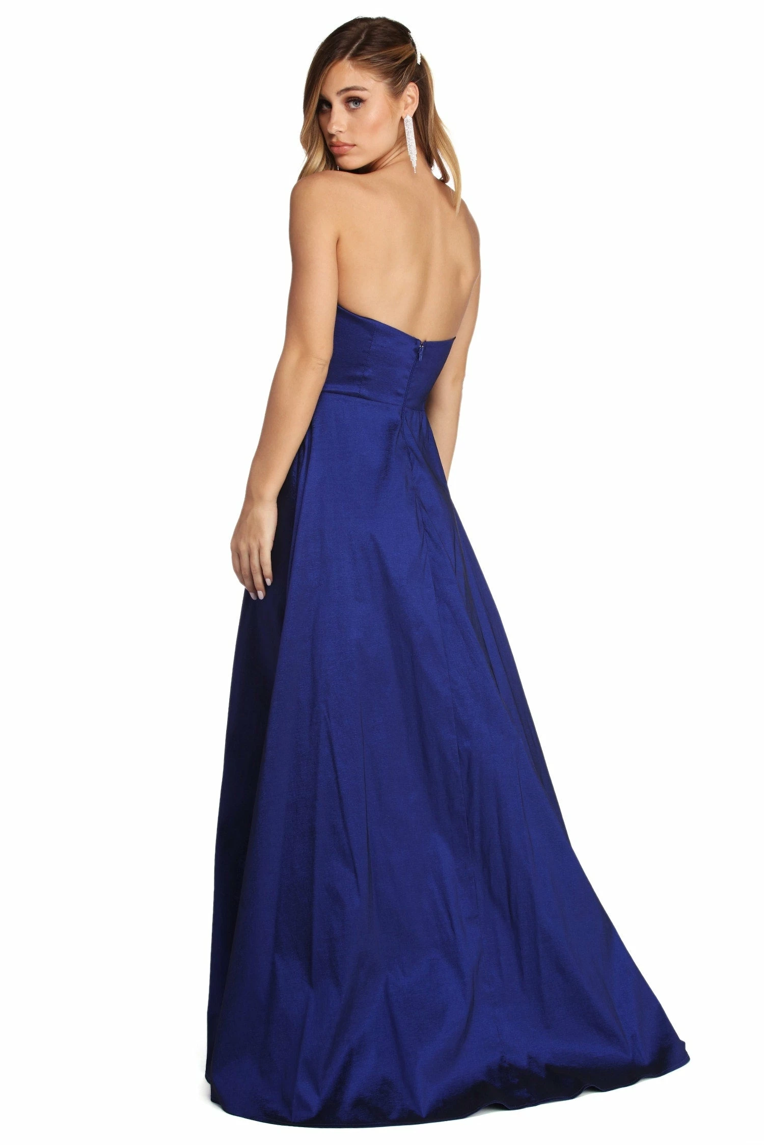 Give elegance a sexy twist in our unforgettable Kayla dress! She features a deep navy blue hue, a sleeveless bodice, a plunging V neckline with origami details on the bodice and an empire waist illusion. Her slim fit bodice leads to an elongating floor length silhouette that is accented with two high side slits. Dress is composed of a taffeta fabric that offers a relaxed fit with a moderate stretch.