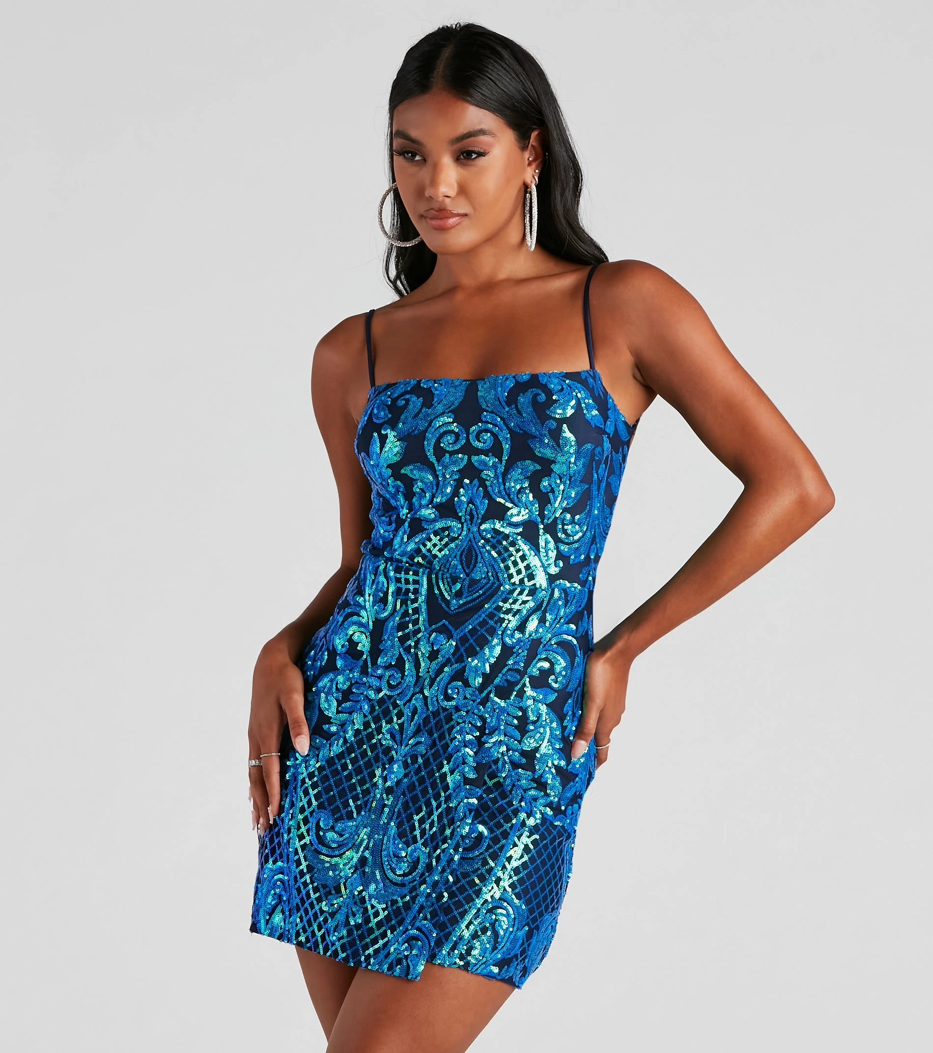 Short and undeniably sweet, the Kaylie party dress showcases major shine on a dazzling sequin scroll pattern sure to capture all the attention! She’s designed in a sleek, sleeveless, square neckline, adjustable spaghetti straps, a lightly padded bust, and a sexy open-back with lattice straps. Her high waist seam leads to a bodycon silhouette and faux wrap-style skirt. The formal dress is composed of a mesh-lined knit fabric with minimal stretch. Complete your dressy look in statement platform