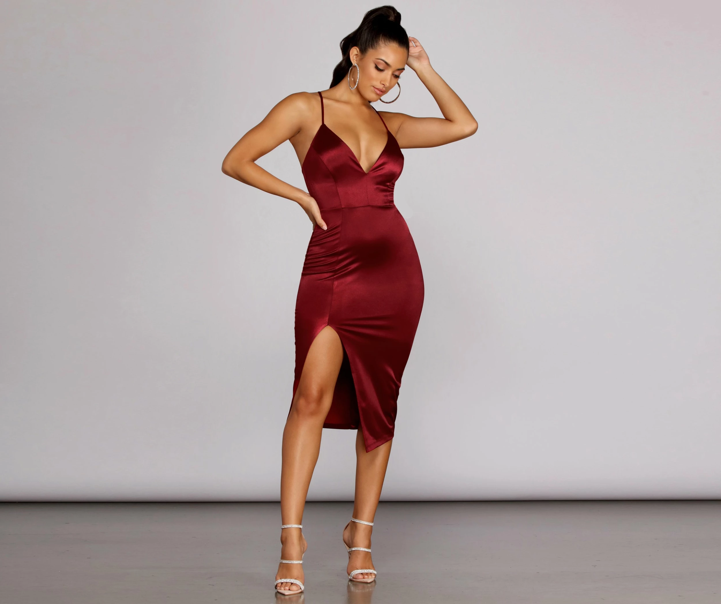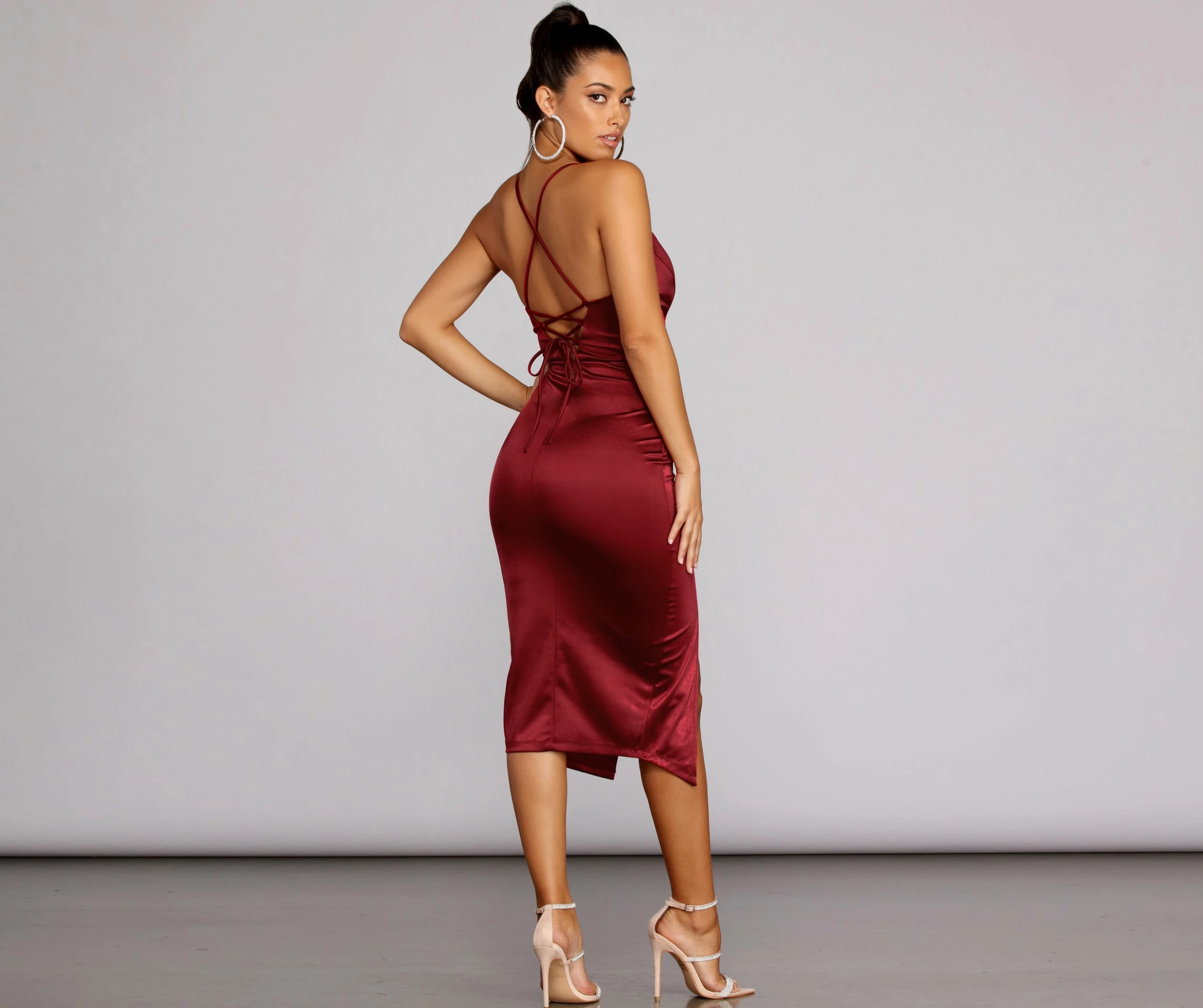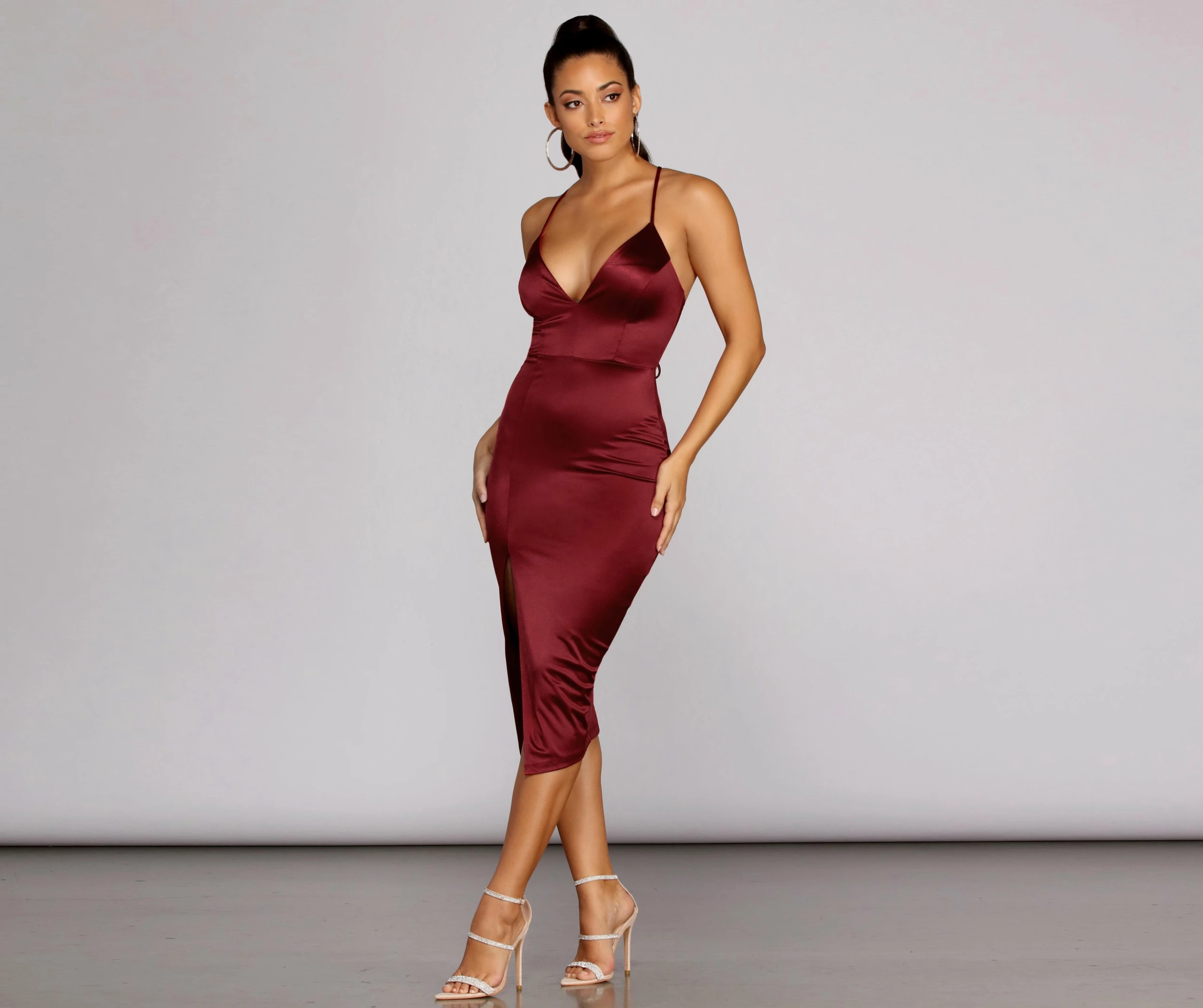 Lace-up in luxe satin as you make a captivating entrance in our Kenzie dress! She features a sleeveless bodice, a plunging V-neckline with padded cups, princess seams, and narrow straps that lead to a lattice back detail. Her slim-fit bodice leads to a midi-length silhouette accented with a side slit. The dress is composed of a stretchy satin fabric that offers a form-hugging fit with a moderate stretch. Includes a lower back zipper closure. Complete look with heels and a