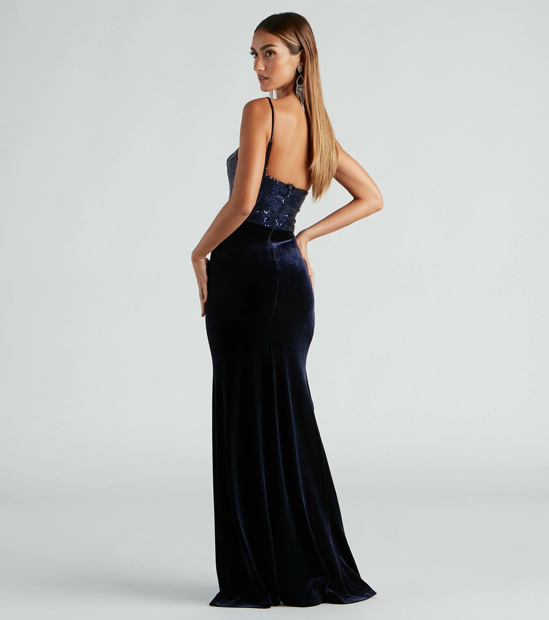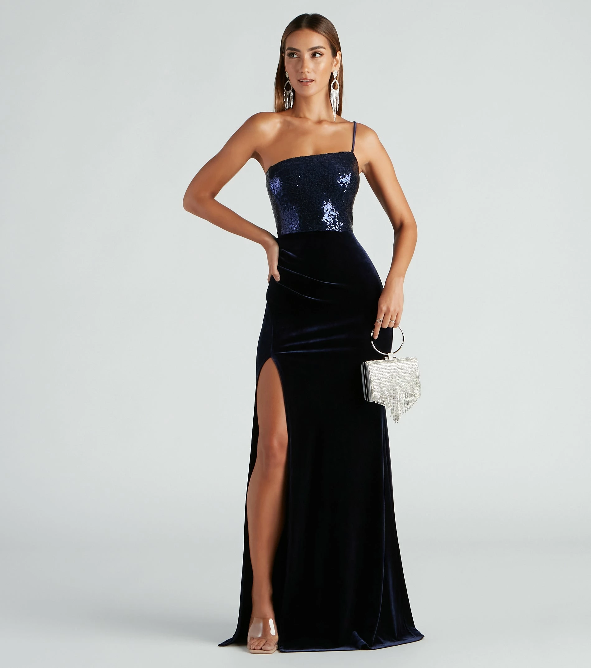 Showcase a luxe look with a stunning sparkle in the Kira sequin velvet mermaid dress. She features a sleeveless asymmetrical one-shoulder neckline, a single adjustable shoulder strap, and a fitted bodice with all-over sequin embroidery. Her high waist seam leads to a floor-length smooth velvet skirt with ruching at the top and a thigh-high side slit. Style this dress with