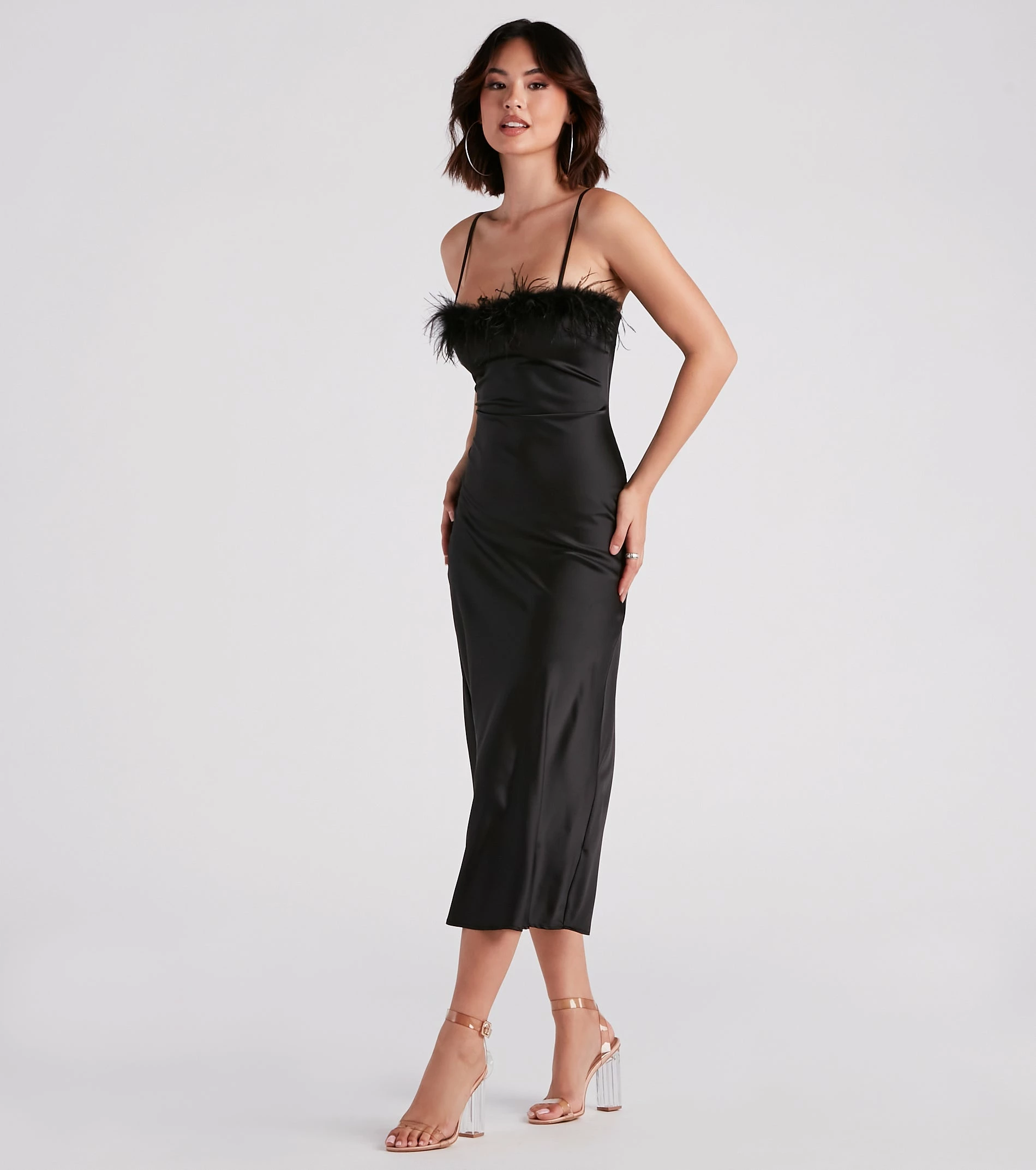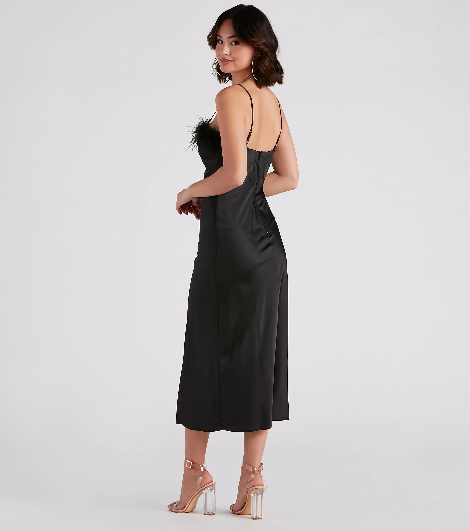 Step out with a dramatic flair in the Lizzy sleek satin slip dress! She features a sleeveless square neckline with a fabulous marabou feather trim, adjustable spaghetti straps for a customized fit, and a flowy, midi-length, A-line silhouette. The smooth lightweight woven satin fabric showcases a luxe sheen. Complete the look with sparkling