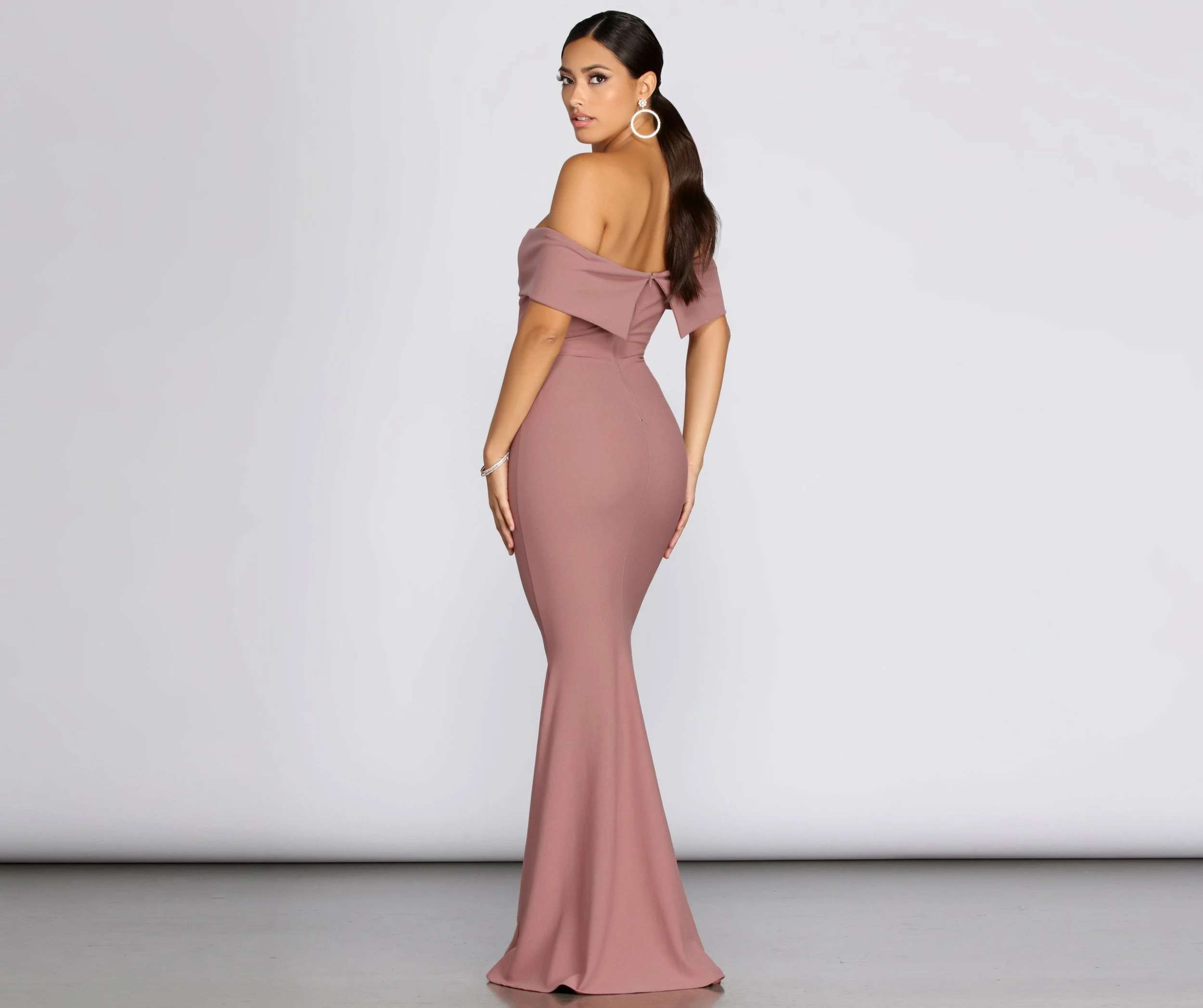 Stun in a formal mermaid dress that radiates elegance and grace. Captivate with a sleek, timeless style for your next special event in a dress that brings glamour. The Maddison formal dress features an off-the-shoulder neckline with a fold-over accent and vertical princess seams at the bust that provides structure. The relaxed fit bodice leads to a curve-hugging mermaid silhouette that flatters curves by creating an hourglass illusion. Complete your elegant formal outfit with a