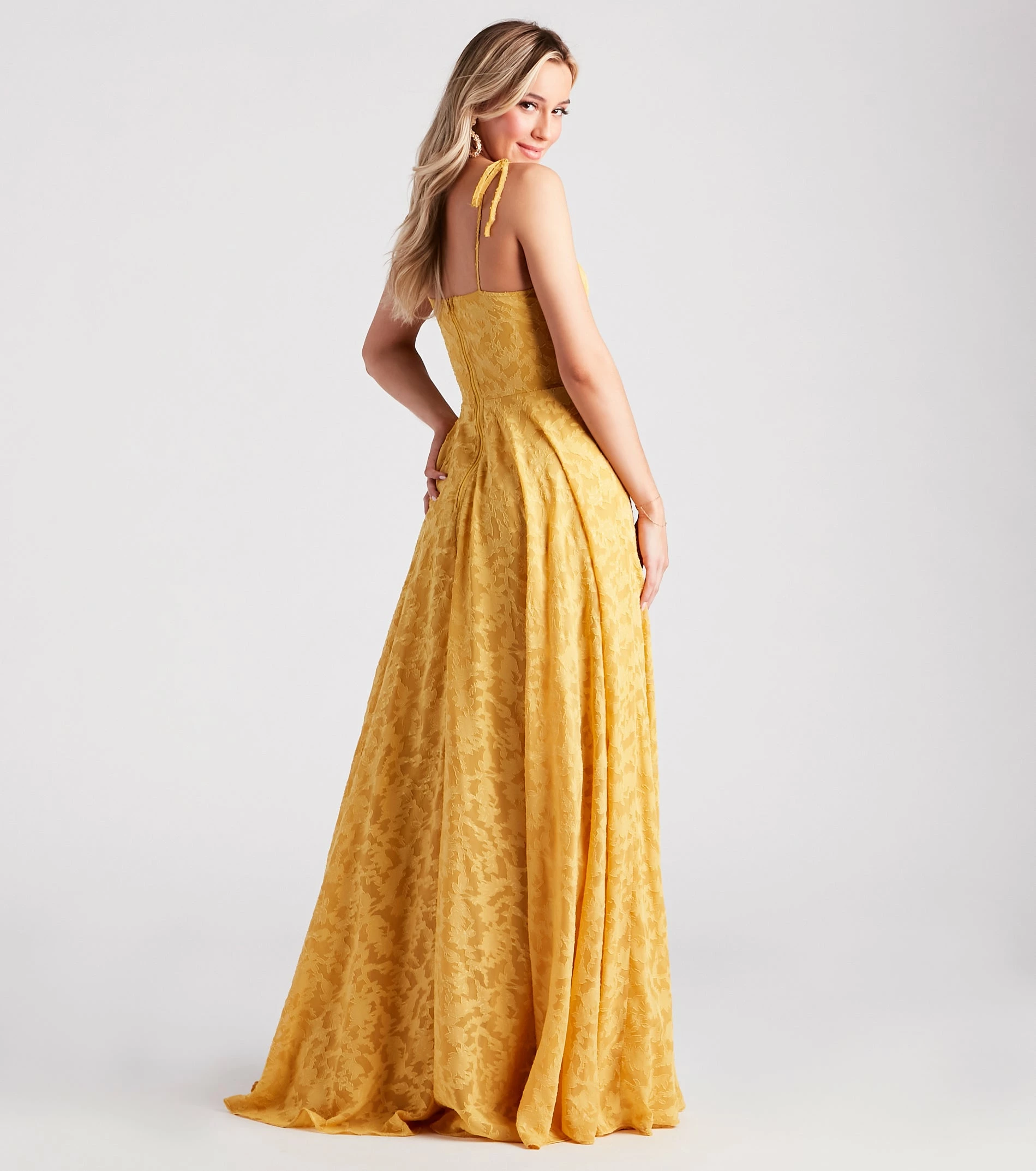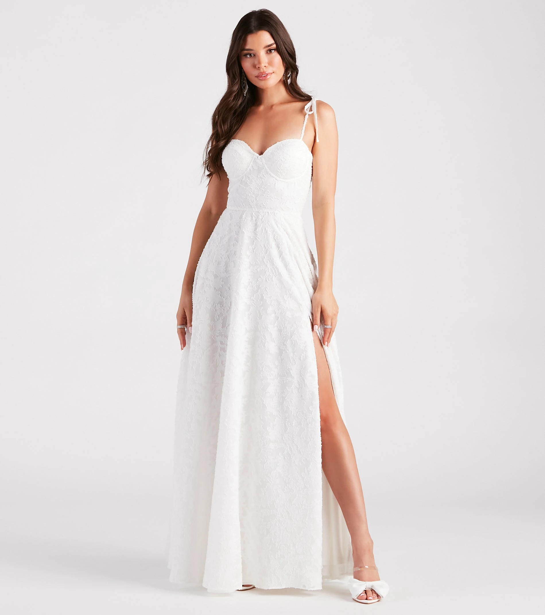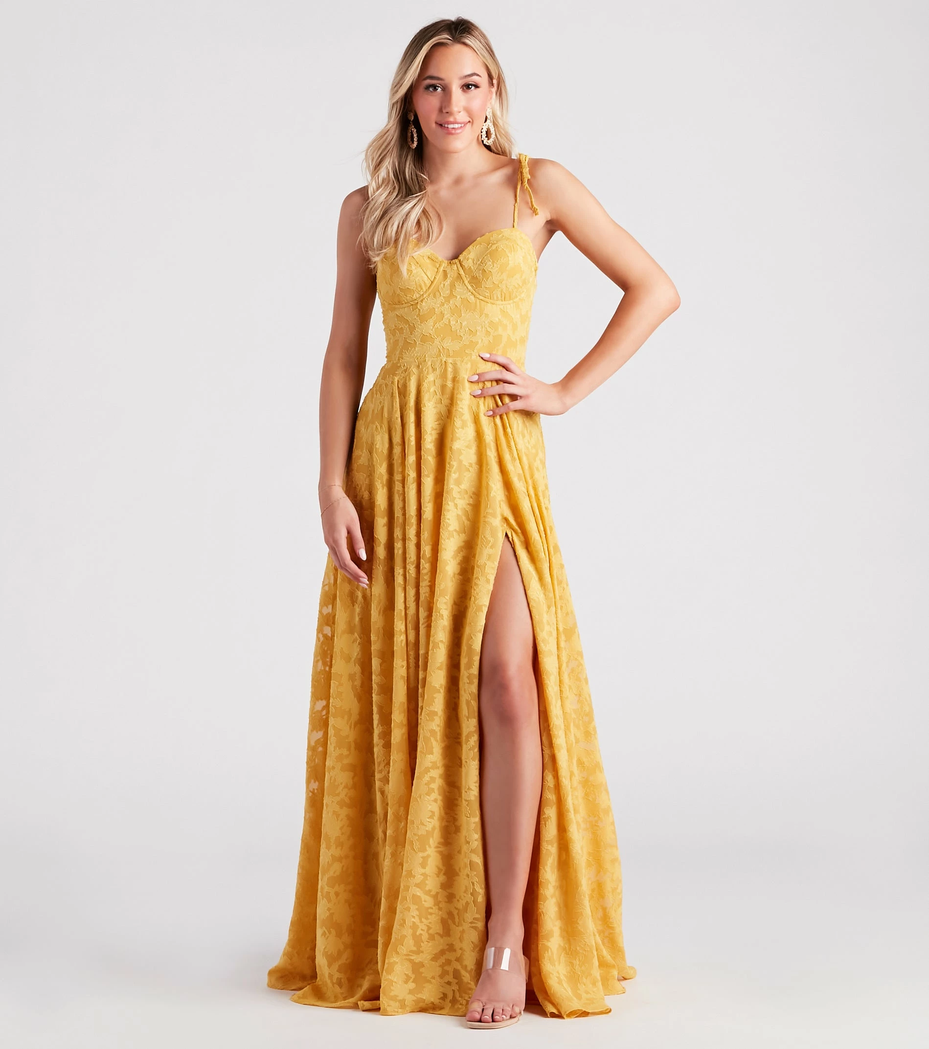 Boho allure with a sprinkle of romance is the hallmark of the Madelyn formal dress perfect for wedding showers and dressy outdoor parties! She features a sleeveless sweetheart neckline, self-tie spaghetti straps for a customizable fit, a padded underwire bust, and a flattering A-line silhouette that creates the high front slit along her floor-sweeping hem. The formal dress is composed of an airy chiffon burnout fabric with a stretchy knit lining. Complete the look with