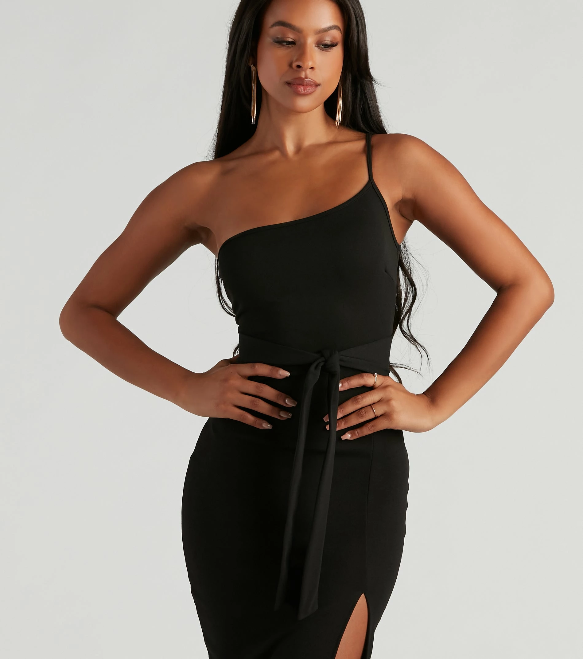 Bring major charm in this one-shoulder midi dress showcasing a sleek and sultry silhouette perfect for flaunting curves! It features a sleeveless bodice with a single spaghetti strap, a tie-front waist belt, and a front-side slit accent on crepe fabric. Complete the look in simple