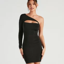 This sultry-chic dress will def make the cut and become a part of your wardrobe! It features an asymmetrical one-shoulder neckline, an alluring cutout above the bust, a single long fitted sleeve, and a mini-length bodycon silhouette. The smooth and lightweight knit fabric offers plenty of stretch so you can dance all night long! Style with sleek hoops and