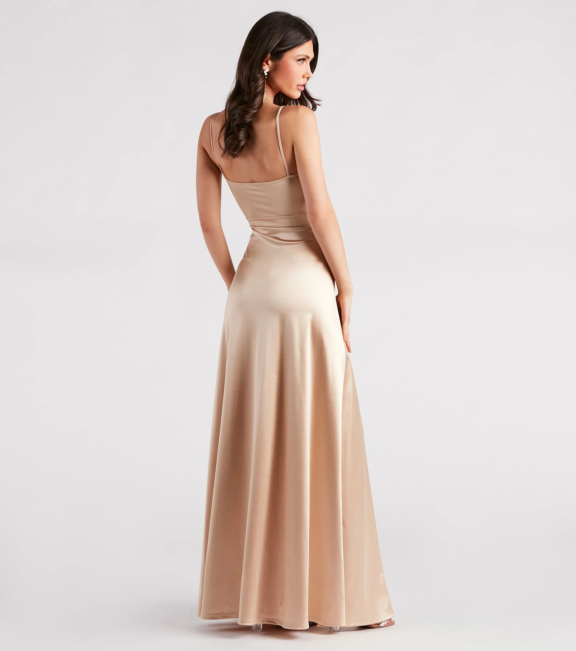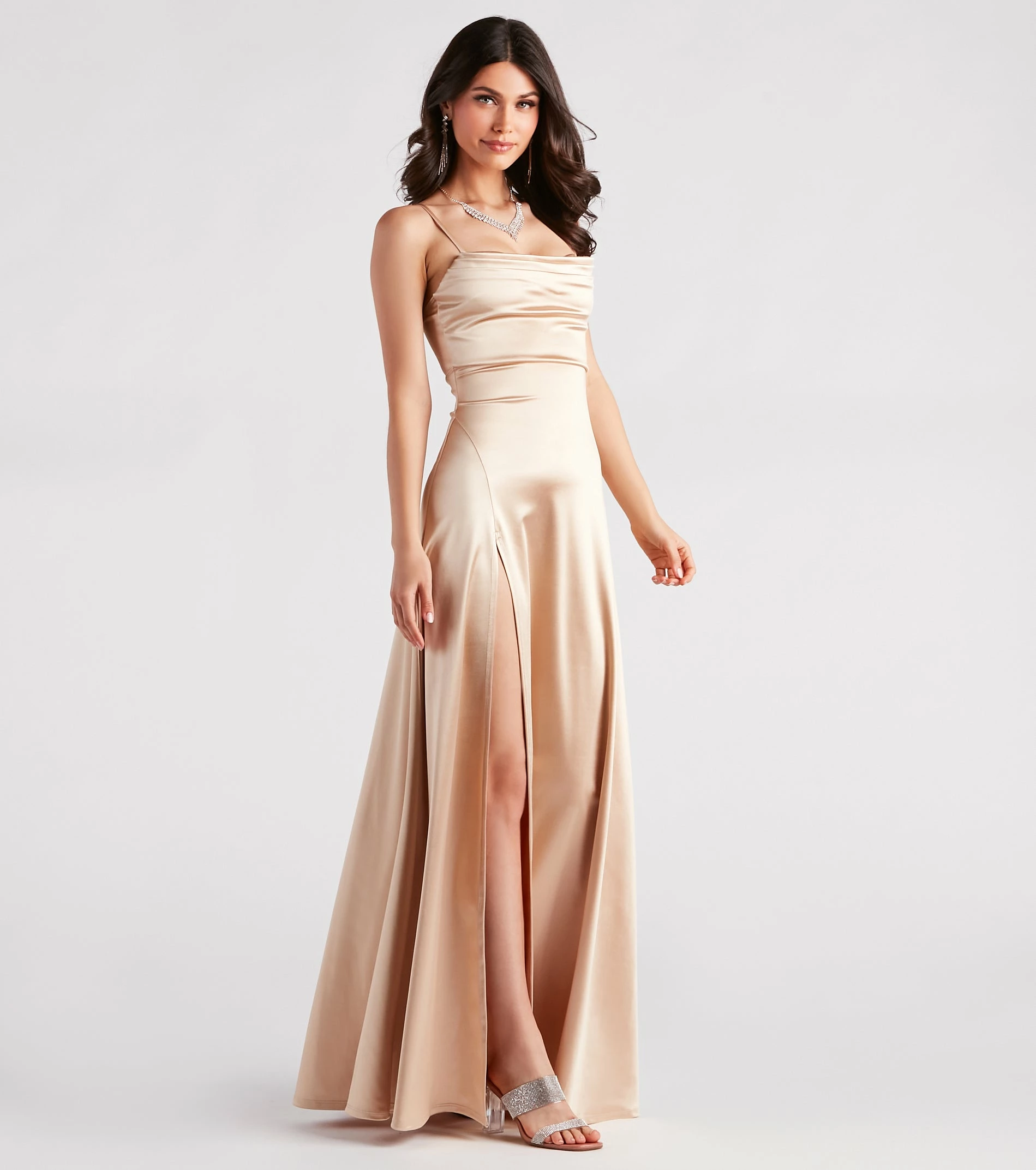 Show some leg. Marissa brings elegance and sultriness to your formal party. She features a classy, sleeveless cowl neck, spaghetti straps, and an empire waist that leads to her floor-length hem with an alluring front slit. The formal dress is composed of a luxe stretch-satin fabric. Complete the look in sparkly
