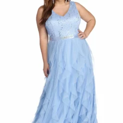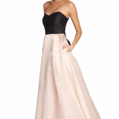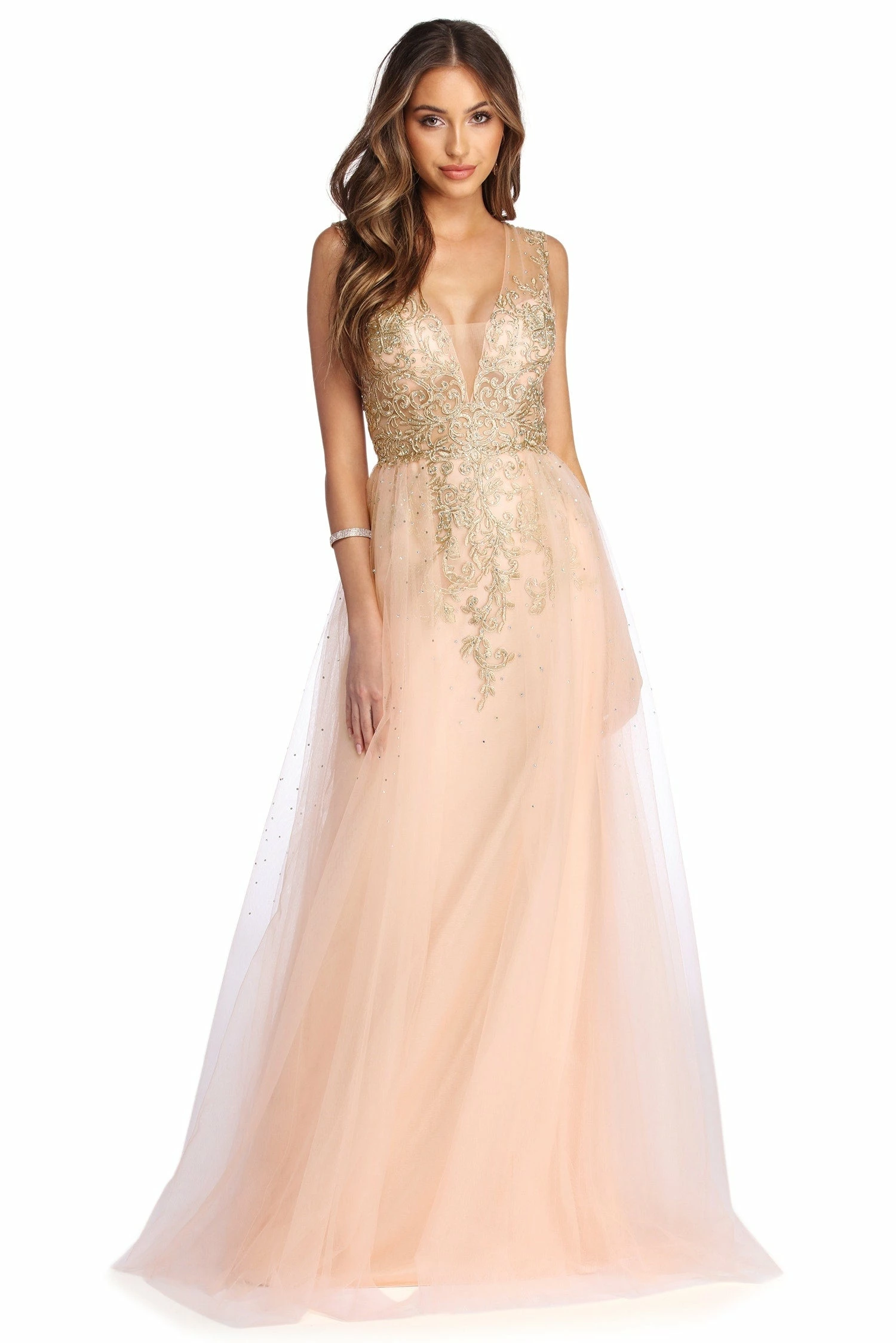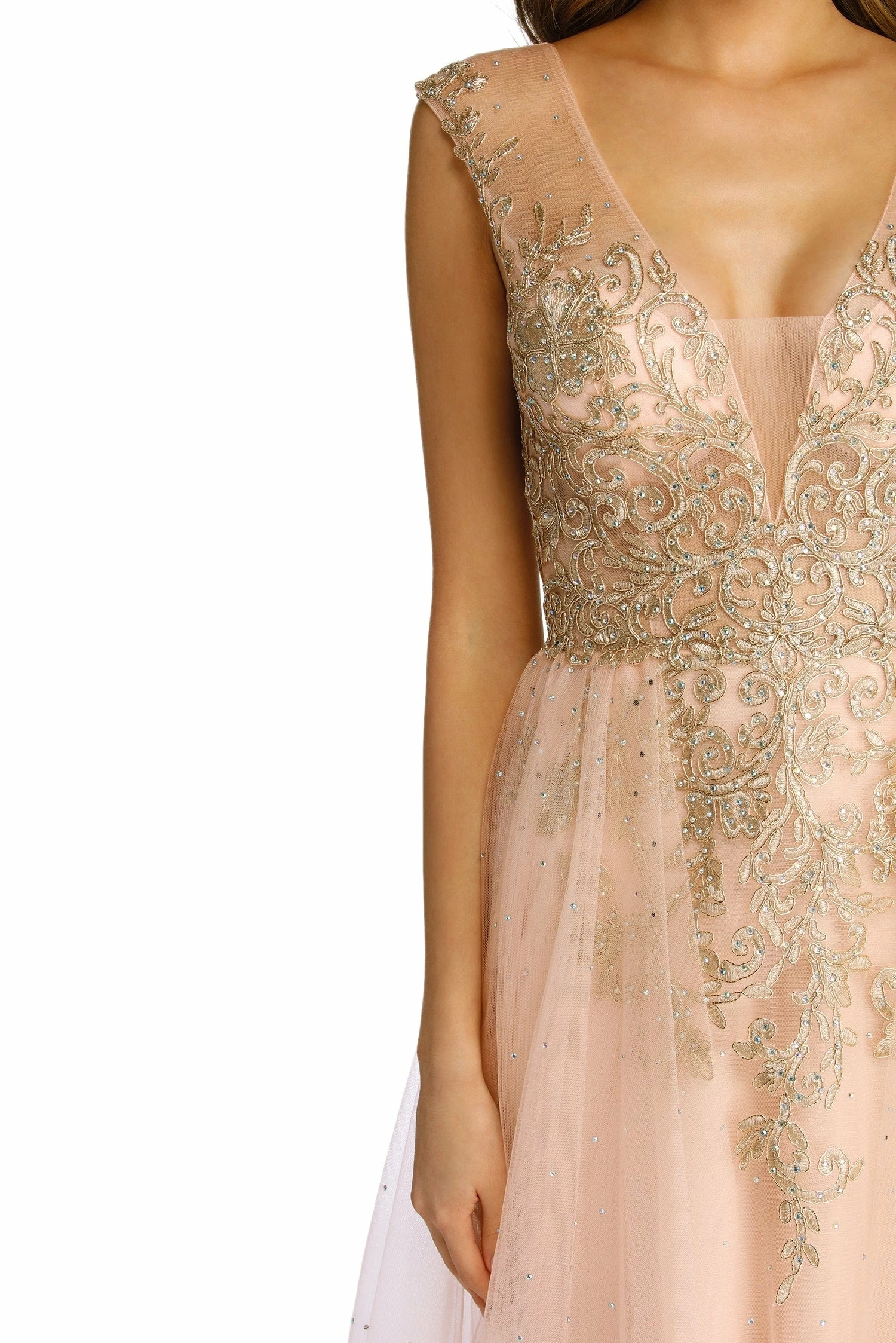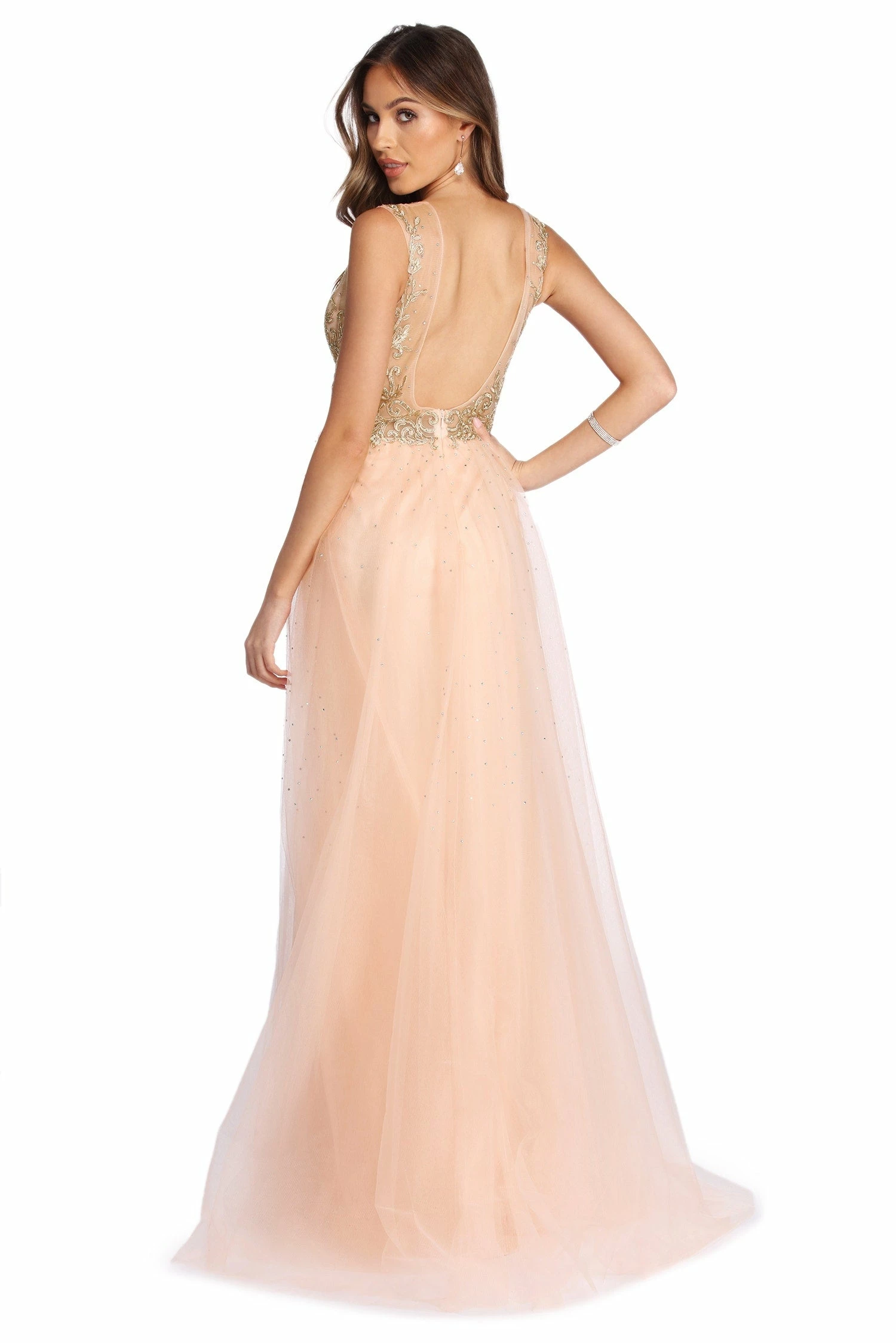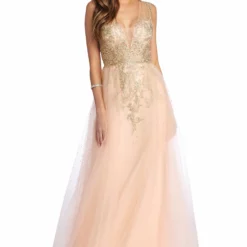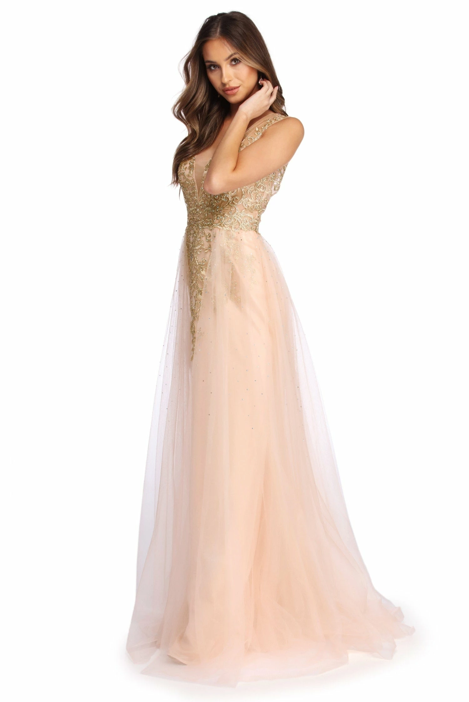 Make an everlasting impression as you radiate beauty in our charming Maryanne pink dress! She features a partially lined bodice, a V neckline with plunging mesh inset, lined padded cups, tank-like straps and a plunging back. Her bodice is adorned with sparkling heat stones and a gold hued baroque-inspired applique design. Her slim fit bodice leads to a voluminous ball gown silhouette that is a accented with sparkling heat stones and complemented with a dramatic train. She is composed of a lined tulle fabric that offers a form hugging fit with minimal stretch.