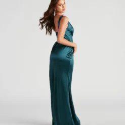 Make a striking impression in a formal dress that radiates elegance from the moment you enter the room! Maude features a sleeveless square neckline, spaghetti straps, and a slim-fit silhouette with a high side slit. Her back features a sexy cutout design accented with a wide bar strap and ruching at the lower back. The dress is composed of a lined stretch satin fabric that offers a form hugging fit with a moderate stretch. Complete your formal outfit with