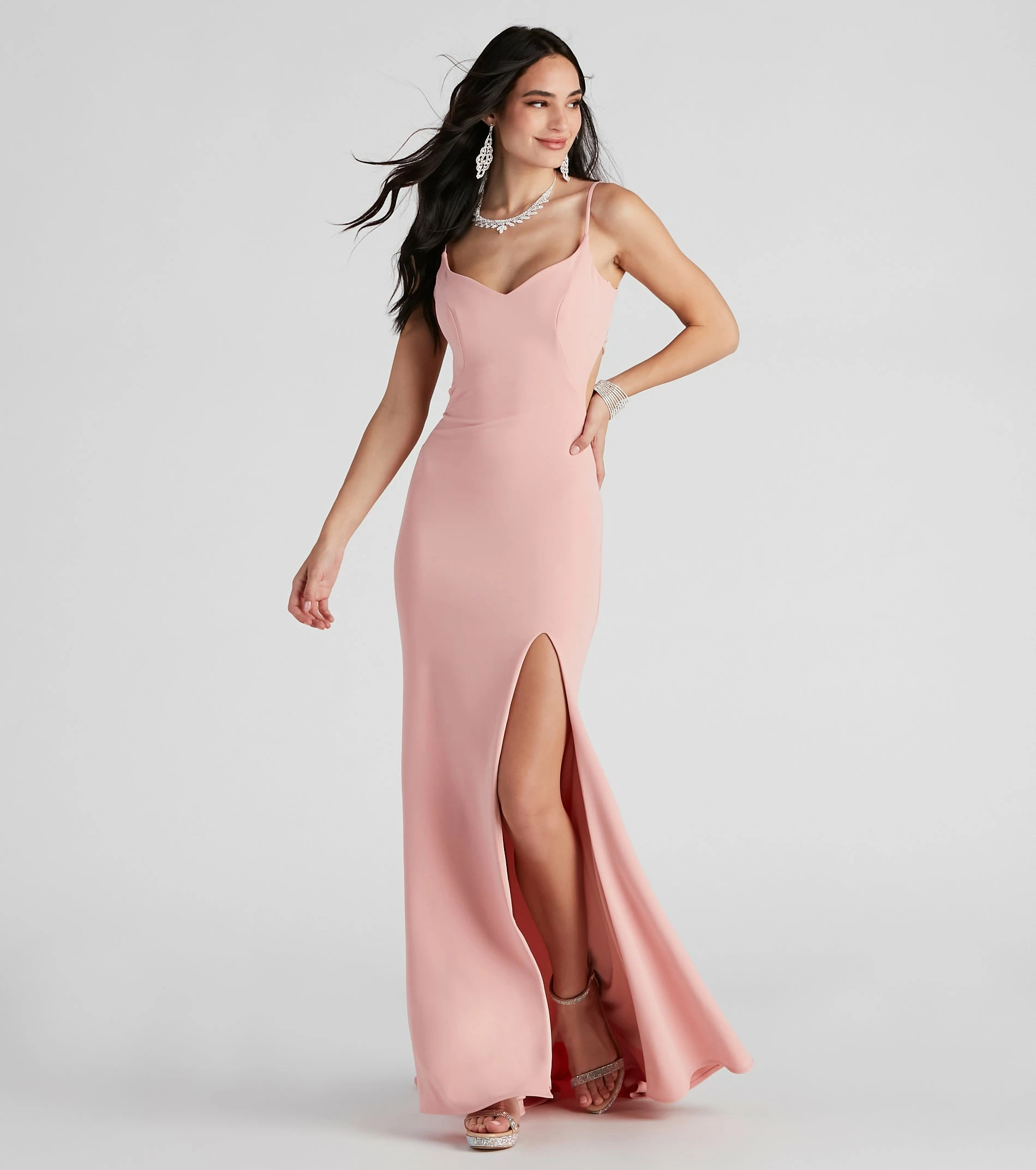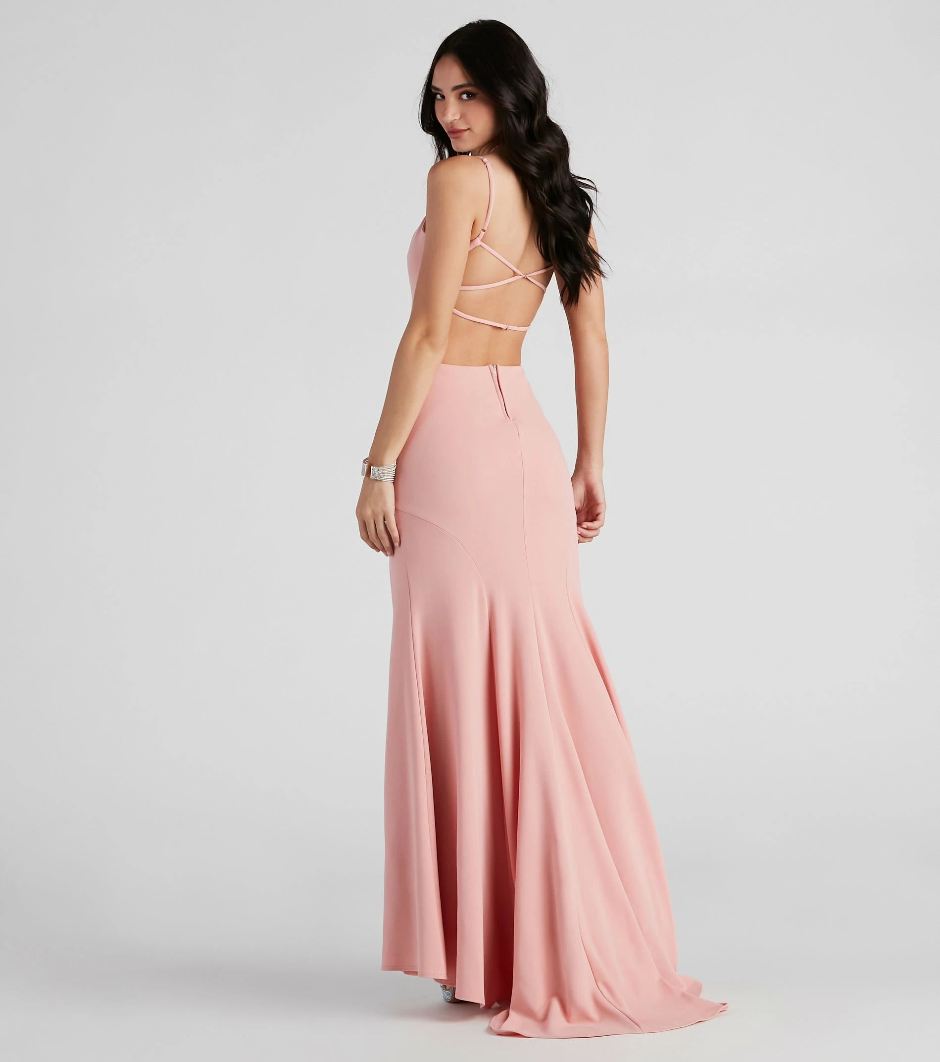 Make an enchanting appearance in a formal dress that wows from the moment you enter the room! Maves features a sleeveless V-neckline, adjustable spaghetti straps, a row of criss-cross straps at back, and a sleek bar strap. The slim fit bodice leads to a form hugging mermaid silhouette that is accented with a dramatic high side slit. Complete look with