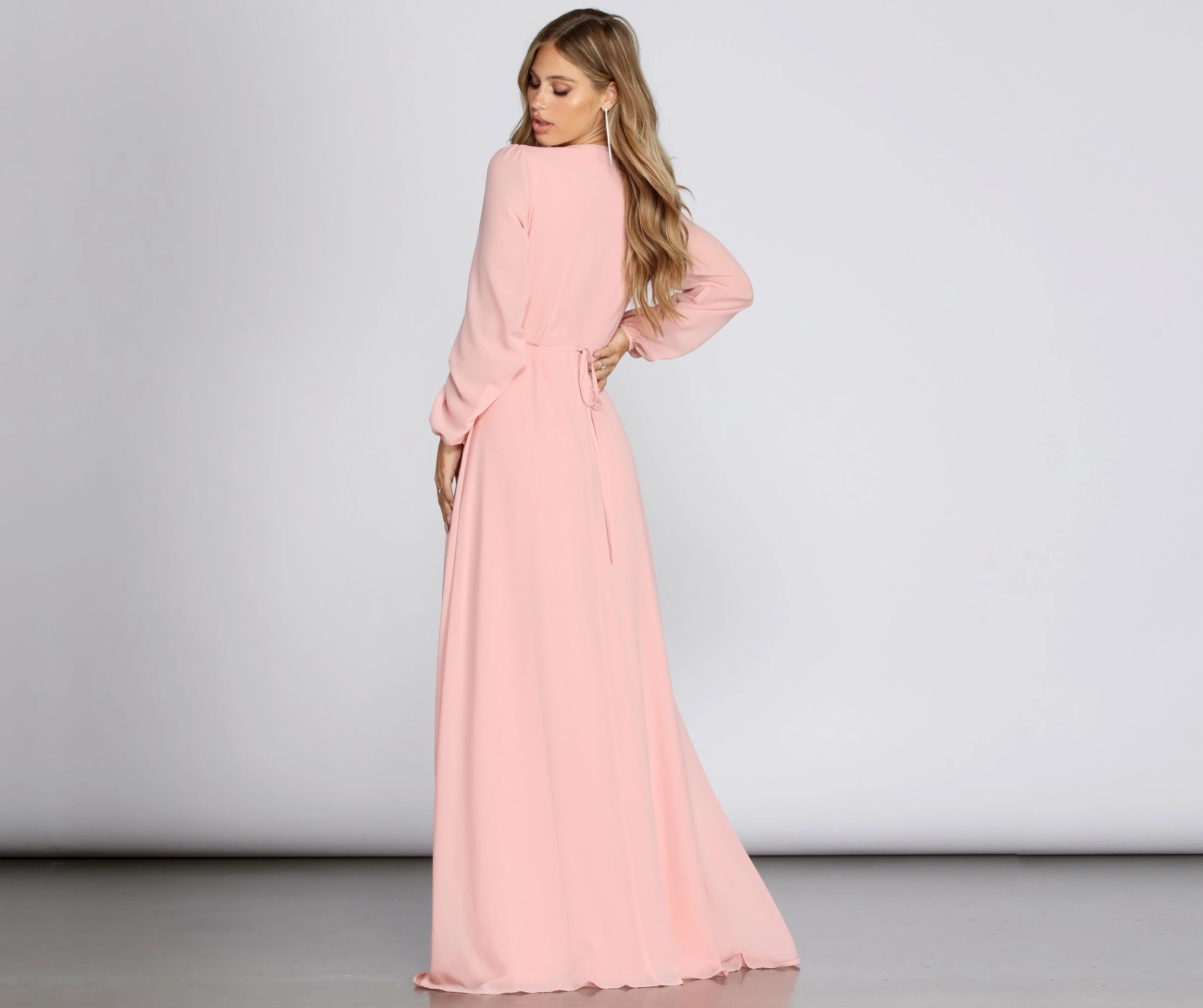 Wrap yourself in luxury with our stunning Mavis gown. She features a deep V neckline, and long sleeves that puff at the wrist. Her bodice meets skirt at mid waist with a wrap design, and is fully lined. Her skirt sweeps the floor and features a high thigh slit at one side. We are obsessed with the modern elegance Mavis offers! She is composed of a chiffon material that offers a lightweight flow with minimal stretch.