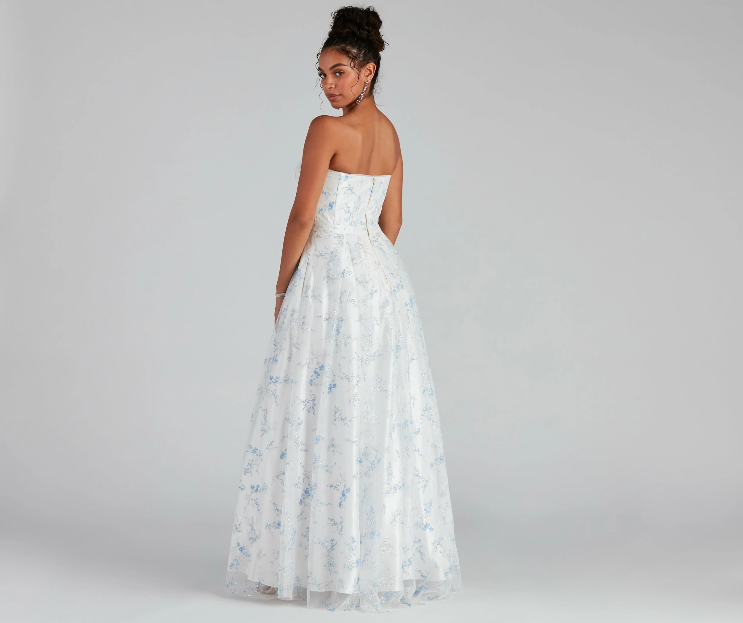 Look like a dream wearing the Mel ball gown for prom! Delicate sparkle shines on her floral embroidered corset a-line silhouette featuring a classy strapless, sweetheart neckline with a built-in padded bust and flexible boning for a structured look. Plus, she has side hidden pockets perfect for keeping your hands warm throughout the night. The ball gown is composed of multi-layers of tulle and woven lining to create a full effect. Complete your prom look with an elegant