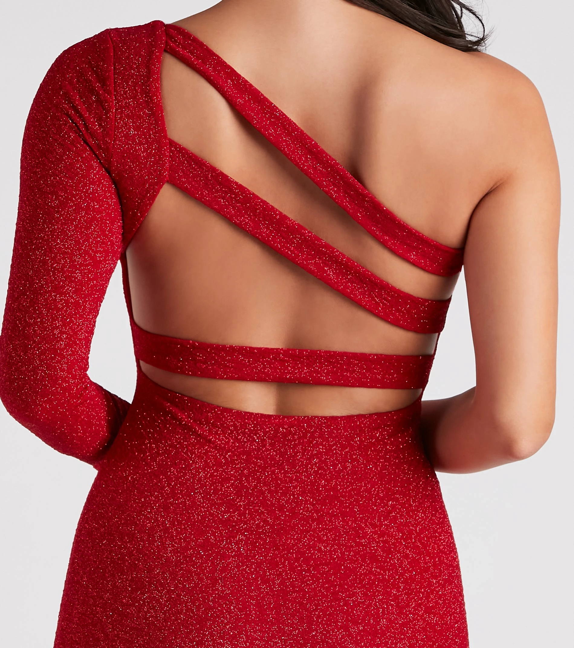 Dance in the moonlight shimmering in this glitter mini dress for a dressy occasion! It features a one-shoulder long sleeve, bodycon silhouette, and a lattice open-back design. Complete the look in a rhinestone