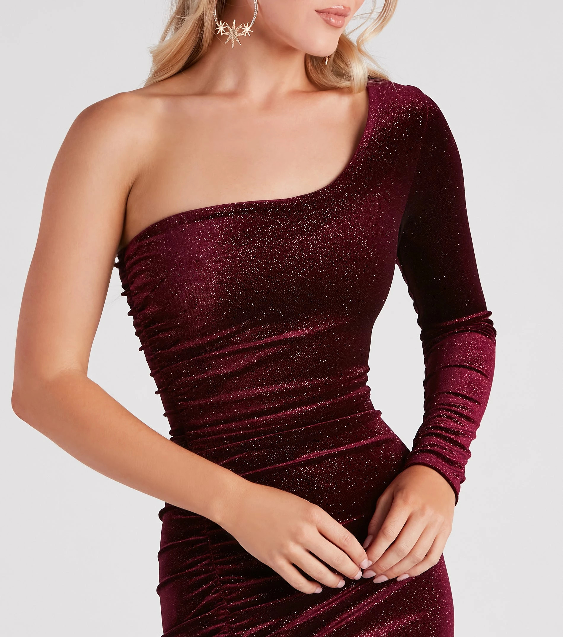 This glitter velvet dress shows all of your good sides! It features a one-shoulder neckline, a single long sleeve, and a ruched side seam accentuating your curves along the form-hugging, short-length hem. Complete the look with a