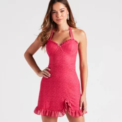 Let your crush know you’ve entered the room in this retro-cute mini dress perfect for getting their attention at parties! It features a sleeveless sweetheart neckline with a flirty ruffle trim, halter straps with tie-back closure, an underwire bust, a bodycon silhouette, and a curved ruffle trim hem. The dress is designed with an adorable ditsy floral print on mesh-lined fabric. Complete the look in
