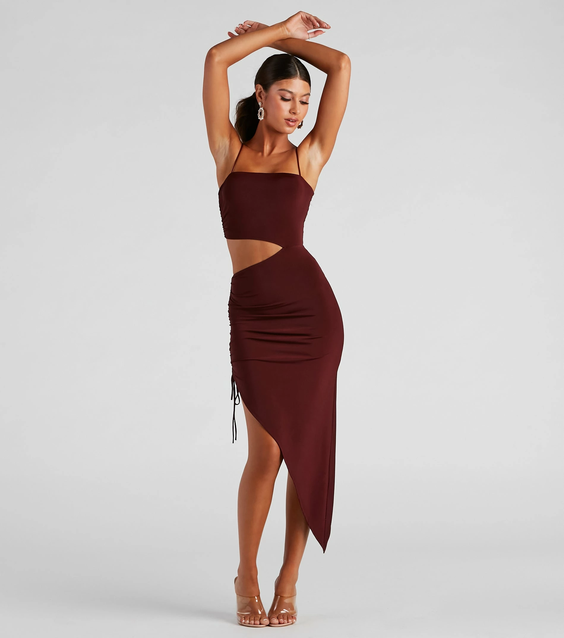 The island may be breathtaking but you’ll also be a sultry view in this sleeveless midi dress featuring a square neck, spaghetti straps, a cutout bodice, asymmetrical hem, and a side ruched drawstring that lets you customize the fit. Complete the look in a straw floppy