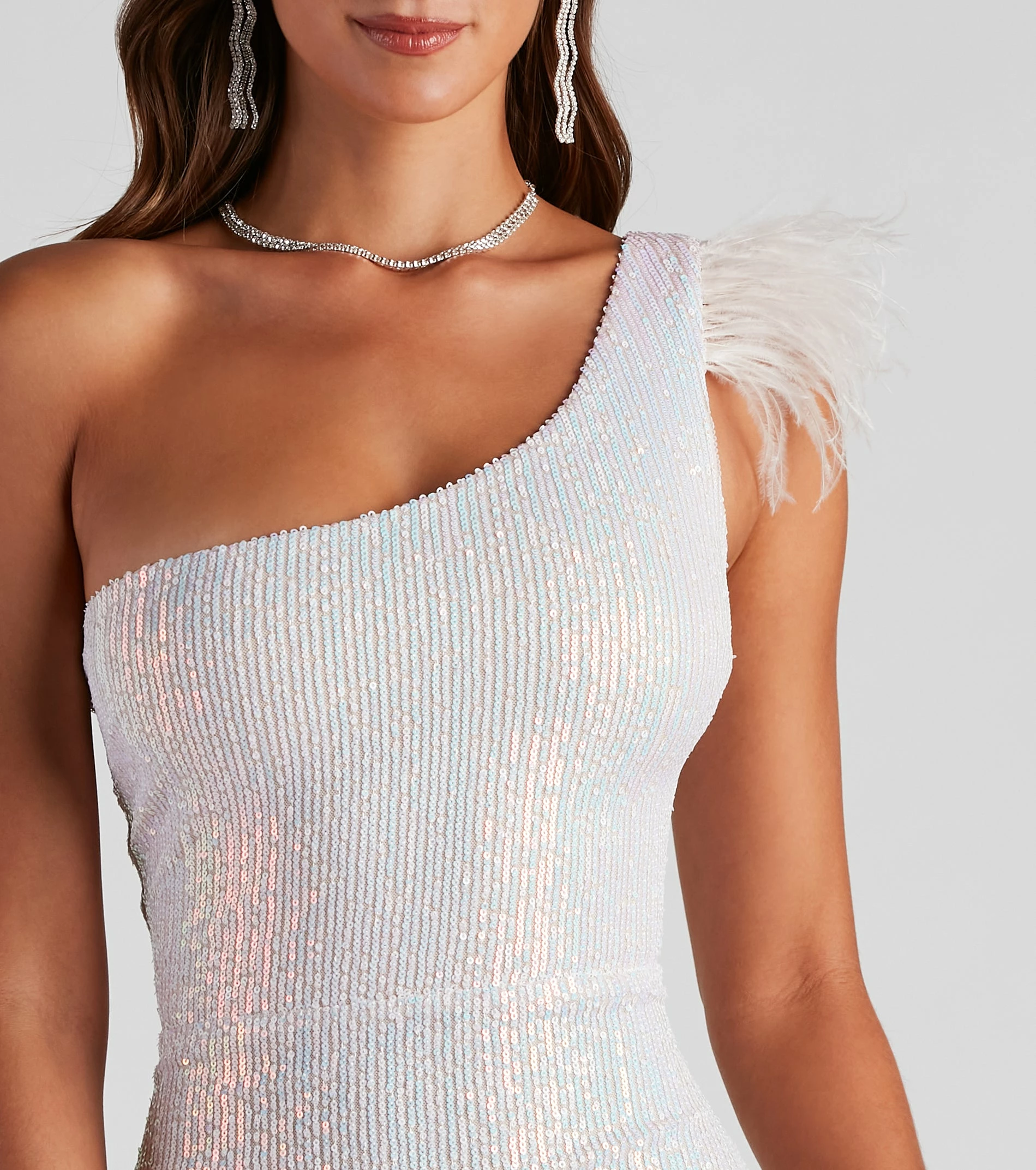 Fab, flirty, and oh-so-fine! Patricia is perfect for all-night dancing at your next dressy event. She features a one-shoulder neckline, a tank-style strap with a feather trim, a high waist seam, and a form-fitting short hem. Her sequin embroidery radiates the light to have you shimmer all night long! Complete the look with a