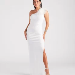 The Patricia formal crepe dress will make a memorable entrance for a bride, graduate, or black-tie guest! She features a sleeveless one-shoulder neckline with a marabou trim shoulder strap, a slim curve-hugging silhouette, a stunning high-side slit, and a long hem. The formal dress is composed of a sleek crepe fabric. Complete the look with