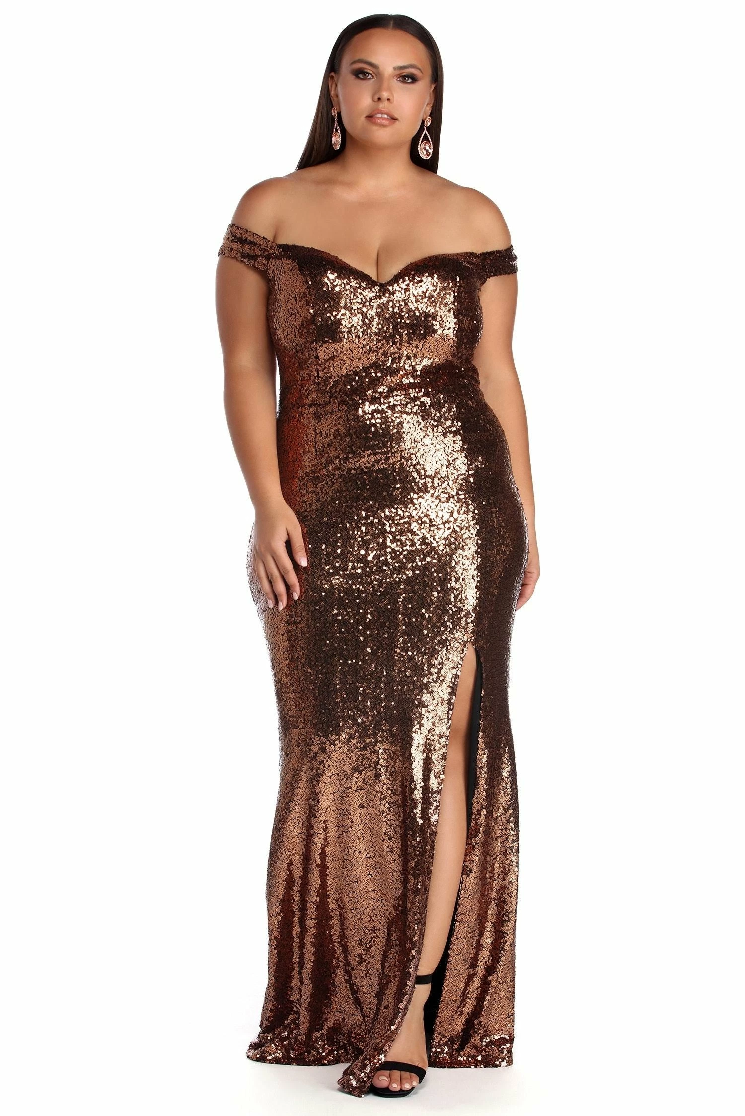 Create the most blissful evening with our glamorous Evanna copper dress! This show stopper of a gown features an off the shoulder neckline, a sweetheart bust with padded cups for added support and a fit and flare silhouette with a high side slit. Her full sequin body helps to highlight your curves in all the right ways while her moderately stretchy fabric allows for flexibility and comfort. She also includes a hidden back zipper.